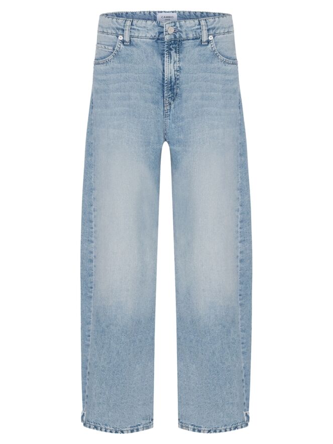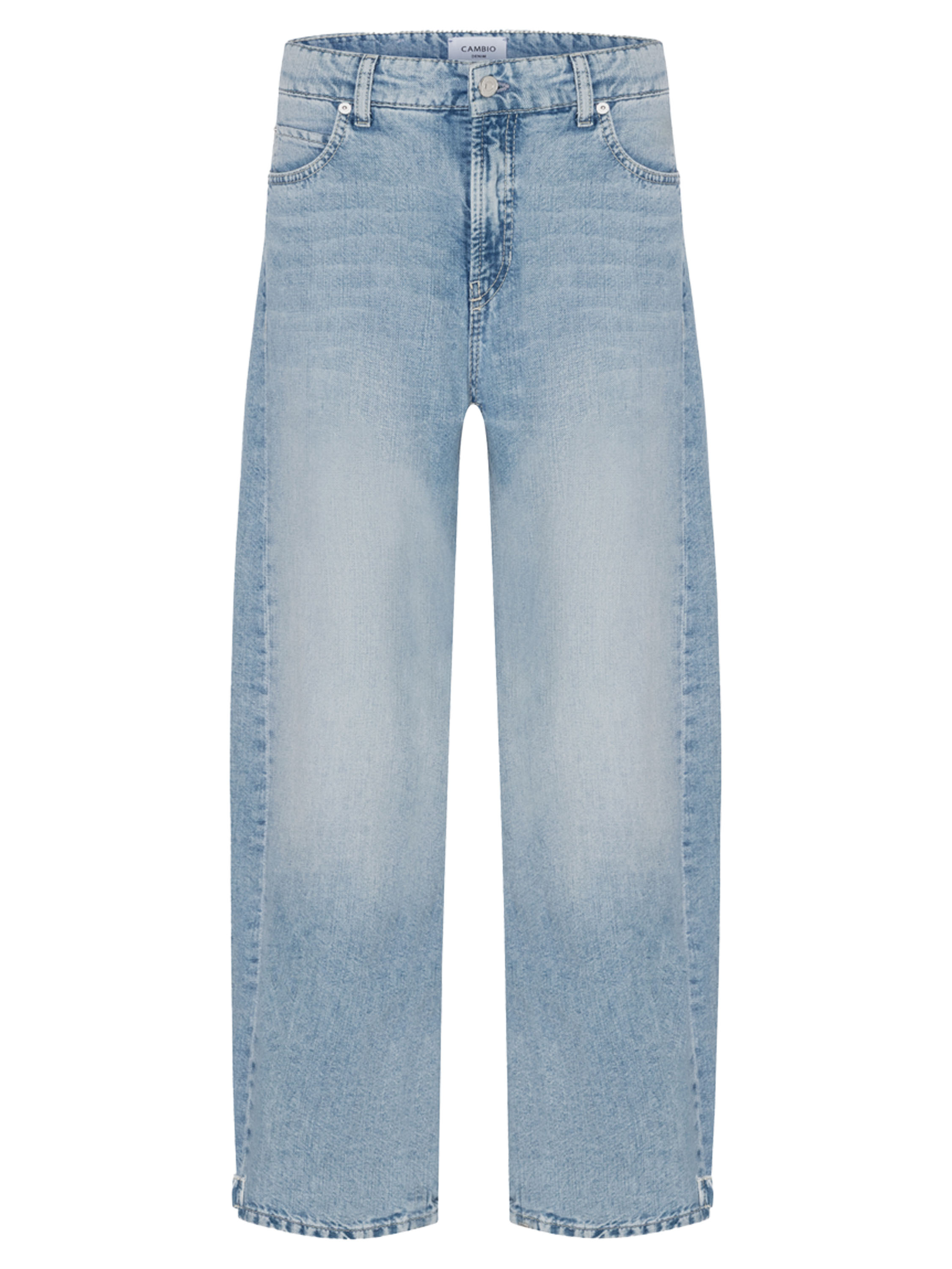 Wijde jeans van Cambio in een lichtblauwe denim tint, uitgevoerd in een klassiek 5-pocket model. Dankzij het linnen in de stofsamenstelling voelt de jeans uitzonderlijk zacht en comfortabel aan. Aan de onderzijde van de pijpen is aan de buitenzijde een korte decoratieve band met drukknoop verwerkt, wat zorgt voor een eigentijds detail. Deze exclusieve designerjeans kan met de hand worden gewassen.