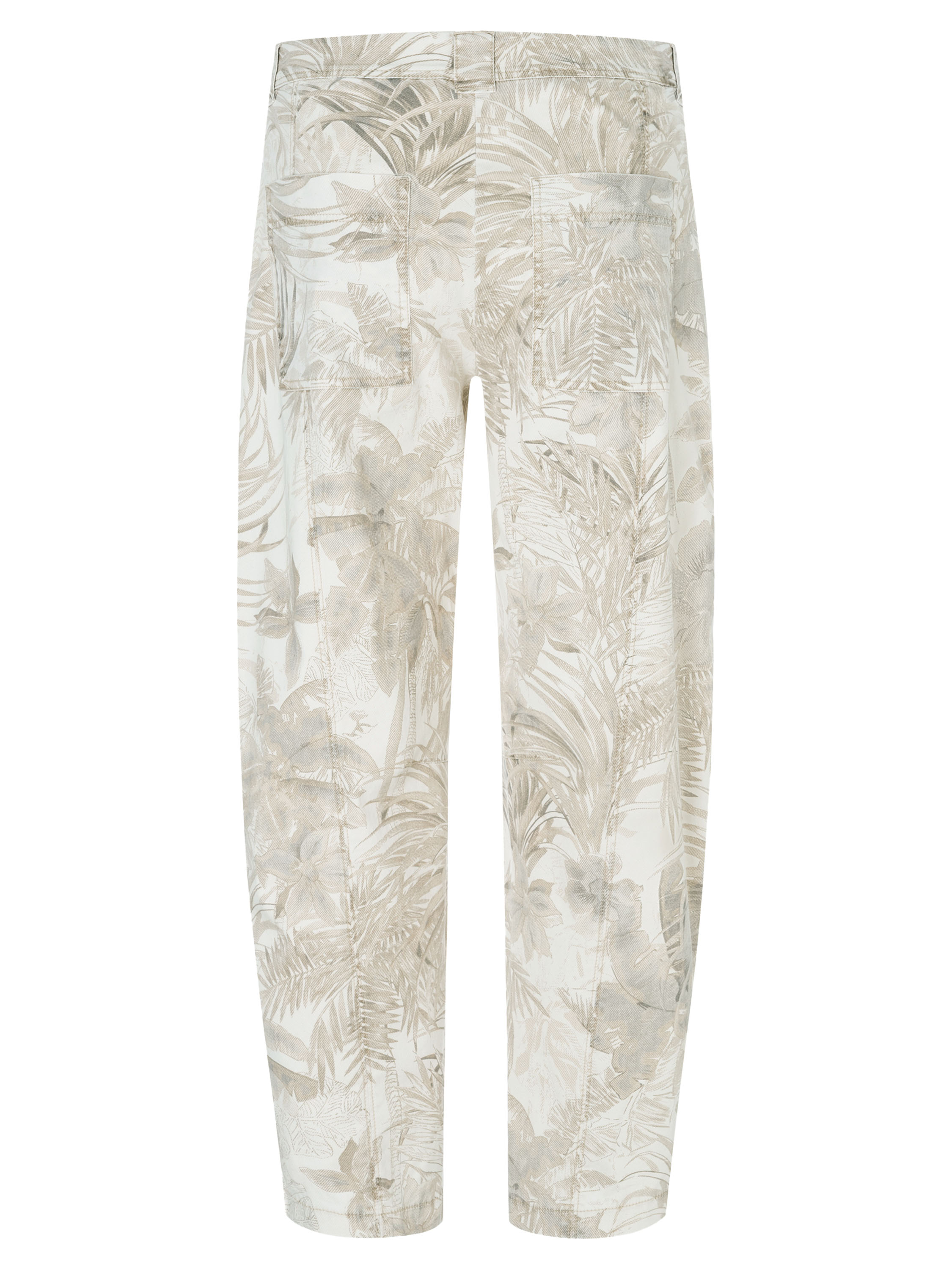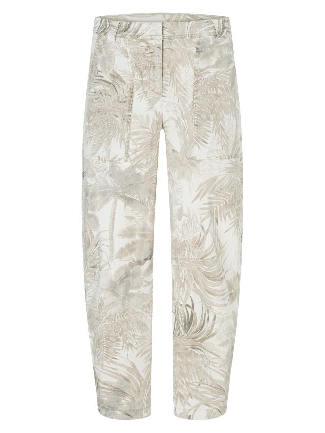 Broek van Cambio in een jungleprint met bladeren in meerdere bruintinten op een beige achtergrond. De broek is voorzien van steekzakken en kan op 30 graden worden gewassen.