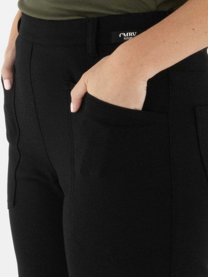 Een broek van Cambio in de kleur zwart. De broek is uitgevoerd in een 5-pocketmodel. Ter hoogte van de knieën bevindt zich een coupenaad. Deze broek mag met de hand worden gewassen.
