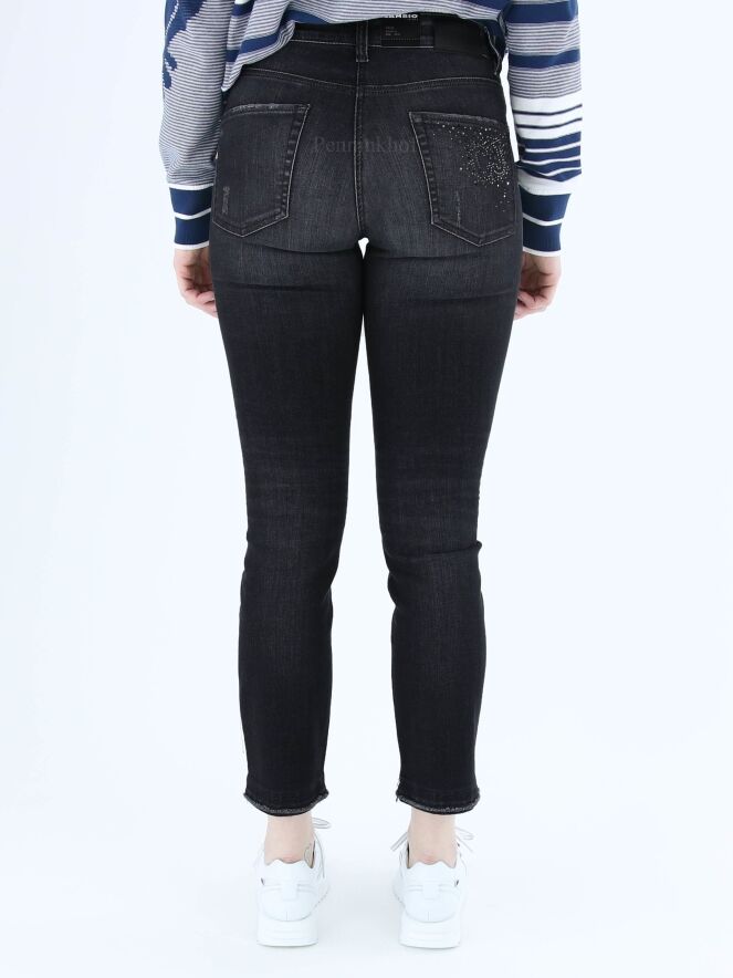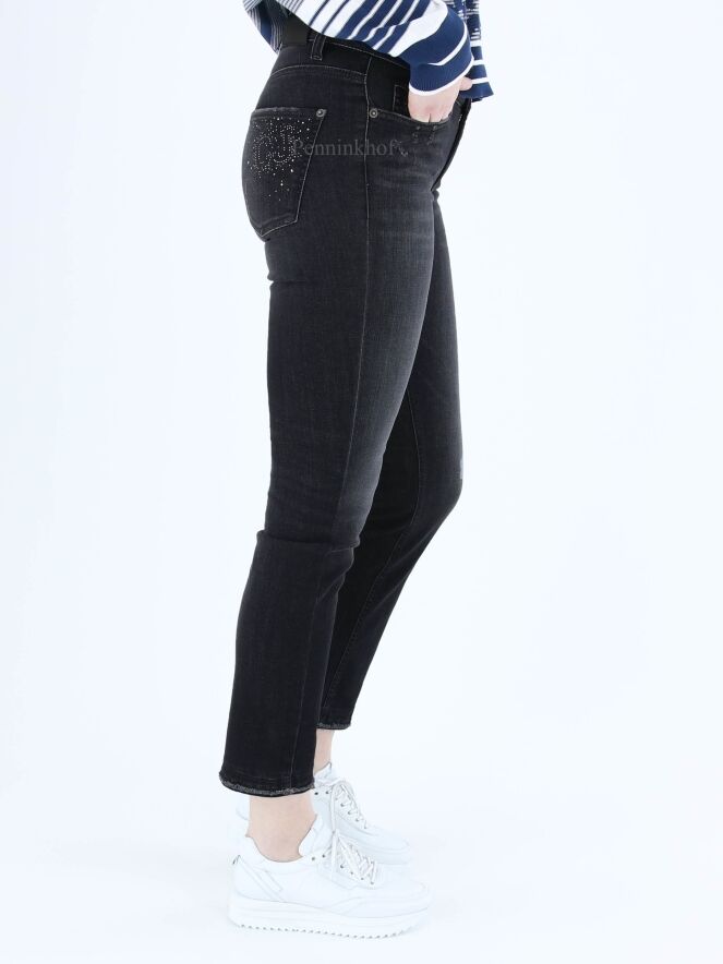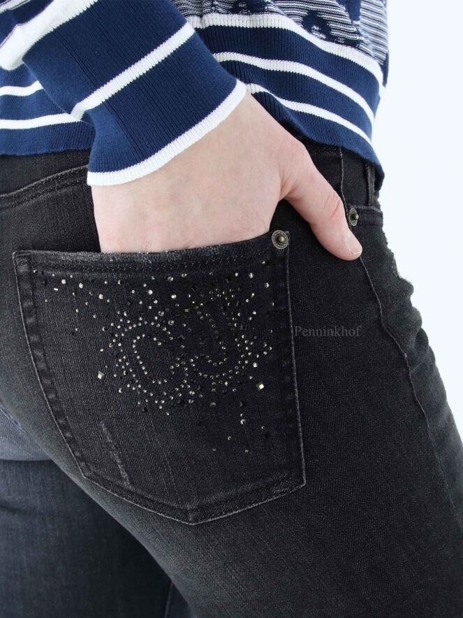 Een gewassen jeans van Cambio in een antraciet kleur. De jeans is in een 5 pocket model. Op de rechter achterzak is een patroon van strassteentjes. Deze jeans mag op 30 graden worden gewassen.