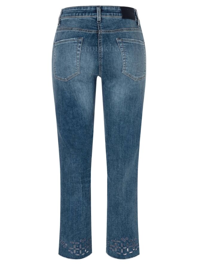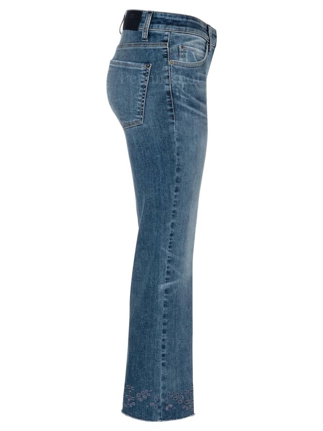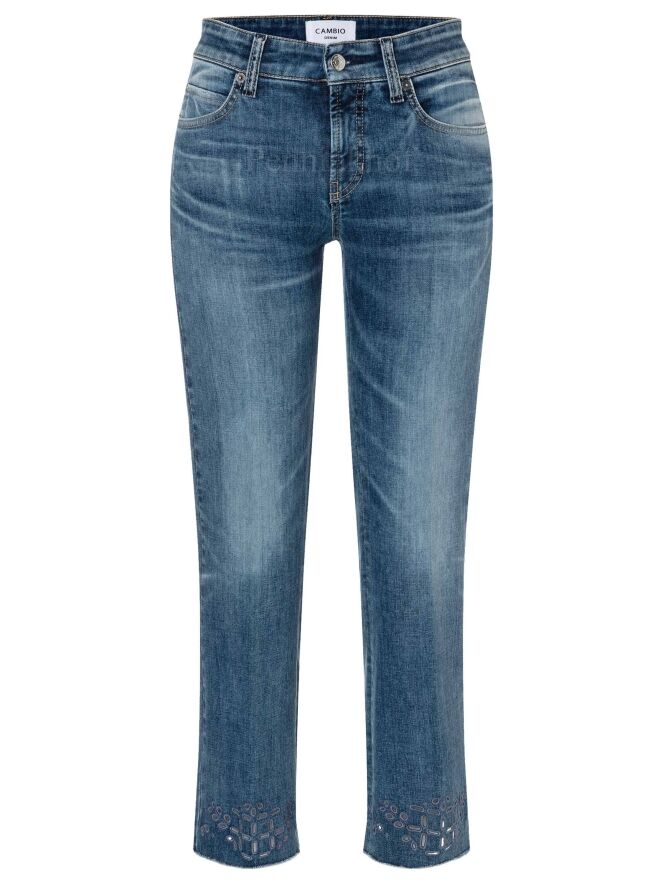 Een jeans van Cambio in een basis jeans kleur. Aan de onderkant van de pijpen is een perforatie in een ajour structuur. De jeans is in een 5 pocket model en mag op 30 graden worden gewassen.
