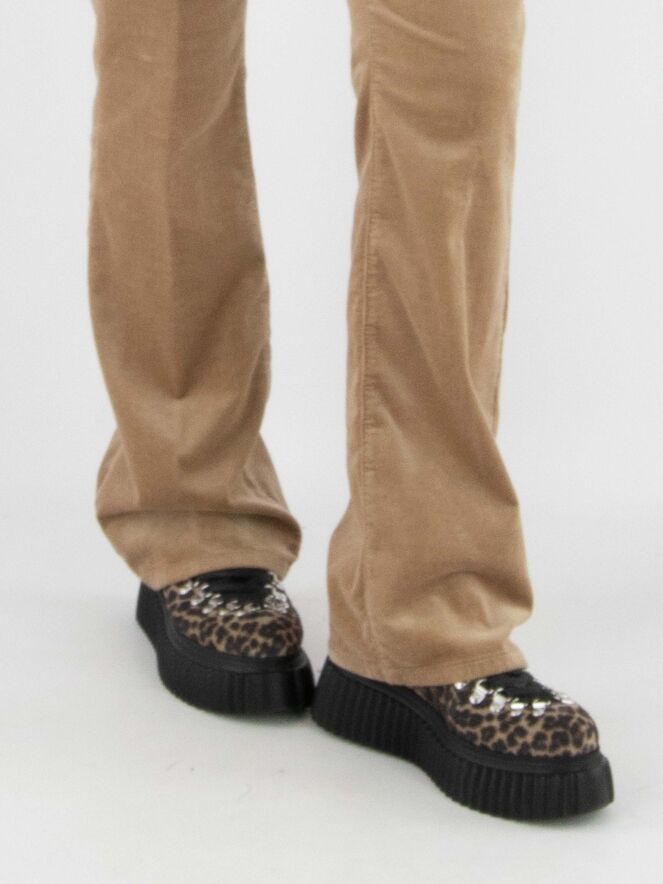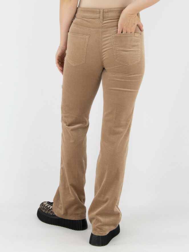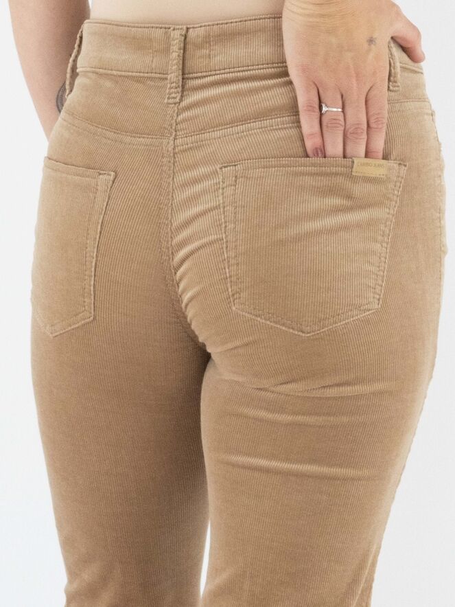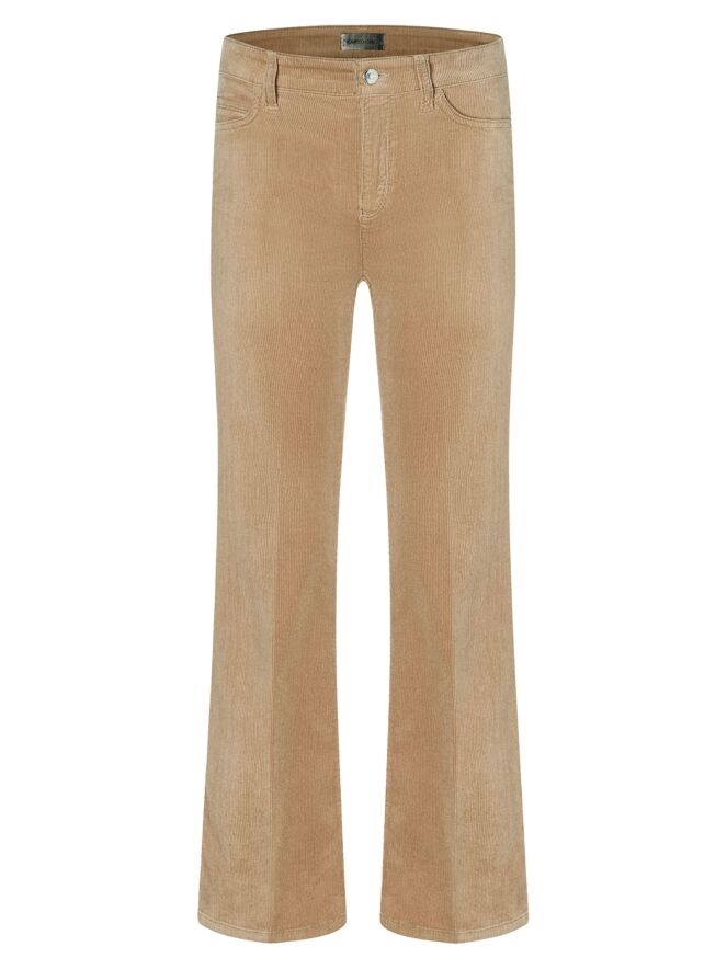 Flared ribcord broek van Cambio in een stijlvolle camel kleur. Dit moderne 5-pocket model combineert een tijdloze pasvorm met een vleugje seventies flair, waardoor het een veelzijdig en elegant item in de garderobe is. Deze exclusieve designerbroek kan op 30 graden worden gewassen.