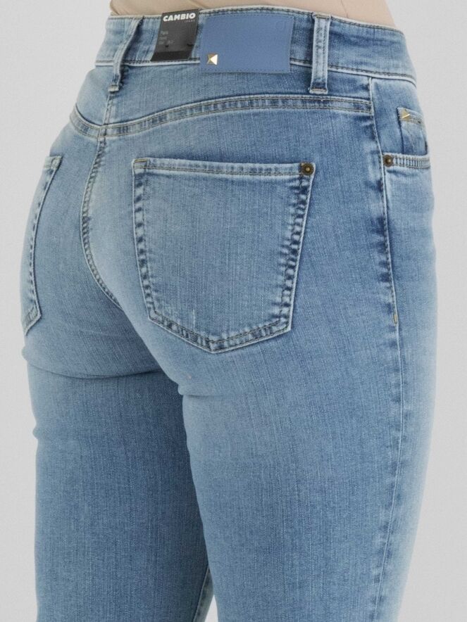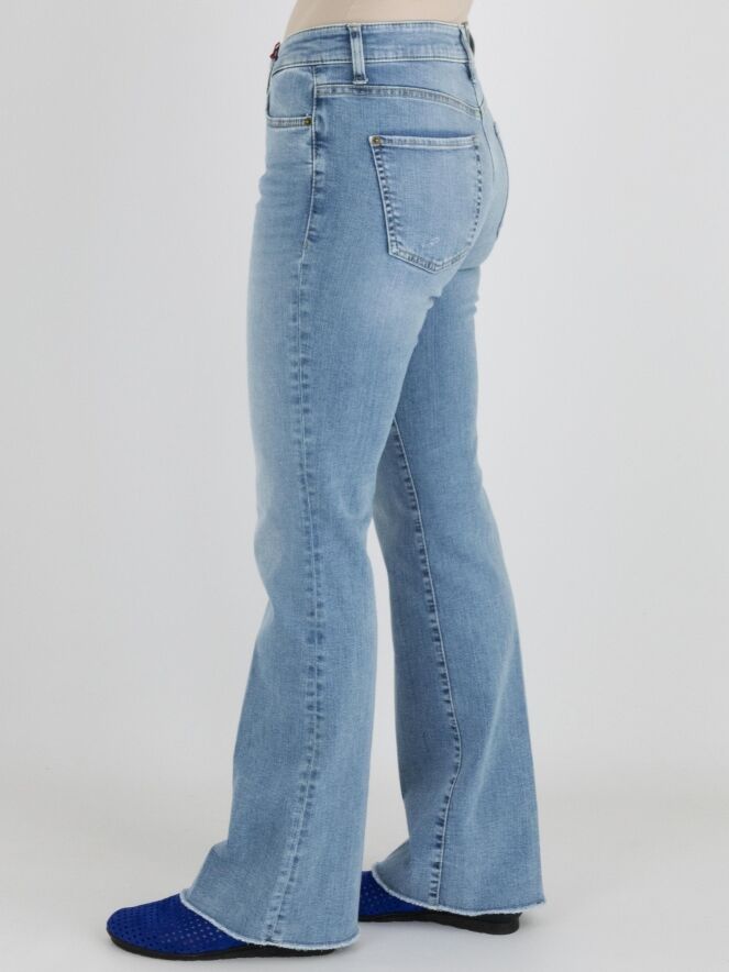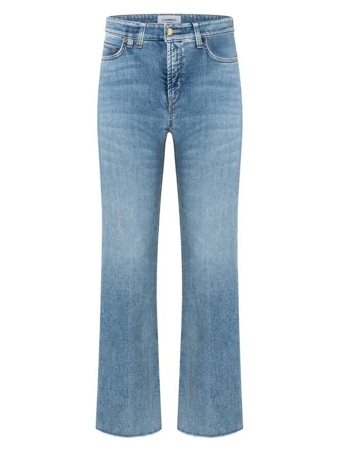Een flared jeans van Cambio in een lichte jeans kleur. De jeans is in een 5 pocket model en de onderkant van de pijpen is fijn gerafeld. Deze jeans mag op 30 graden worden gewassen.