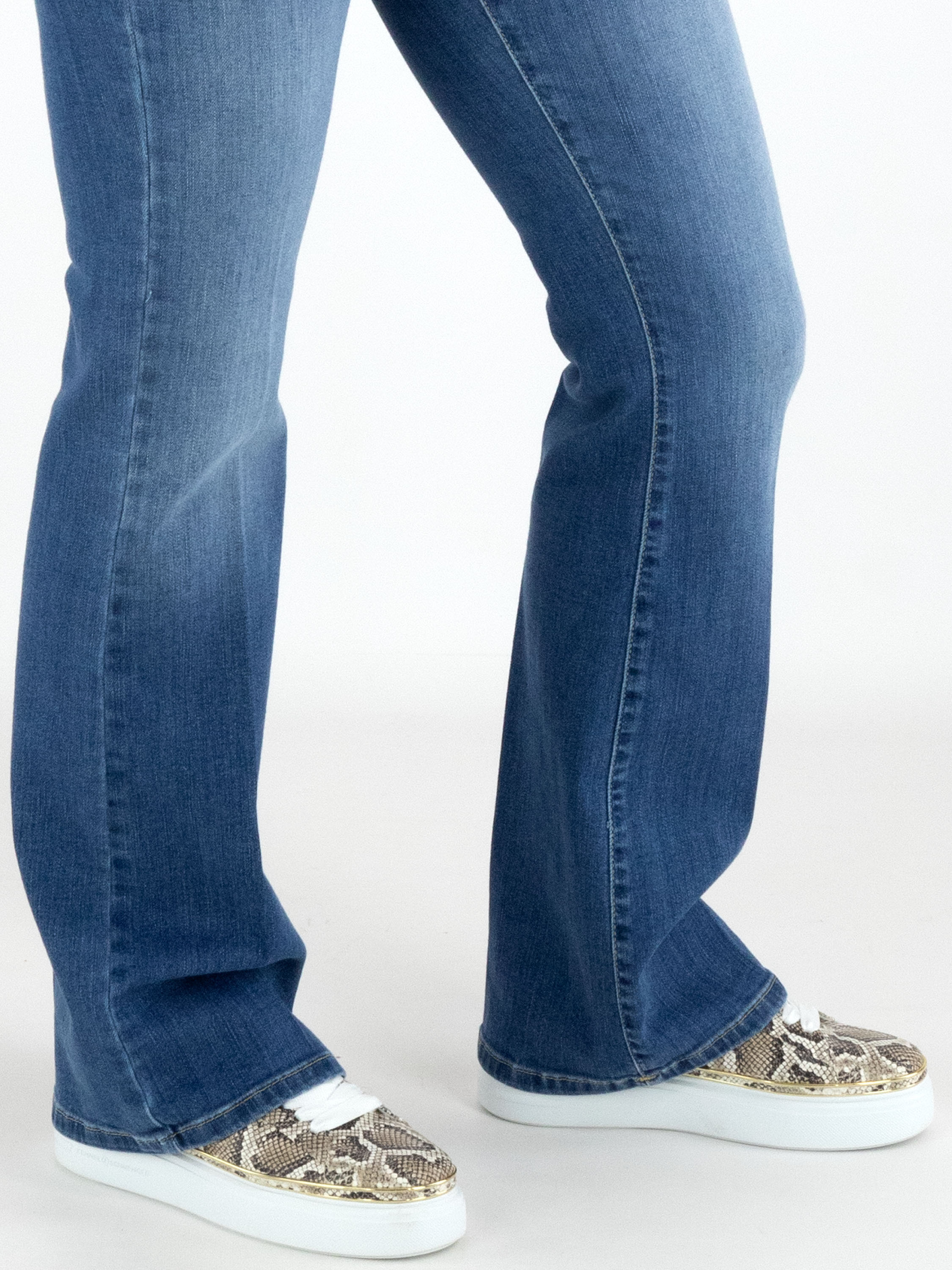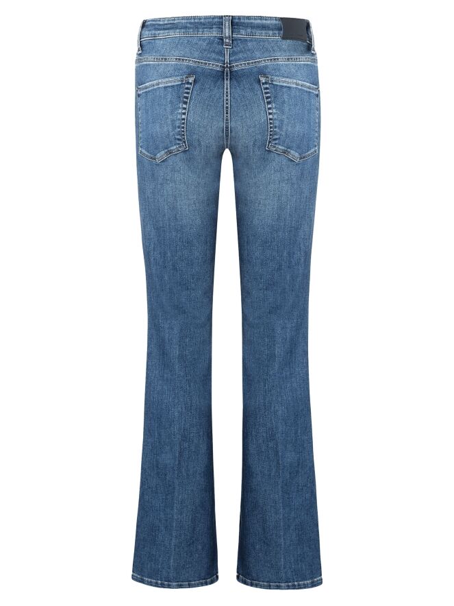 Een flared jeans van Cambio in een 5-pocket model. De jeans heeft een used look. De stiknaden zijn in een cognackleur. Deze jeans mag op 30 graden worden gewassen.