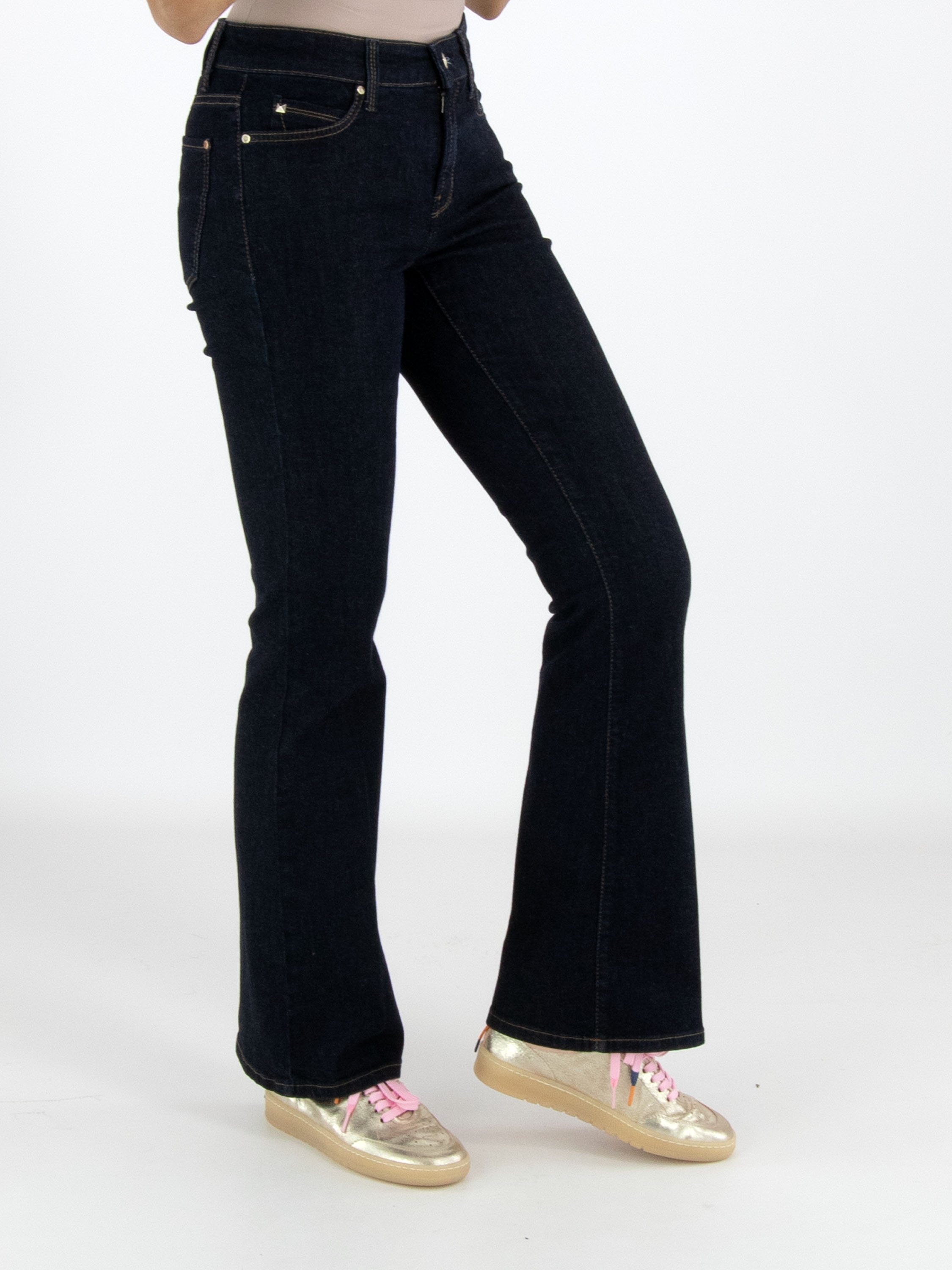 Een flared dark denim jeans van Cambio in een 5-pocket model. De stiknaden zijn in een cognackleur. Deze jeans mag op 30 graden worden gewassen.