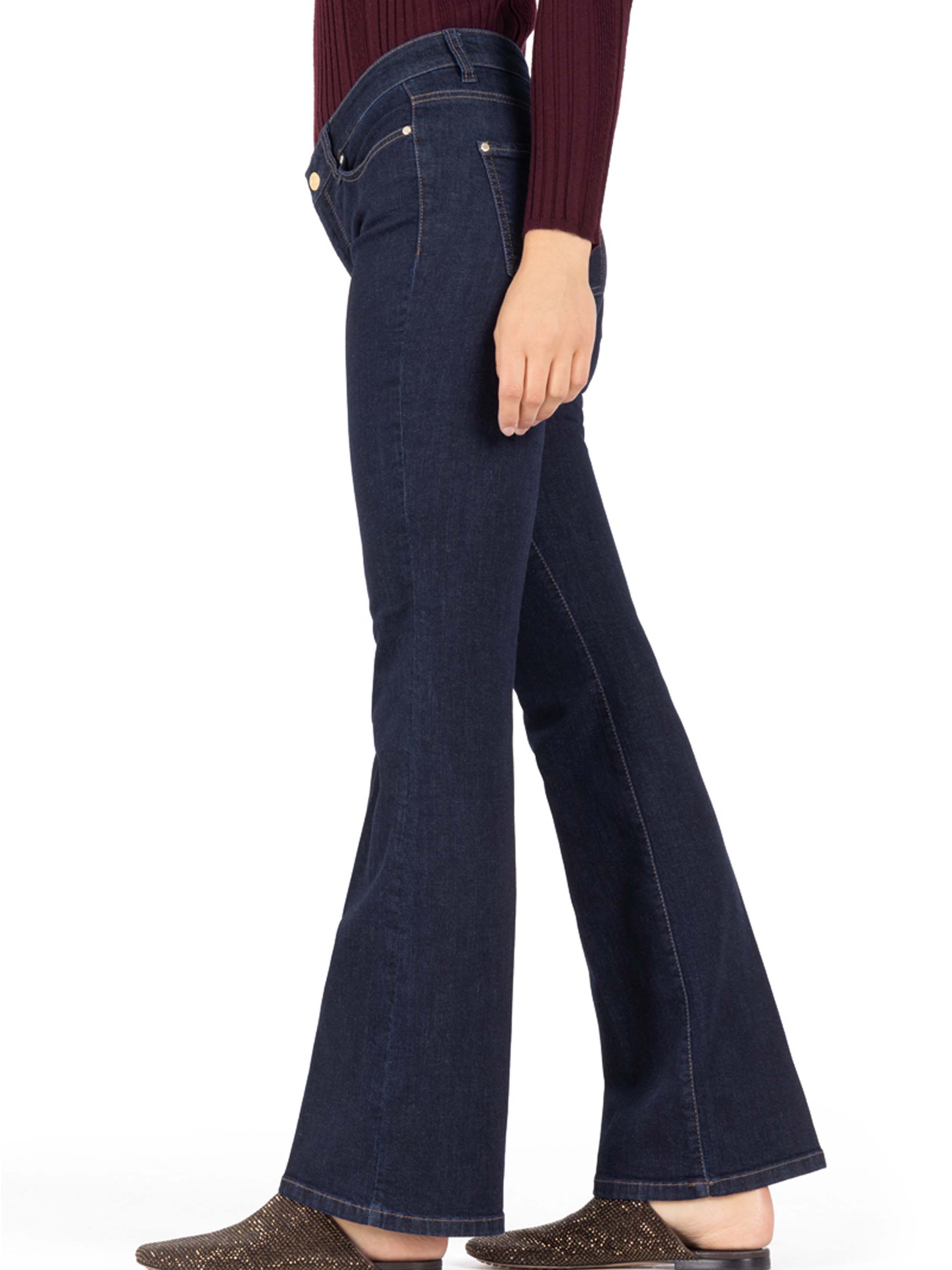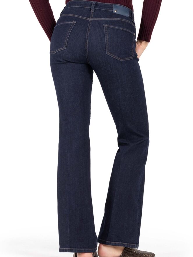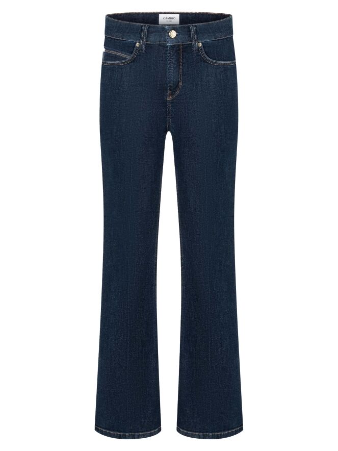 Een flared jeans van Cambio in een dark denim kleur. De jeans is uitgevoerd in een 5-pocket model en kan op 30 graden worden gewassen.