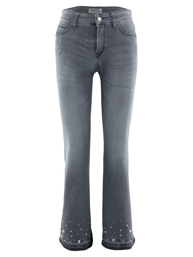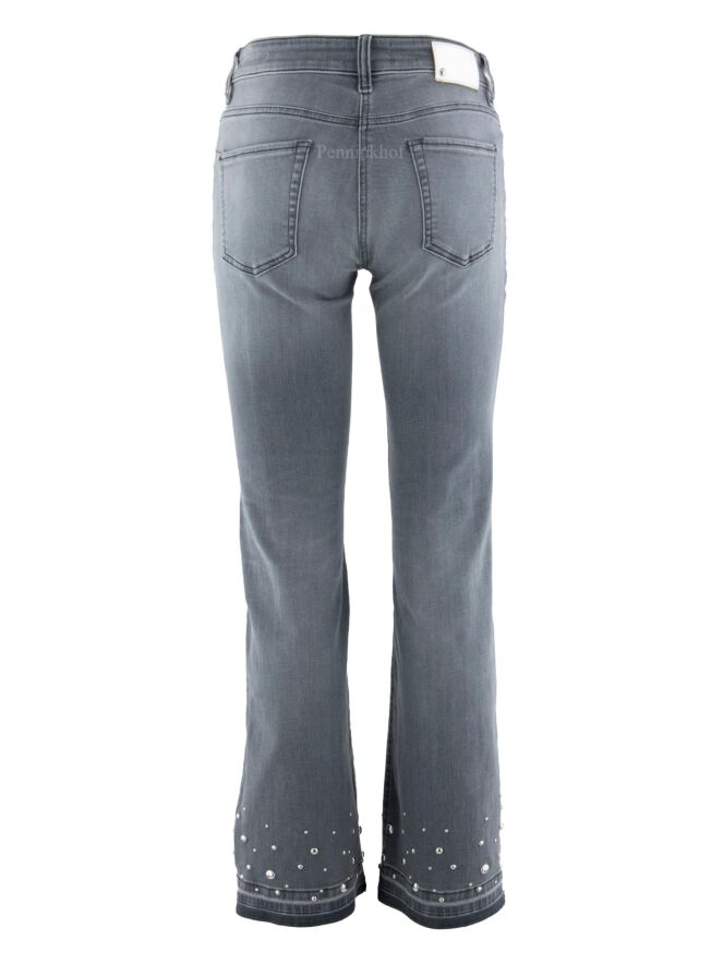Een gewassen flared jeans van Cambio in een lichtgrijze kleur. De jeans is in een 5 pocket model. Aan de onderkant van de pijpen zijn meerdere ronde zilver kleurige studs in verschillende groottes. De rand van de pijpen is in een gestreept patroon met meerdere tinten grijs. Deze jeans mag op 30 graden worden gewassen.