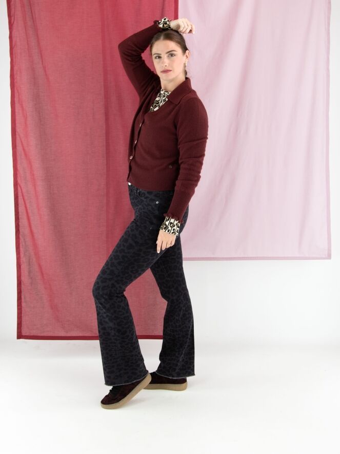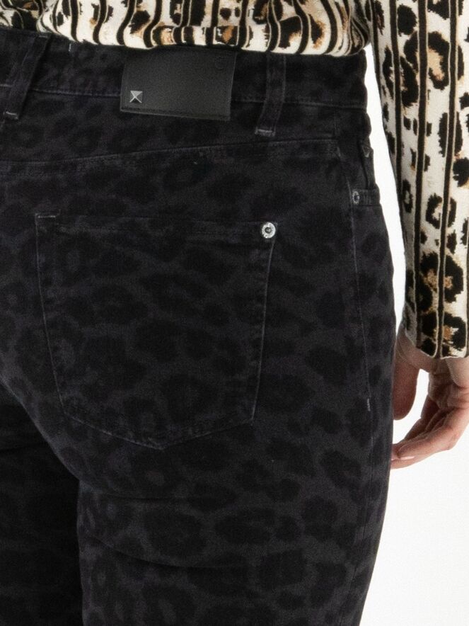 Een jeans van Cambio in een panterprint met meerdere tinten grijs en zwart. De jeans is uitgevoerd in een 5-pocketmodel en mag op 30 graden worden gewassen.