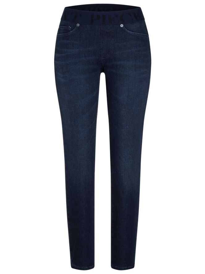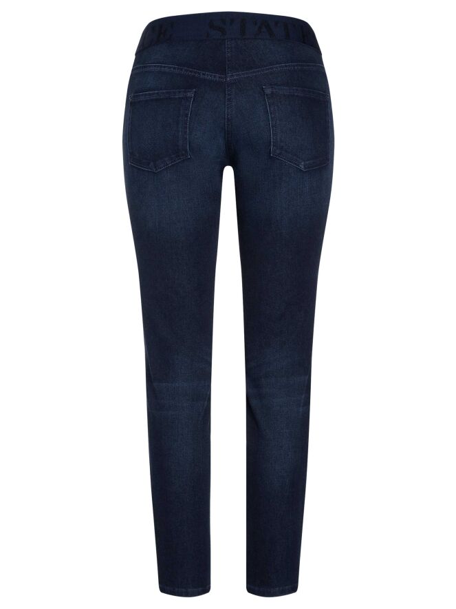 Een jeans van Cambio in een donkere jeans kleur. De jeans is in een 5 pocket model. In de taille is een brede elastieken band en is zeer elastisch. Deze jeans mag op 30 graden worden gewassen.