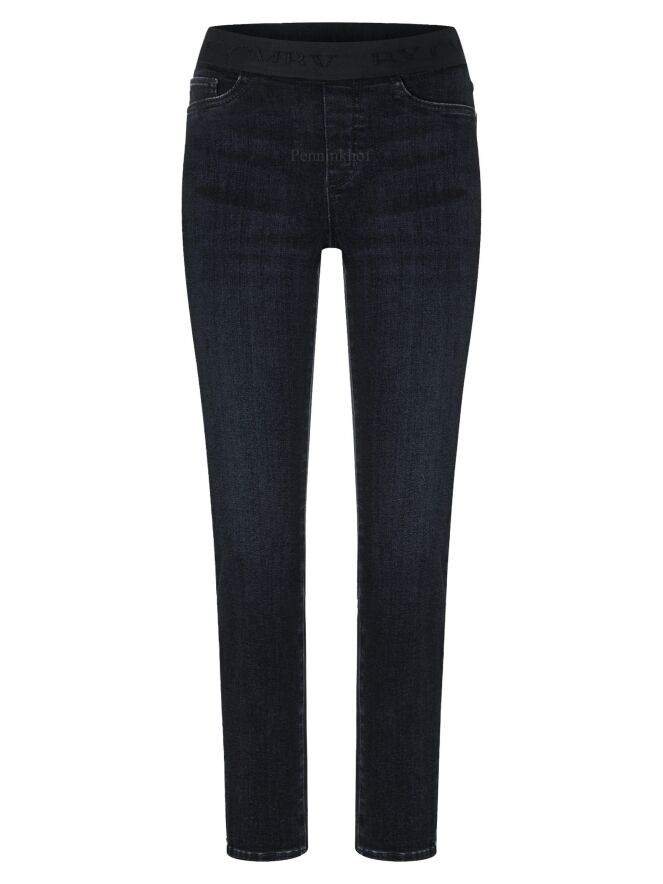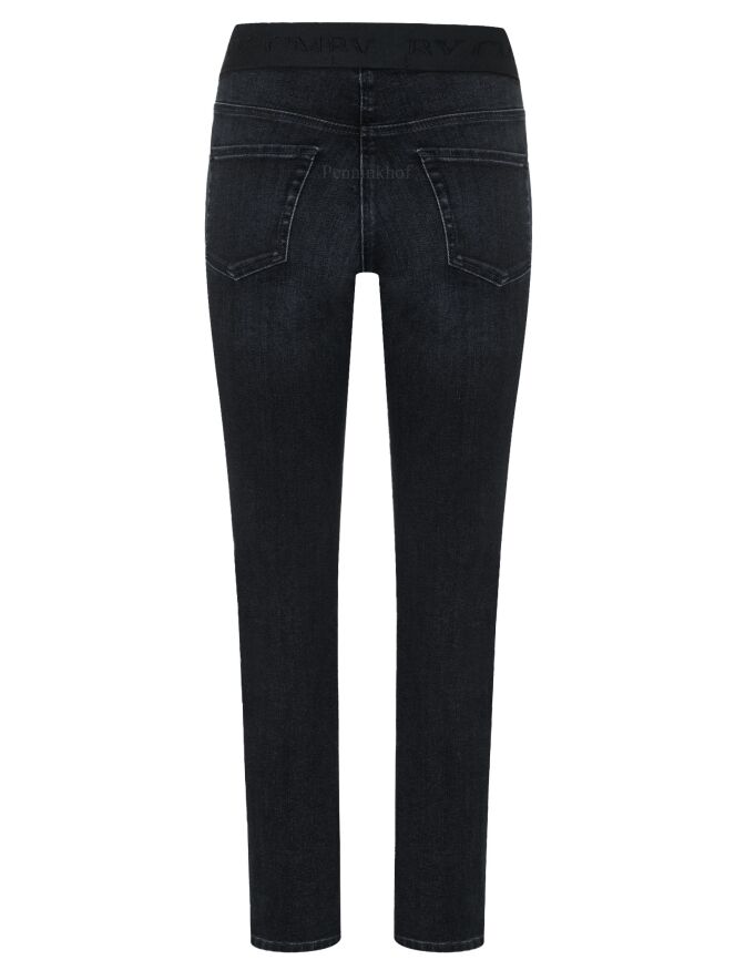 Een jeans van Cambio in de kleur antraciet. In de taille is een elastieken band met een zwarte metallic draad door het elastiek geweven. De jeans is een 5 pocket model en mag op 30 graden worden gewassen.