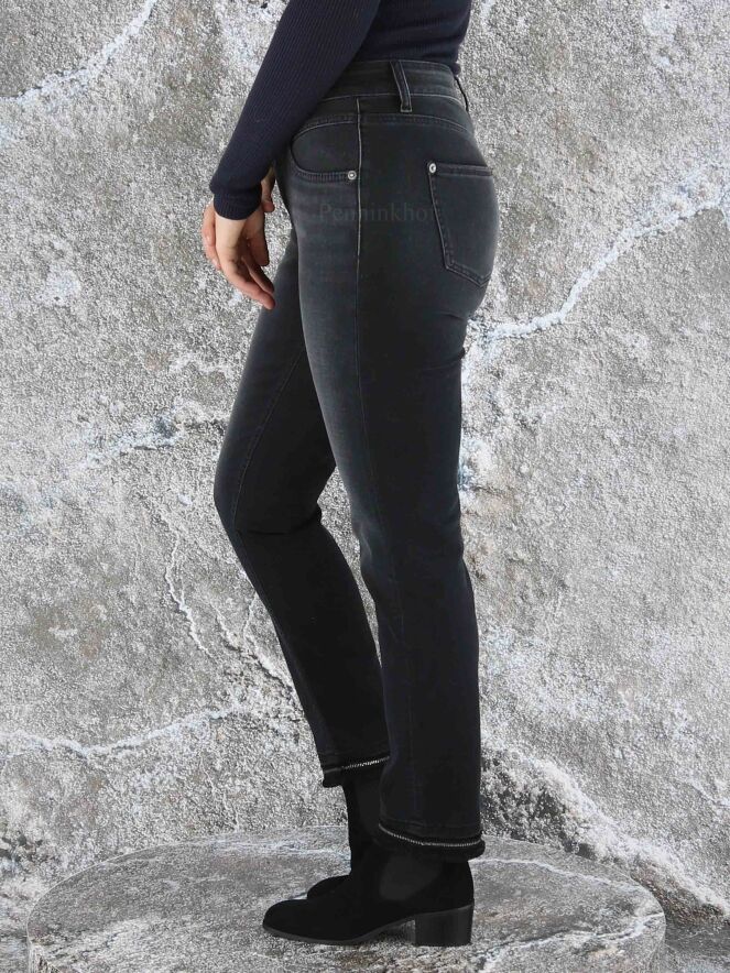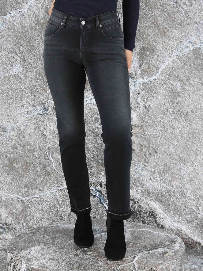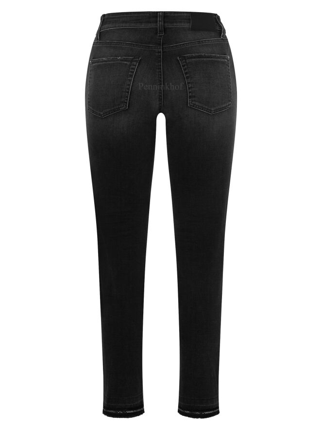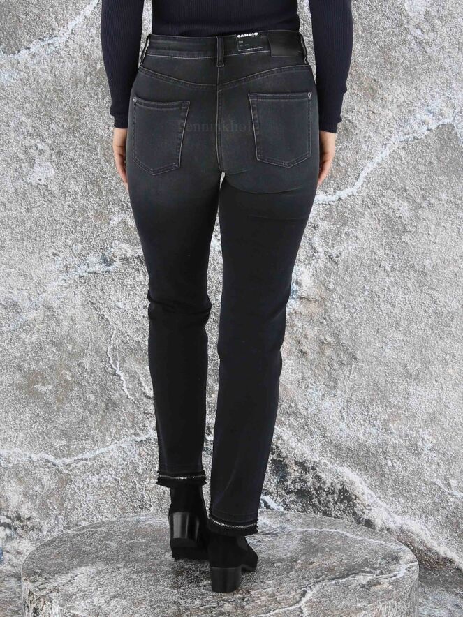 Een gewassen jeans van Cambio in de kleur zwart. de jeans is in een 5 pocket model. Aan de onderkant van de pijpen is een decoratieve schakel ketting bies. De rand van de pijpen is fijn gerafeld. Deze jeans mag op 30 graden worden gewassen.