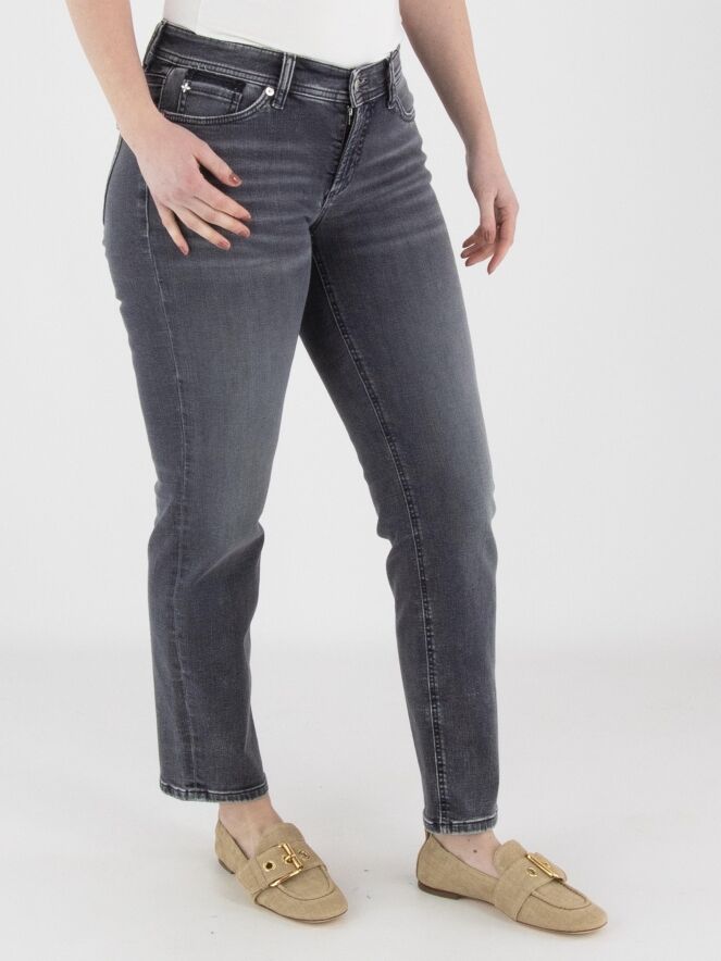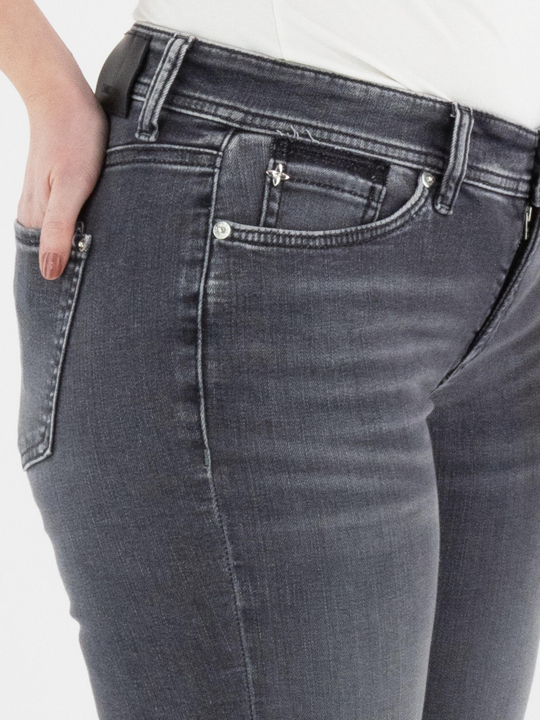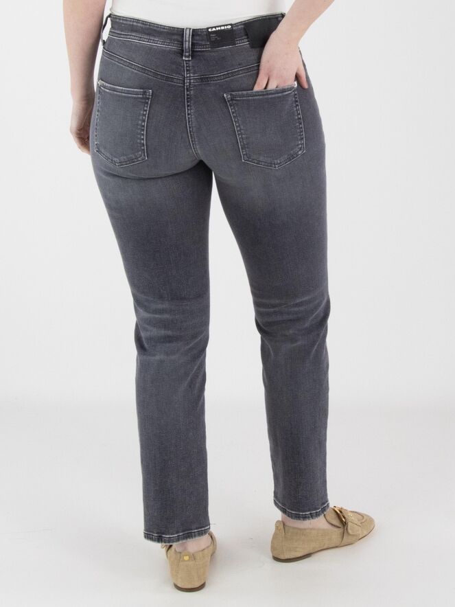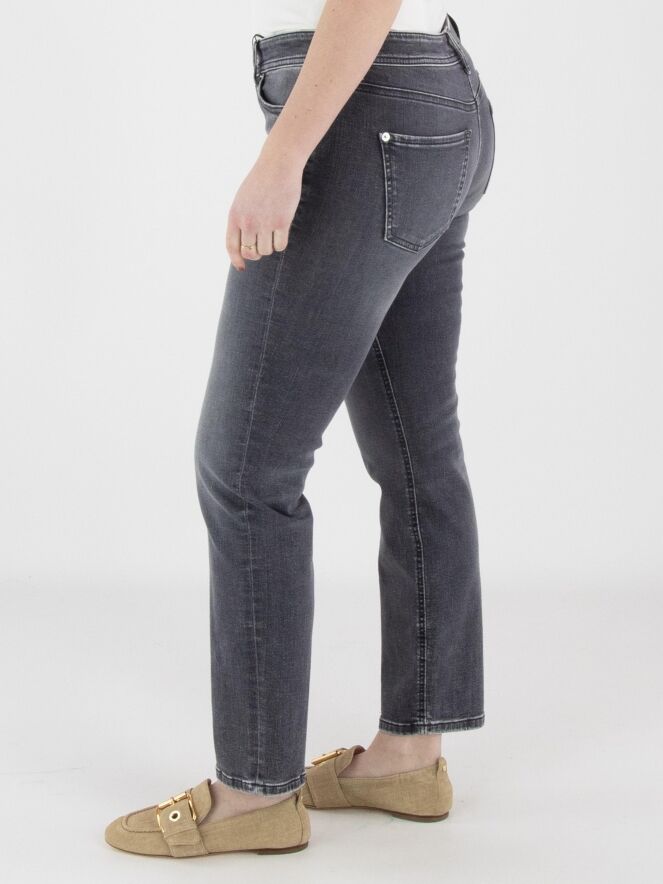 Een used jeans van Cambio in een donkergrijze kleur. De jeans is uitgevoerd in een 5-pocket model en kan op 30 graden worden gewassen.