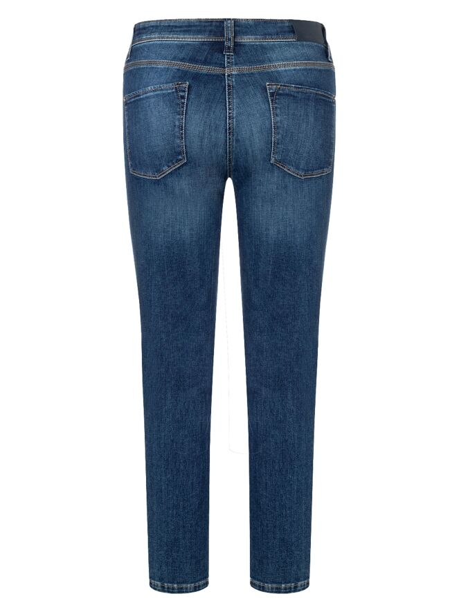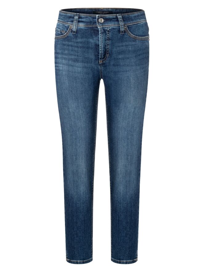 Een jeans van Cambio in een basis jeanskleur. De jeans is in een 5-pocket model. Aan de onderkant is aan de buitenzijde een kort splitje. Deze jeans mag op 30 graden worden gewassen.