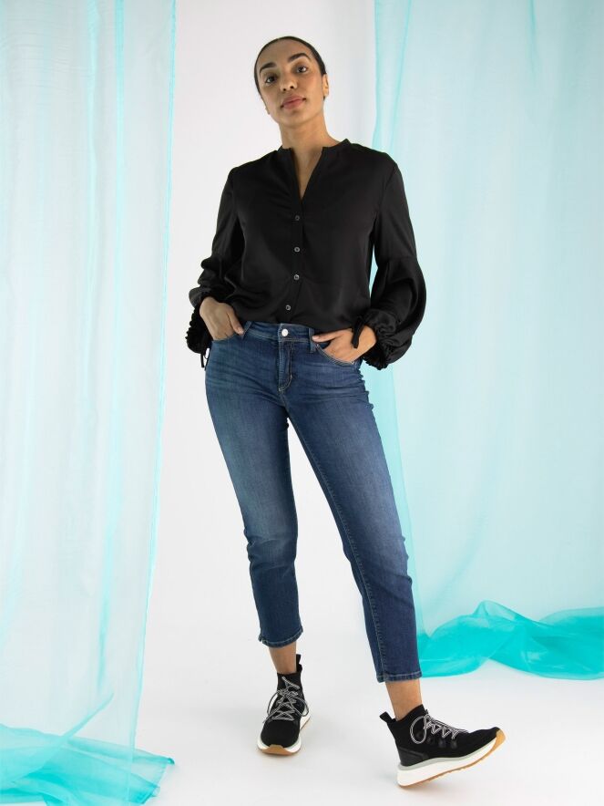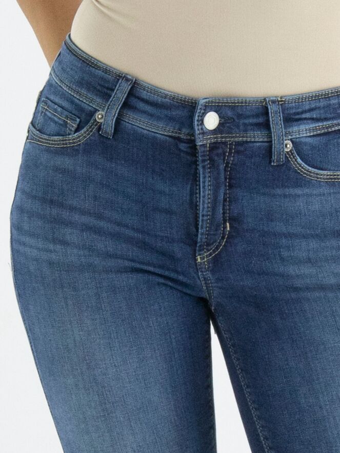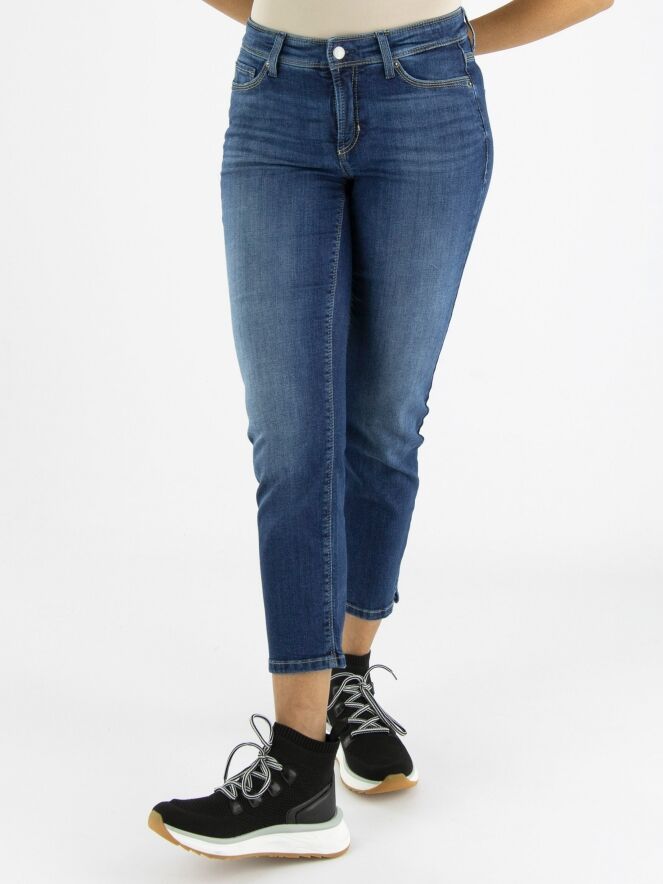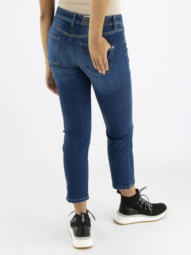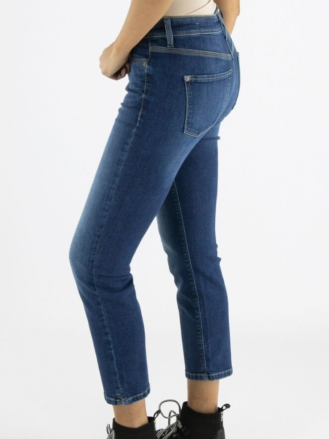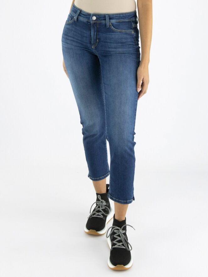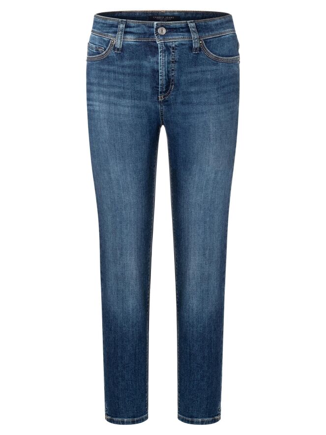 Een korte jeans van Cambio in een basic jeans kleur. De jeans in een 5 pocket model en aan de onderkant is aan beide zijkanten een kort splitje. Deze jeans mag op 30 graden worden gewassen.
