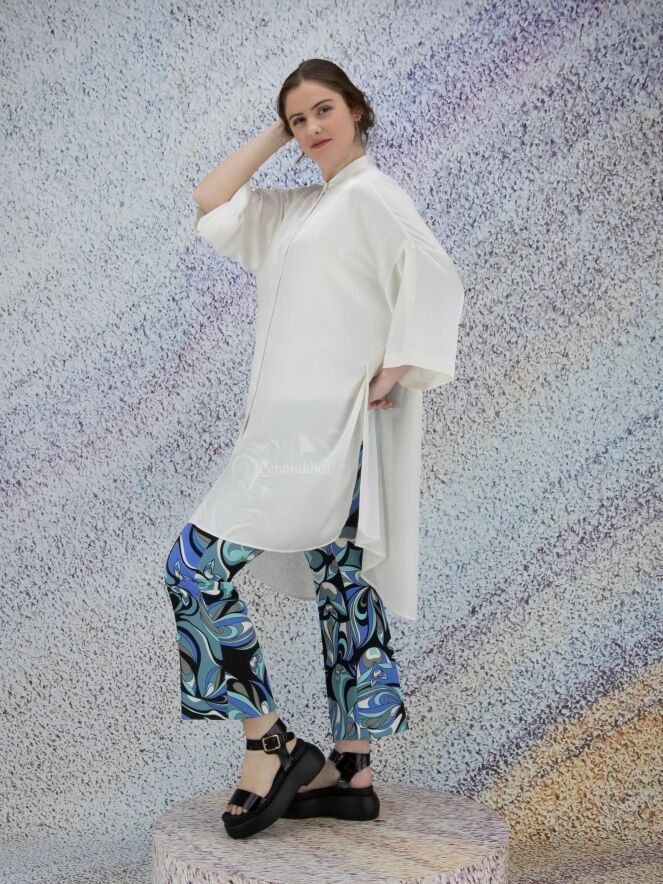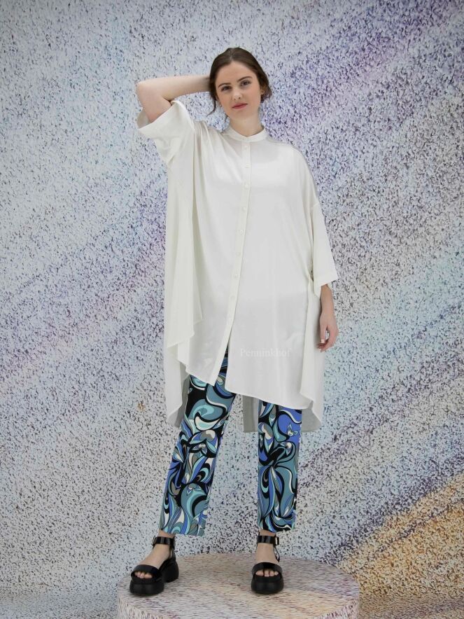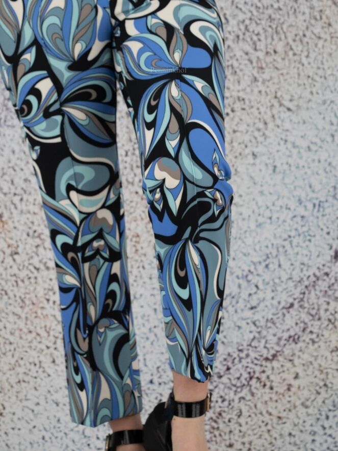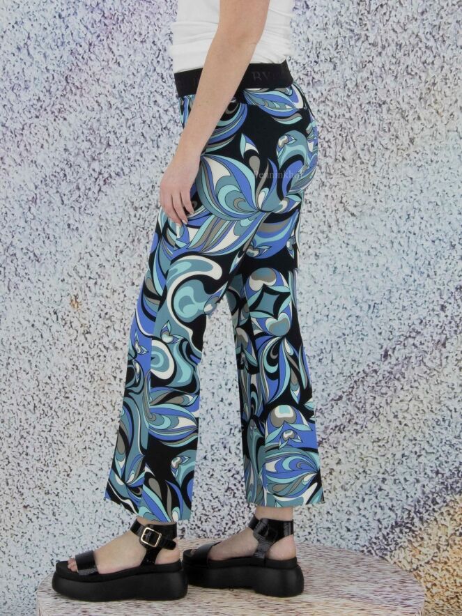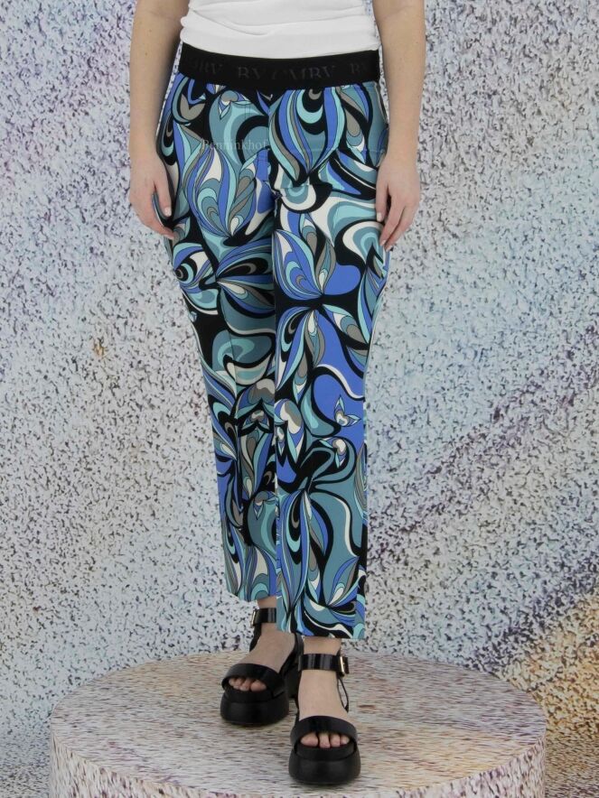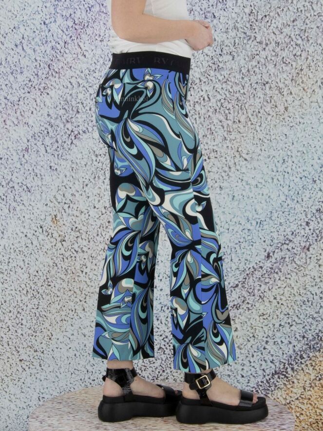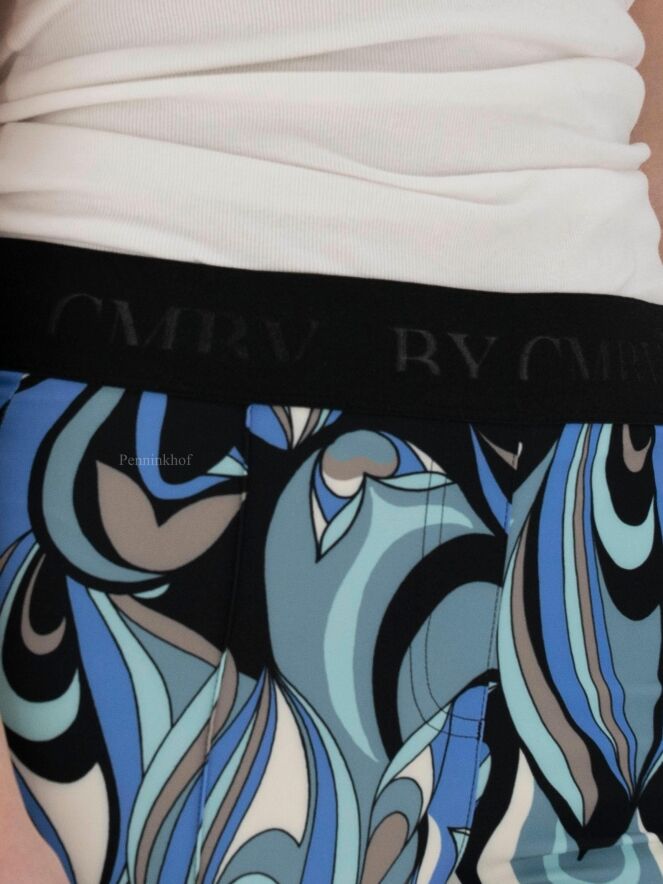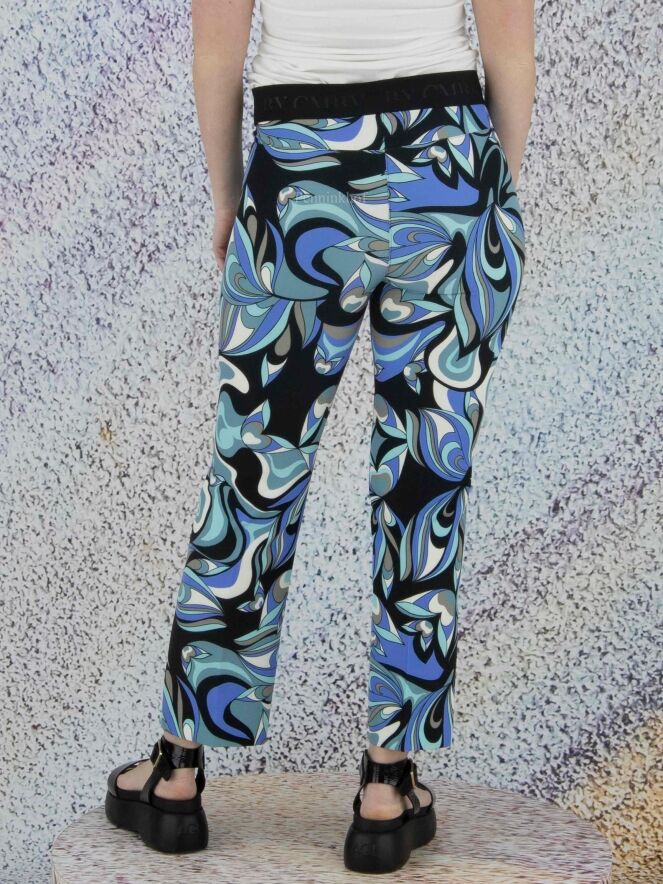 Een broek van Cambio in een pop art print met meerdere tinten blauw met roomwit en zwart. In de taille is een zwarte elastieken band over het midden van de pijpen is een doorgestikte naad. Deze broek mag op 30 graden worden gewassen.