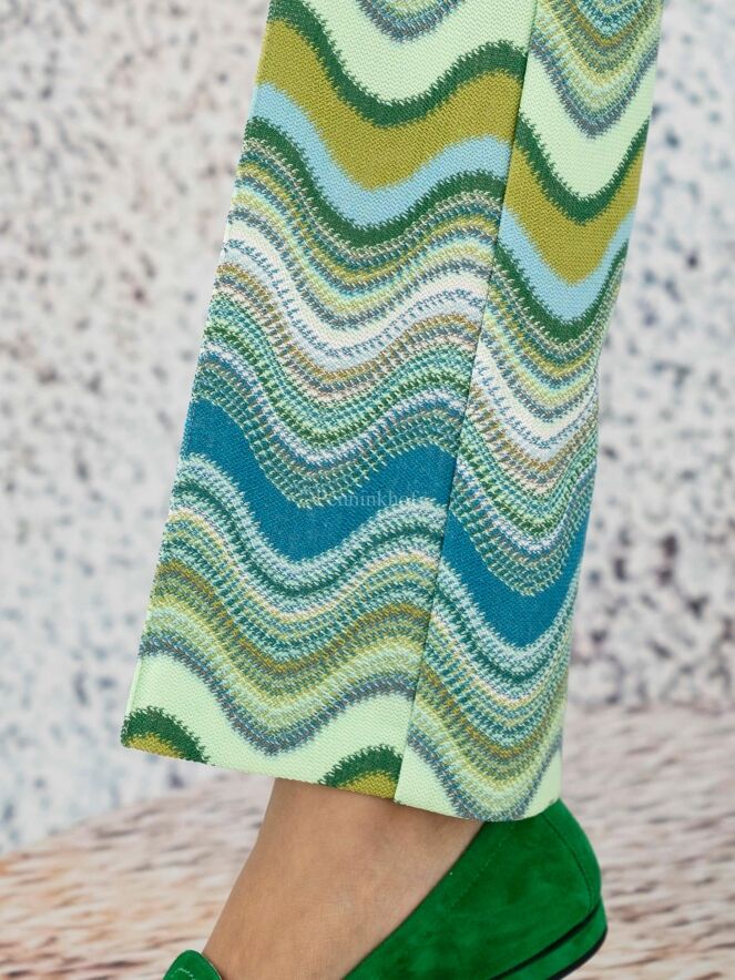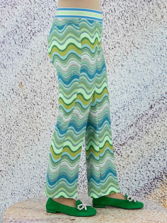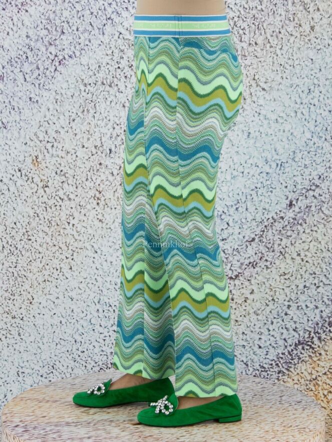 Een broek van Cambio in een golvende missoni print met meerdere tinten groen en turquoise met wit. In de taille is een zwarte elastieken band over het midden van de pijpen is een doorgestikte naad. Deze broek mag op 30 graden worden gewassen.