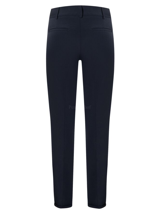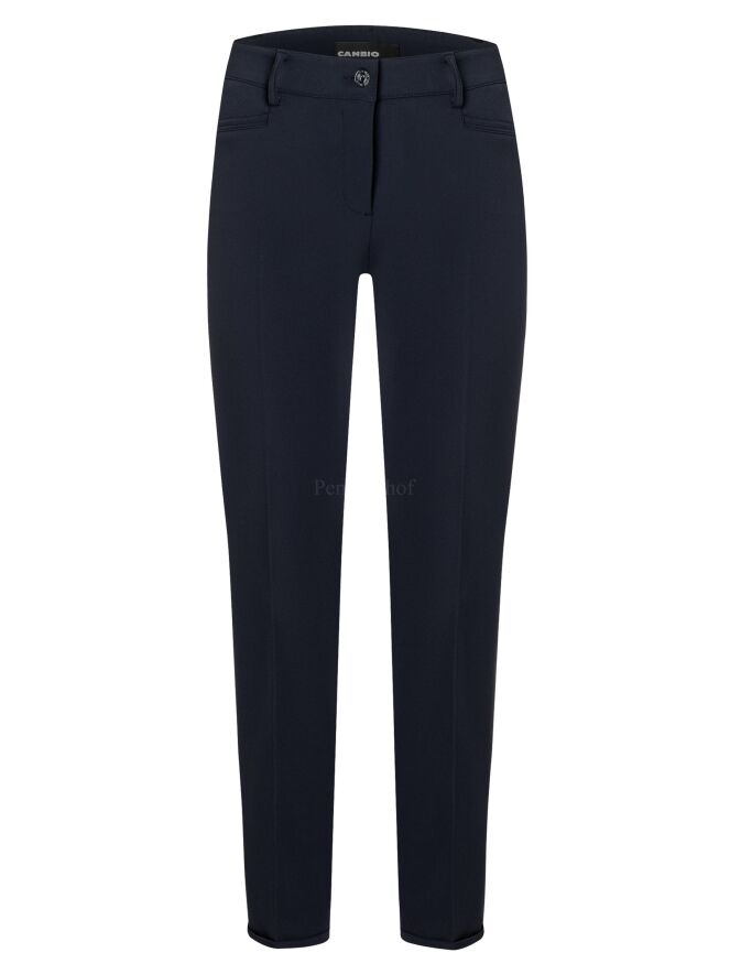 Een broek van het merk Cambio in de kleur marine blauw. Langs de rand van de zakken aan de voorzijde is een smalle bies van imitatie leder. Aan de uiteinden van de pijpen is een korte omslag van 2 cm. Deze broek mag op 30 graden worden gewassen.