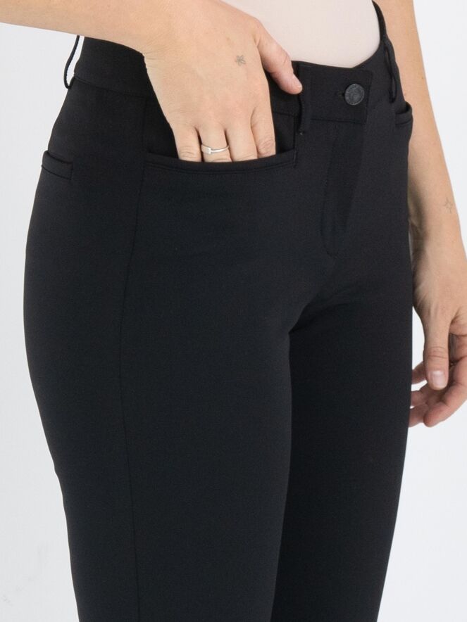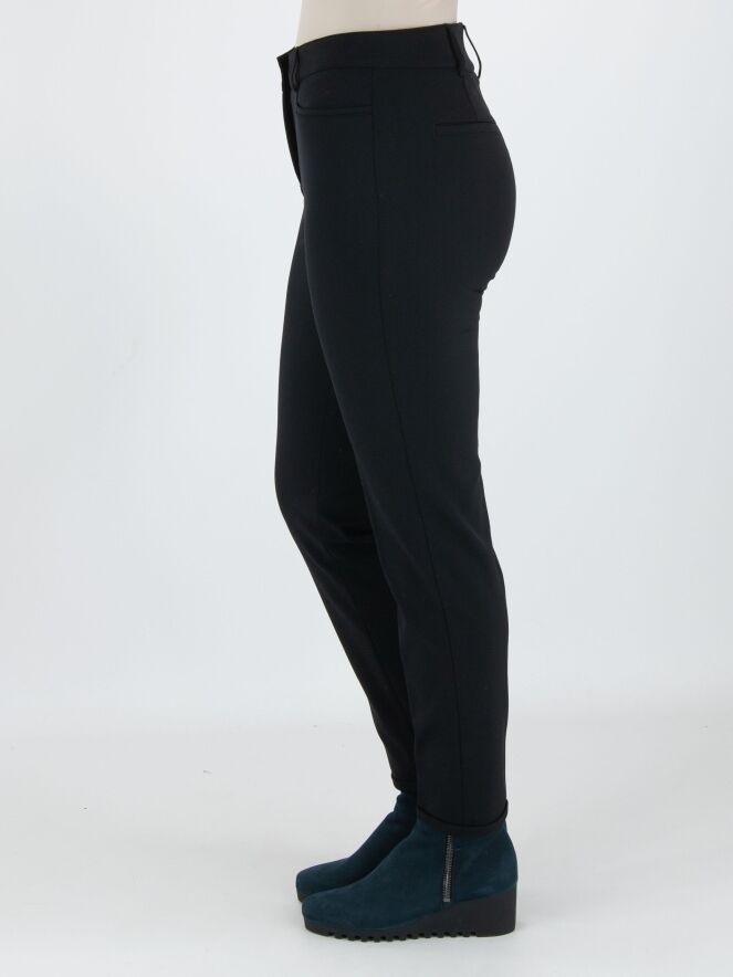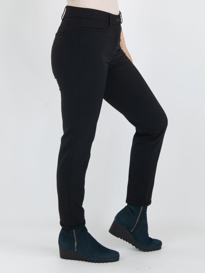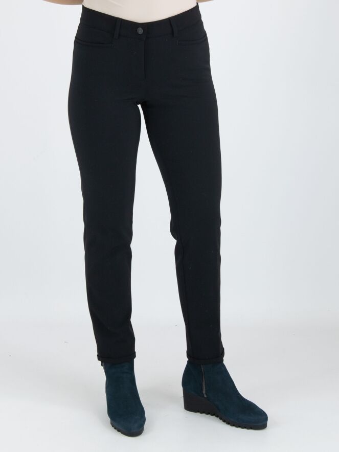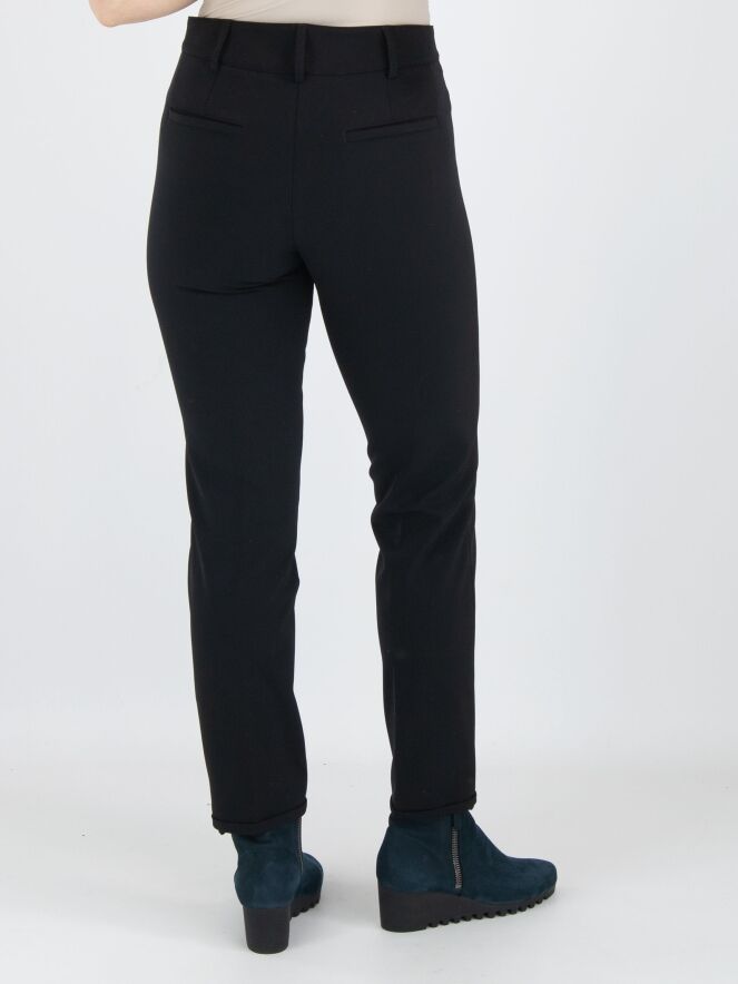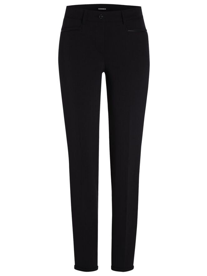 Een broek van het merk Cambio in de kleur zwart. Langs de rand van de zakken aan de voorzijde is een smalle bies van imitatie leder. Aan de uiteinden van de pijpen is een korte omslag van 2 cm. Deze broek mag op 30 graden worden gewassen.
