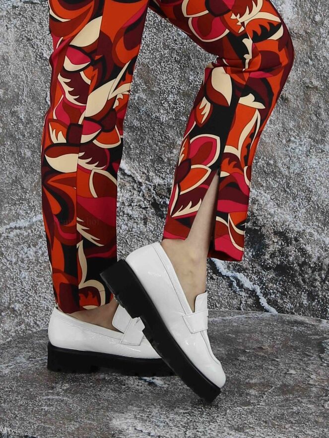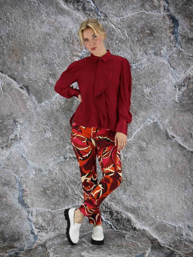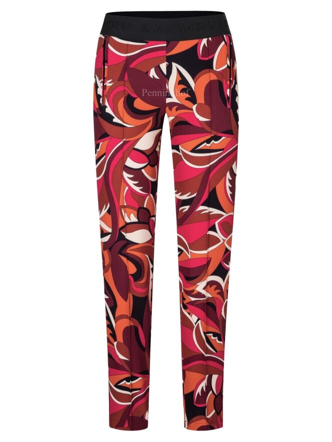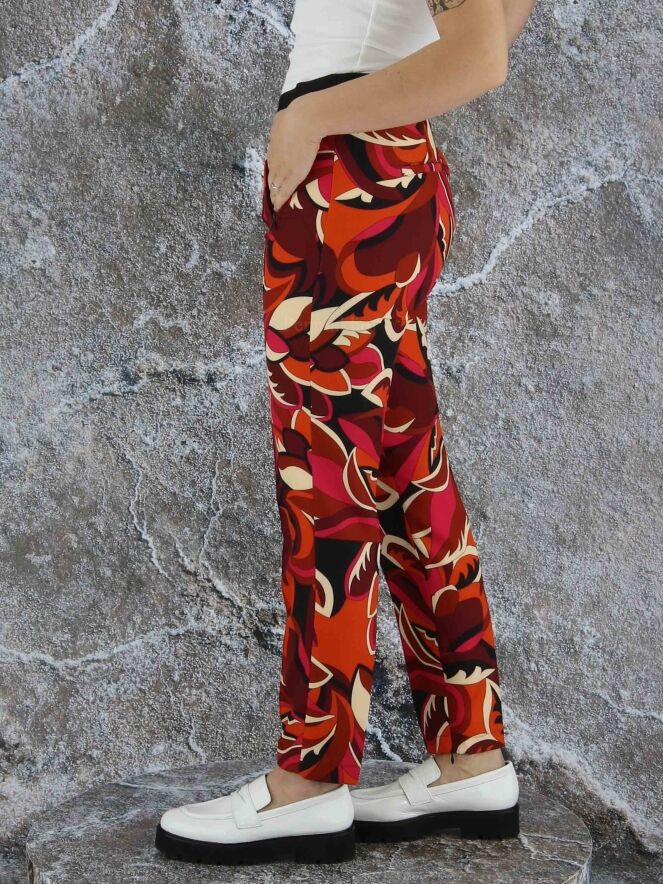 Een broek van Cambio in een pop art print met de kleuren fuchsia, oranje, cognac, roomwit en zwart. In de taille is een zwarte elastieken band. In het midden van de pijpen is over de gehele lengte een stiknaad. Aan de onderkant van de pijpen is een rits. Deze broek mag op 30 graden worden gewassen.