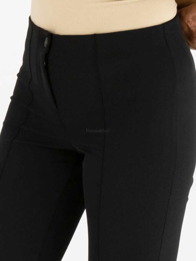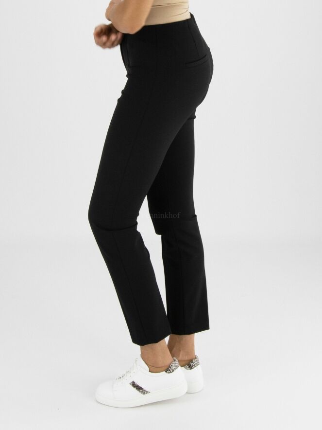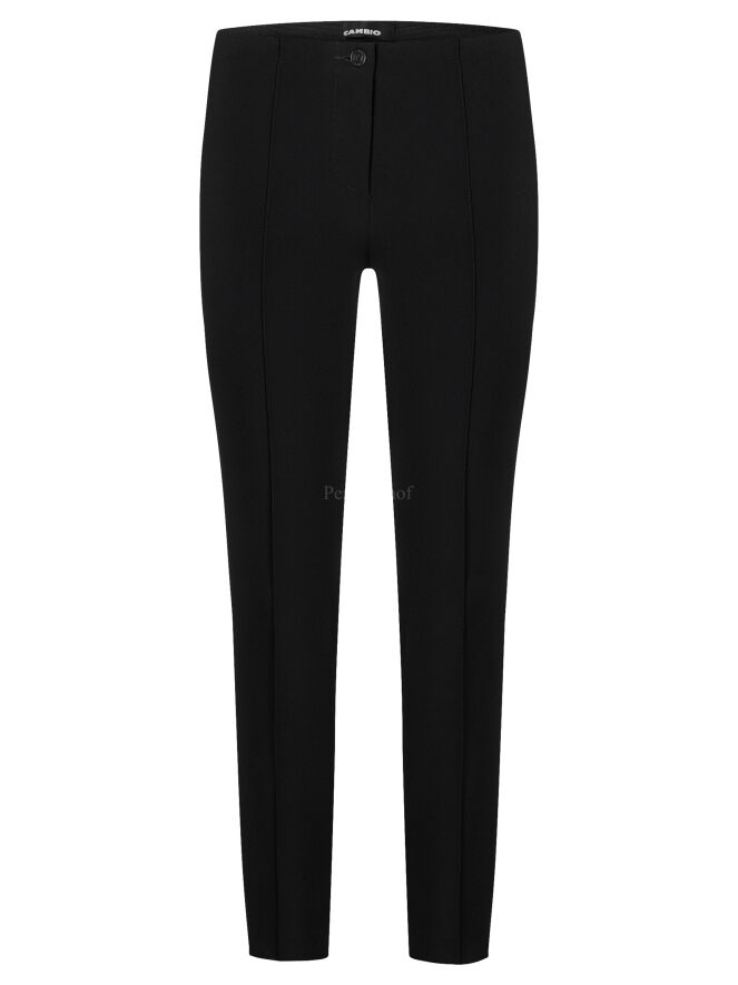 Een broek van Cambio in de kleur zwart. In de taille is een elastieken band. Over het midden van de pijpen is een stiknaad. Deze broek mag op de hand worden gewassen.
