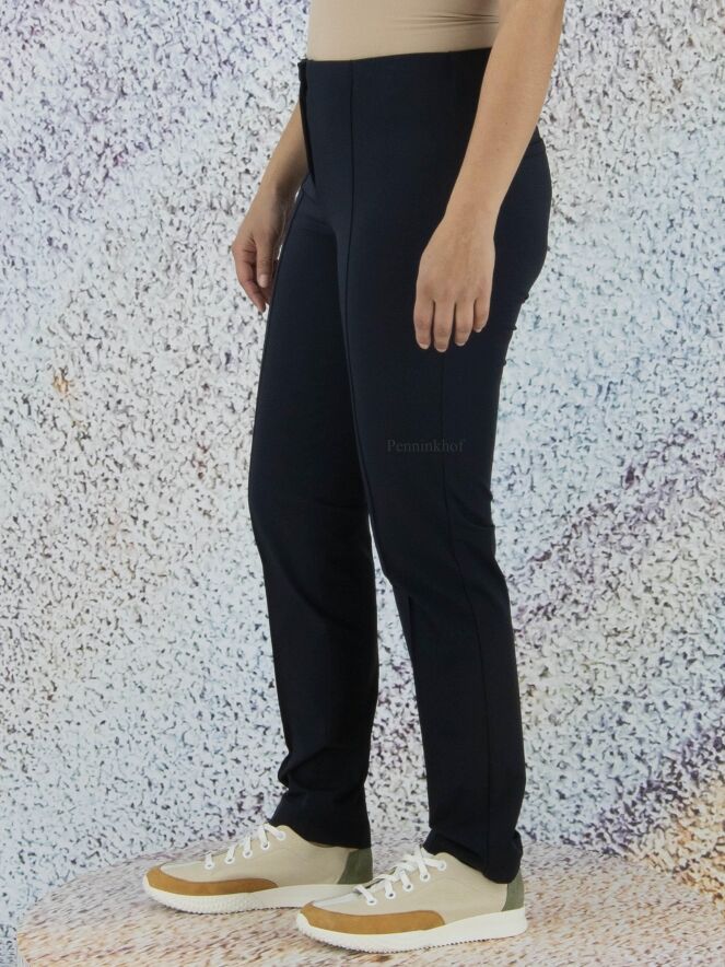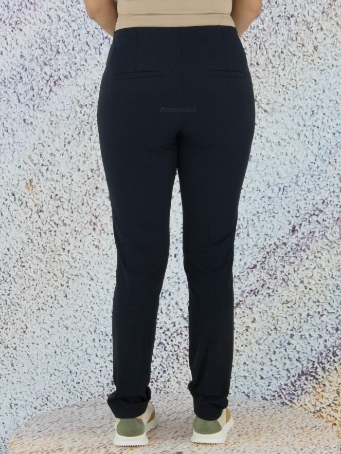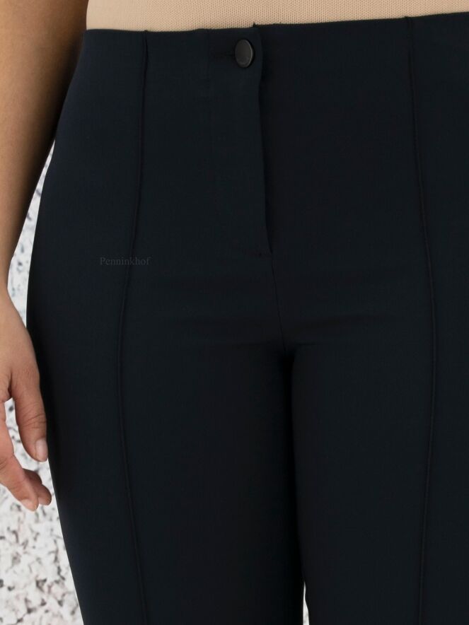 Een broek van Cambio in een marineblauwe kleur. In de taille is een elastieken band. Over het midden van de pijpen is een stiknaad. Deze broek mag op de hand worden gewassen.