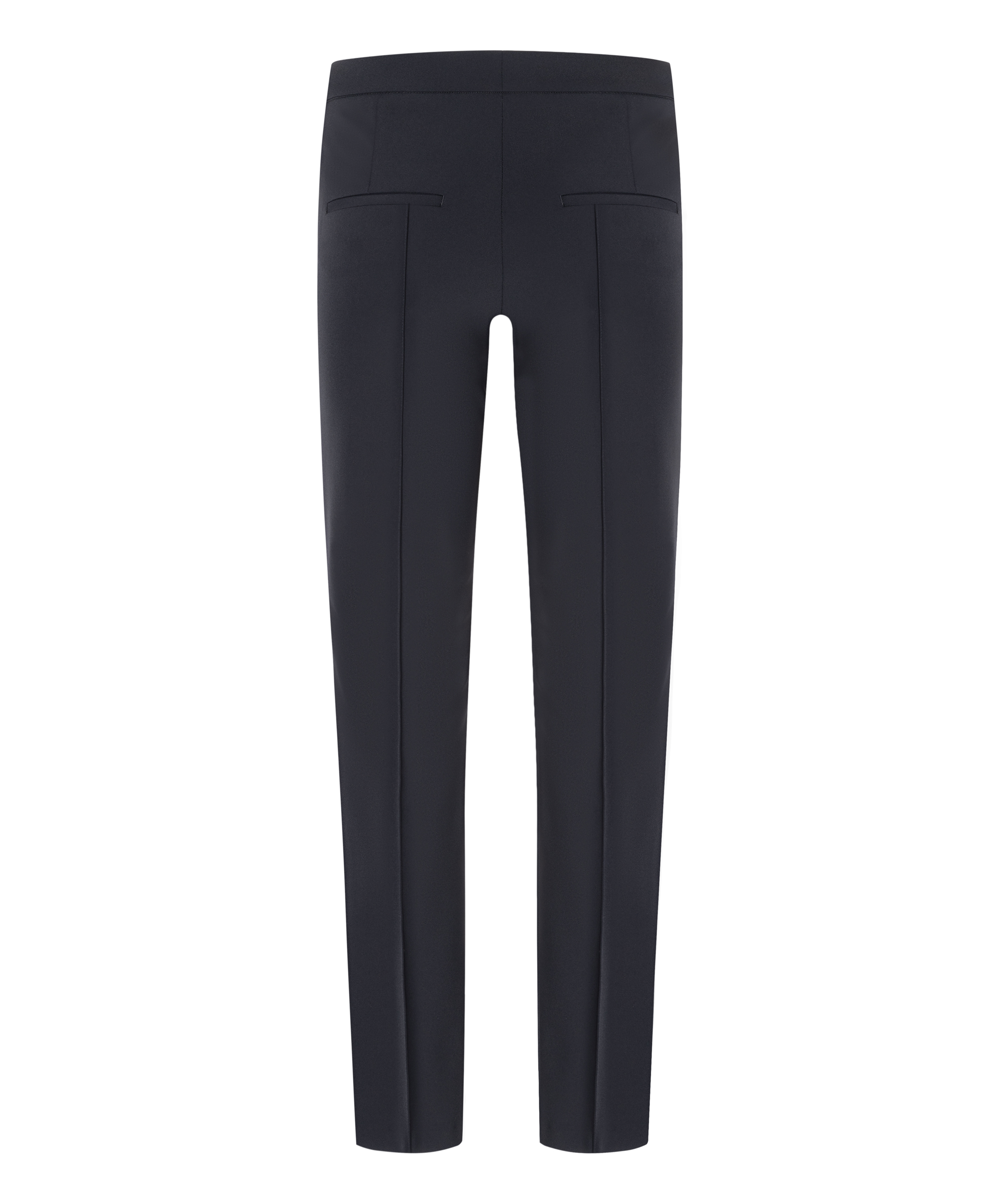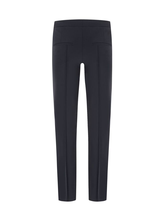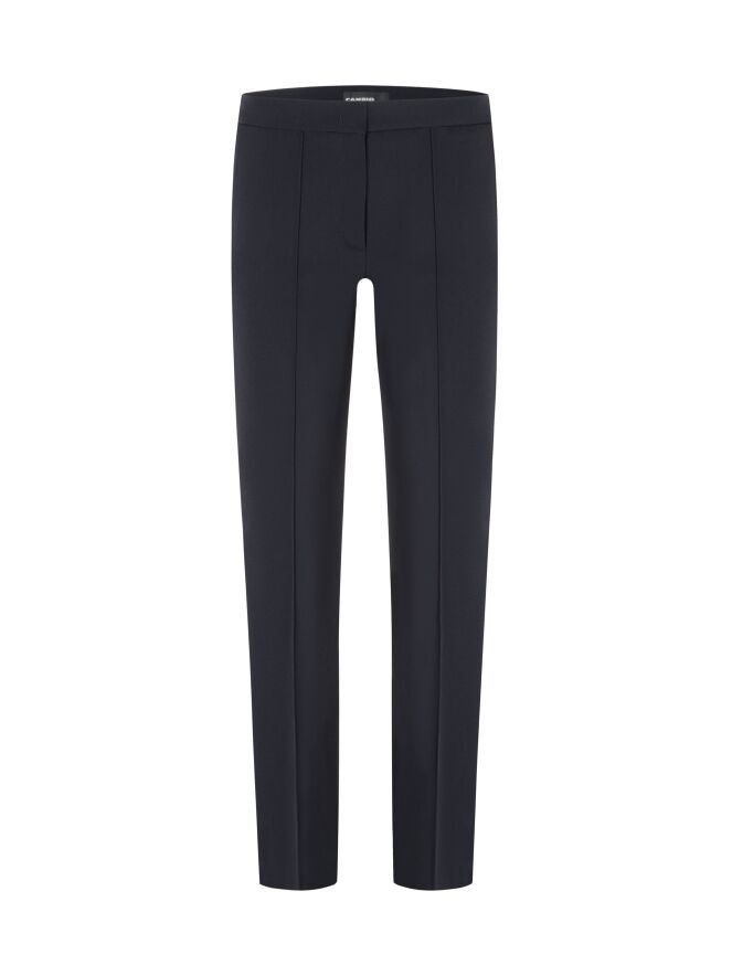 Een slank gesneden pantalon van Cambio in de kleur zwart. In het midden van de pijpen is een omgekeerde stiknaad. De broek heeft steekzakken en mag op 30 graden worden gewassen.