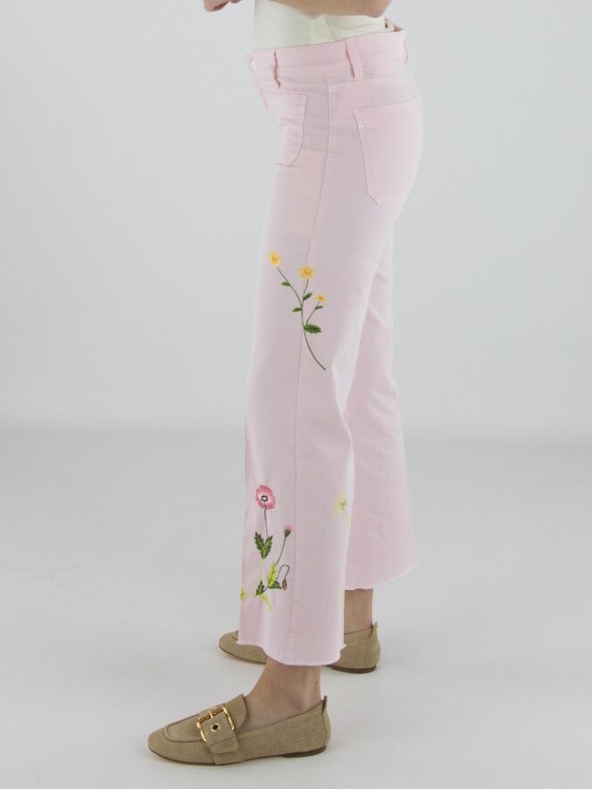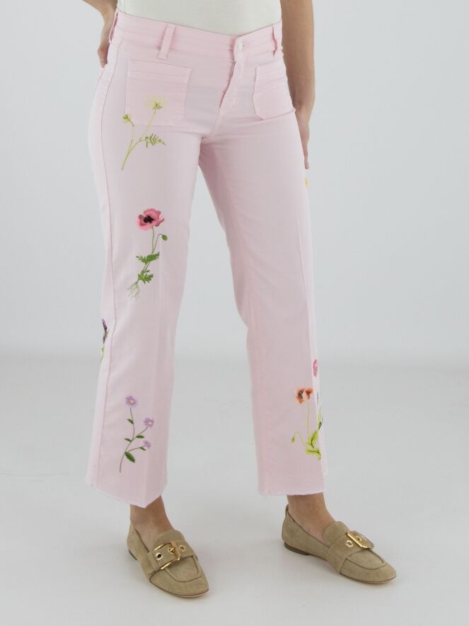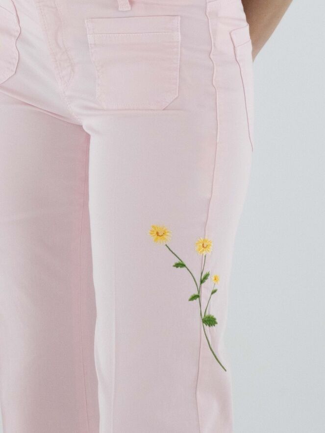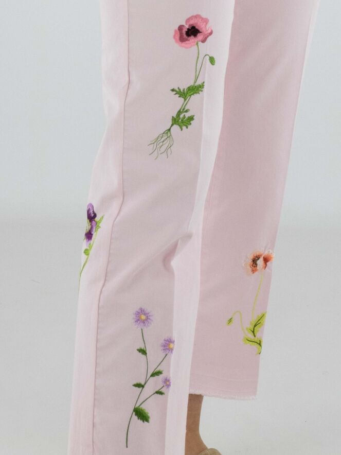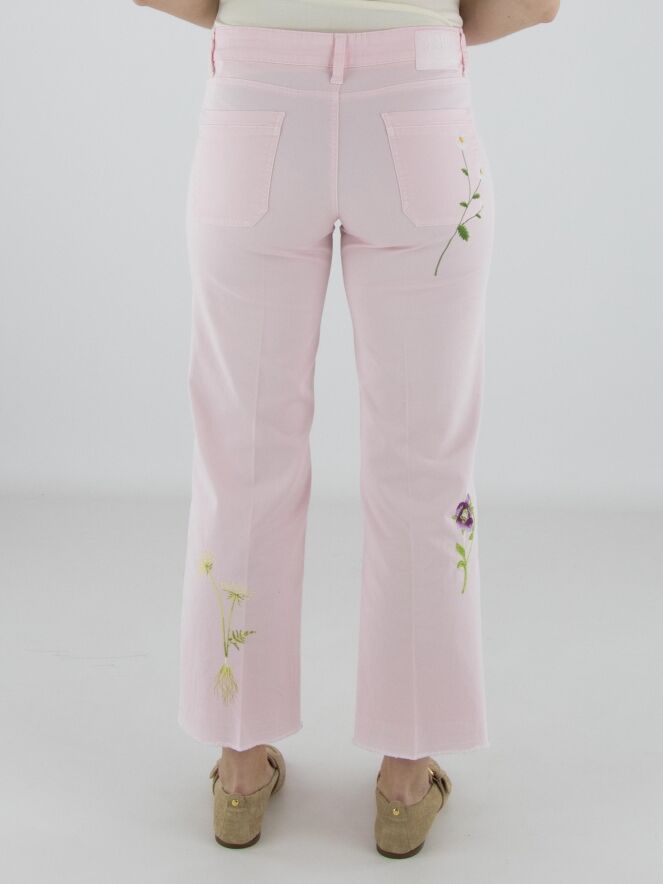 Jeans van Cambio in een zachte pastelroze tint. Aan de voorzijde, net onder de taille, zijn twee decoratieve zakjes aangebracht die het ontwerp een speels accent geven. Op de pijpen zijn meerdere bloemen geborduurd, wat zorgt voor een verfijnd en vrouwelijk detail. In het midden van de pijpen is een ingestreken plooi verwerkt voor een elegante uitstraling. Deze broek kan op 30 graden worden gewassen.