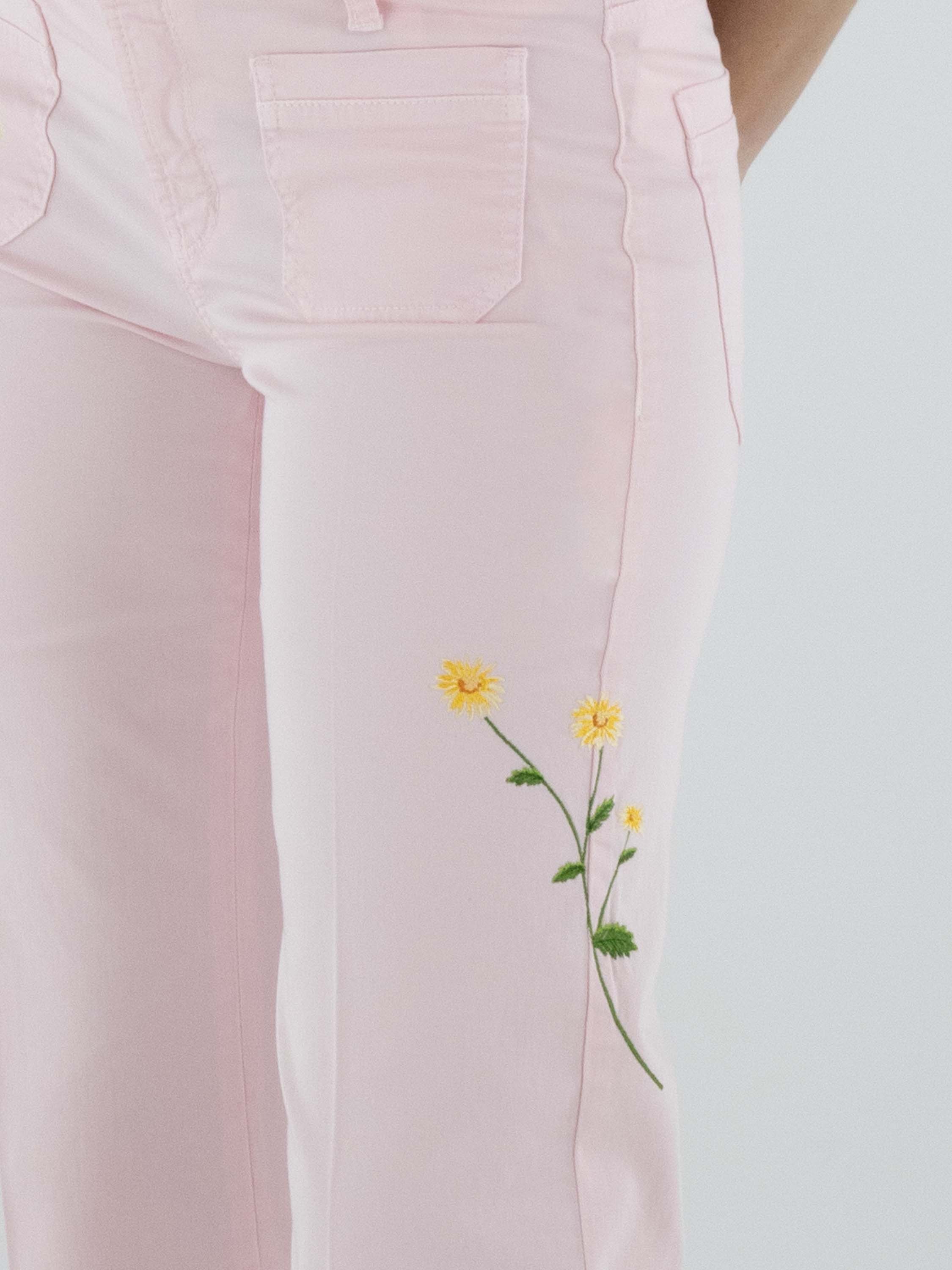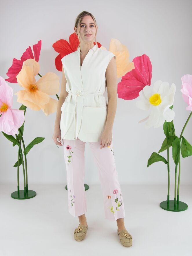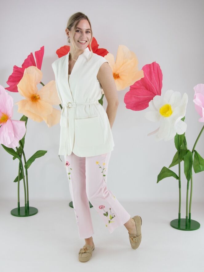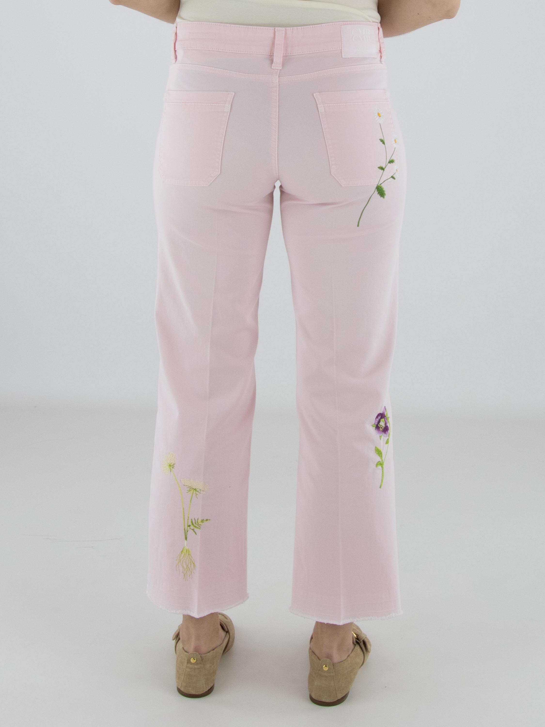 Jeans van Cambio in een zachte pastelroze tint. Aan de voorzijde, net onder de taille, zijn twee decoratieve zakjes aangebracht die het ontwerp een speels accent geven. Op de pijpen zijn meerdere bloemen geborduurd, wat zorgt voor een verfijnd en vrouwelijk detail. In het midden van de pijpen is een ingestreken plooi verwerkt voor een elegante uitstraling. Deze broek kan op 30 graden worden gewassen.