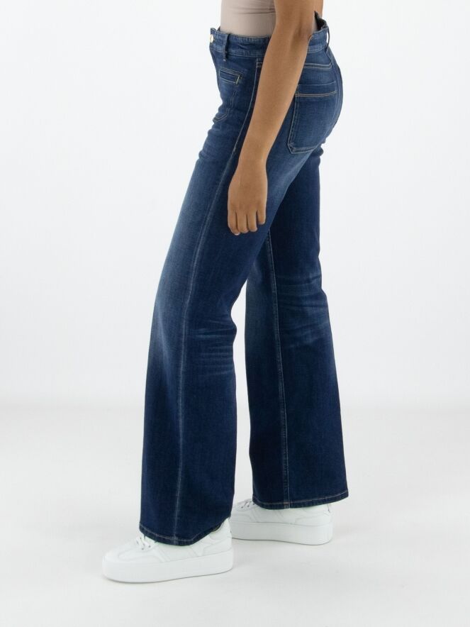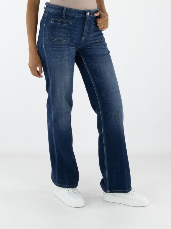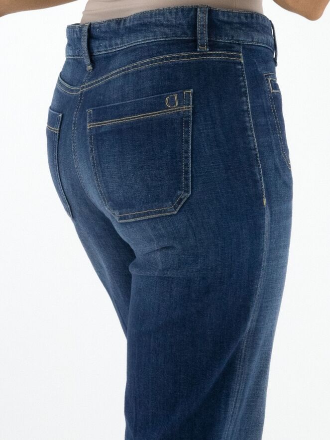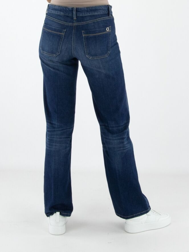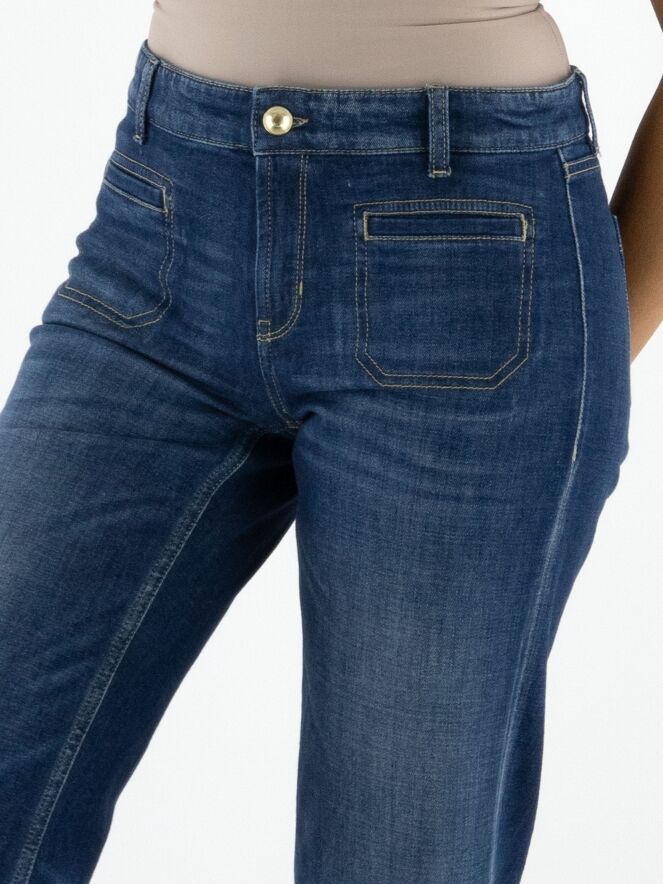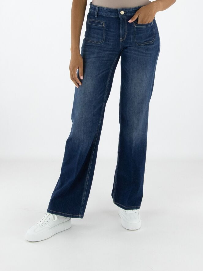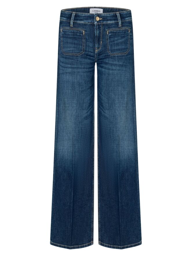 Een gewassen jeans van Cambio in een basic jeanskleur. De jeans is recht gesneden. Aan de voorkant zitten twee kleine zakken. Deze jeans mag op 30 graden worden gewassen.