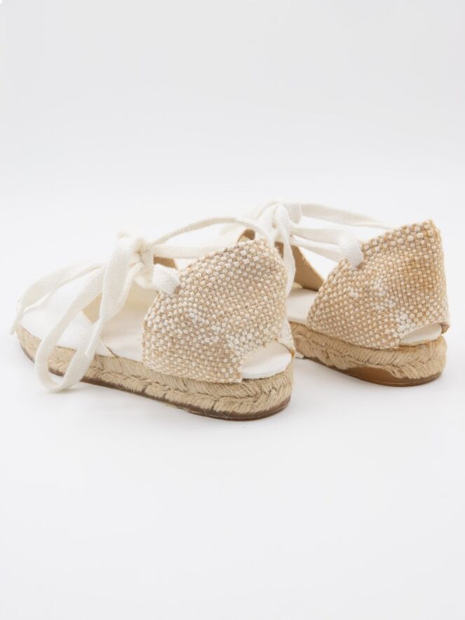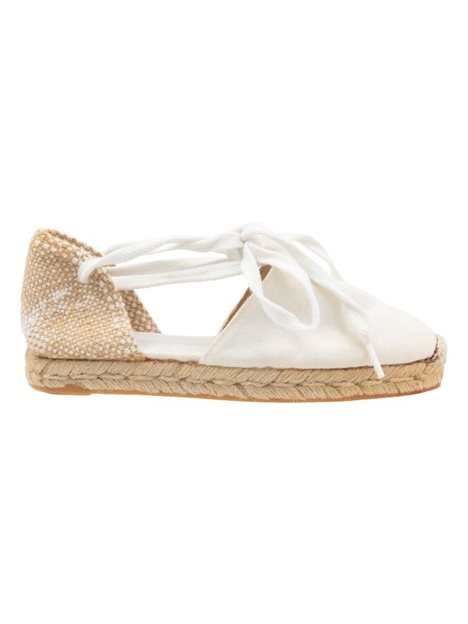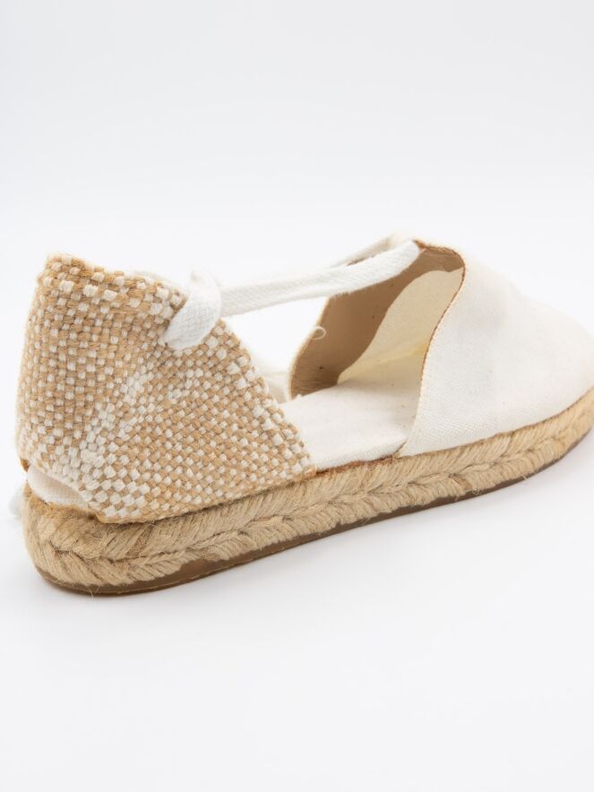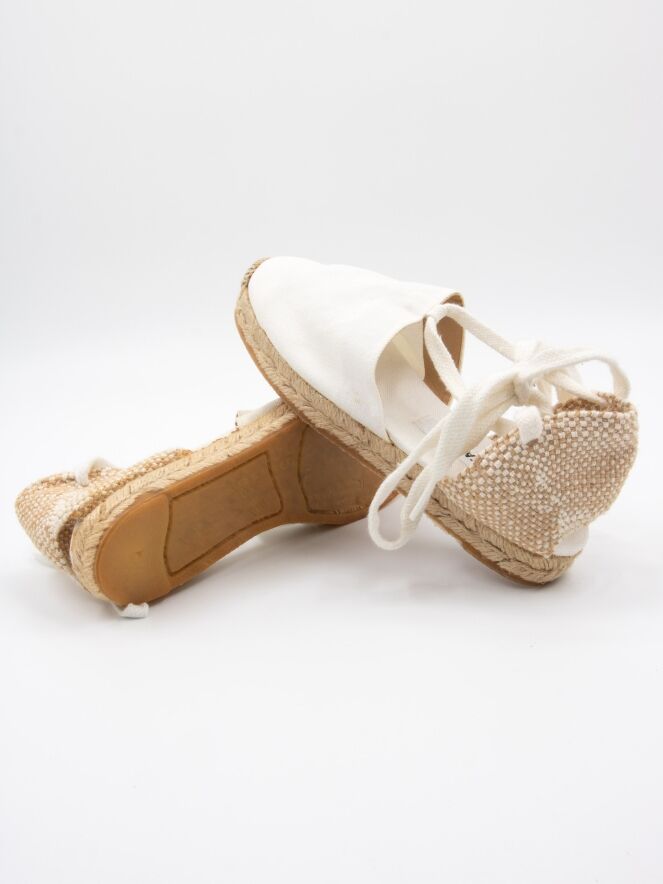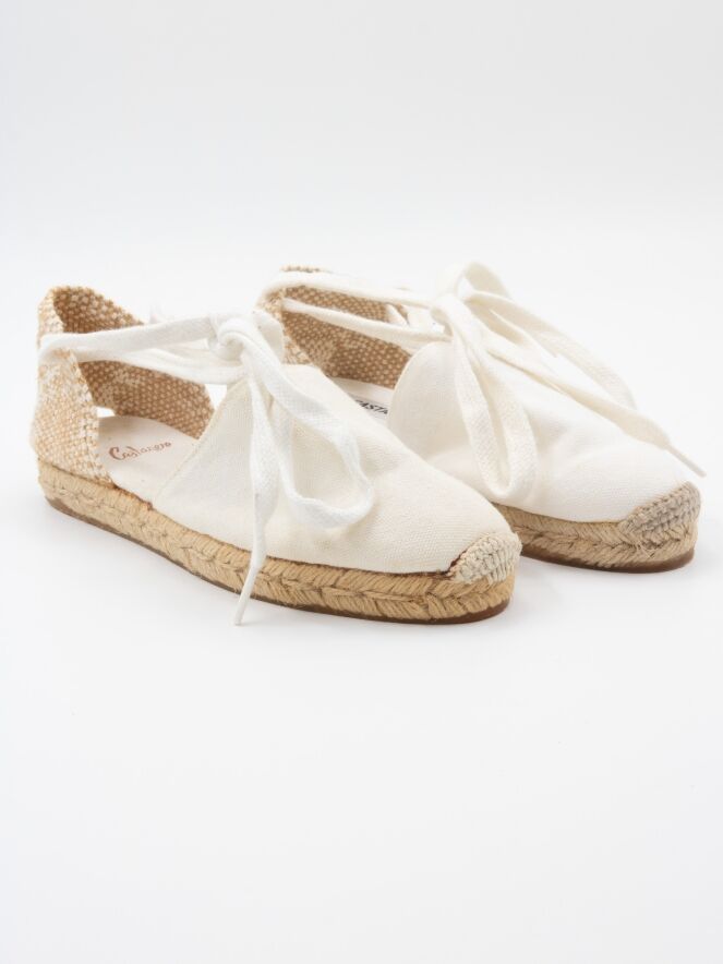 Een platte espadrille van Castagner in de kleur roomwit. De hielband is gevlochten in de kleuren wit en beige.