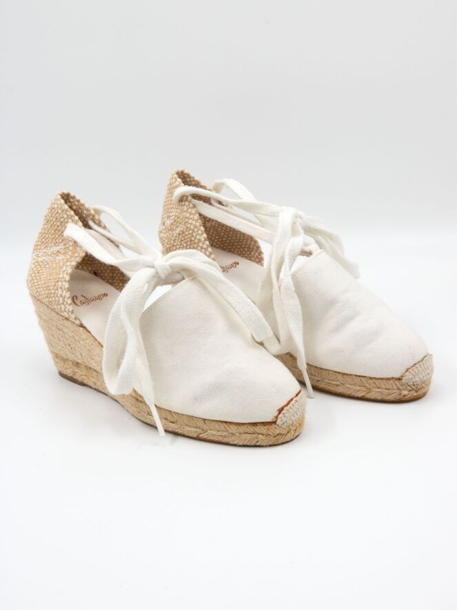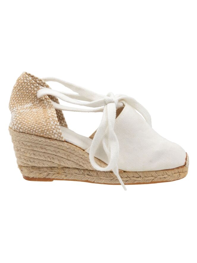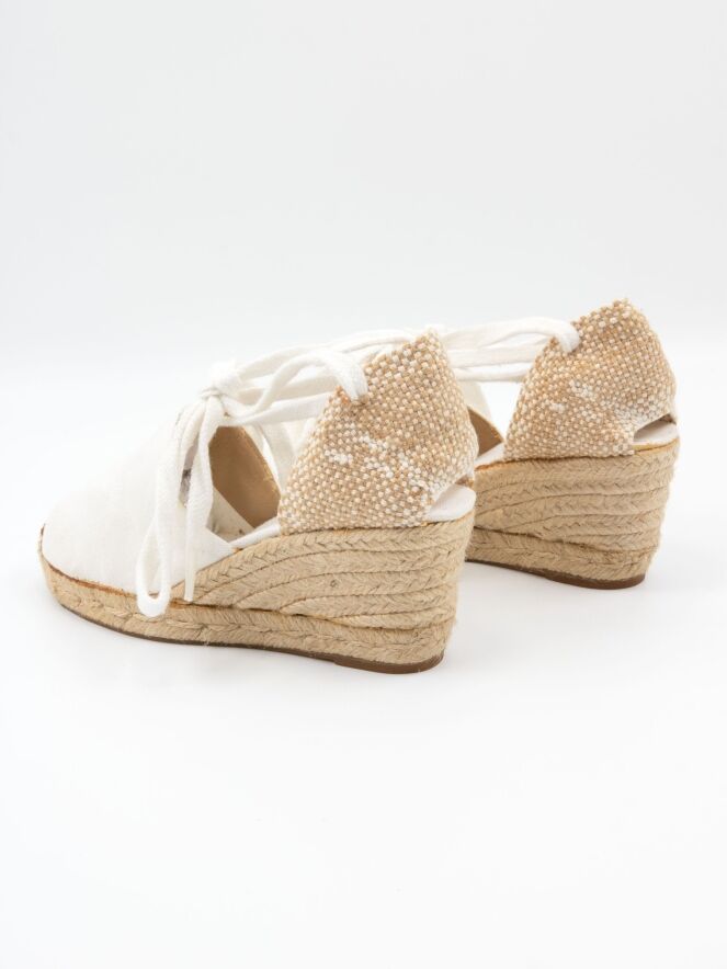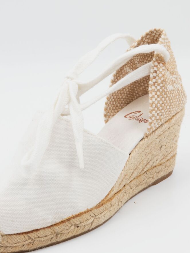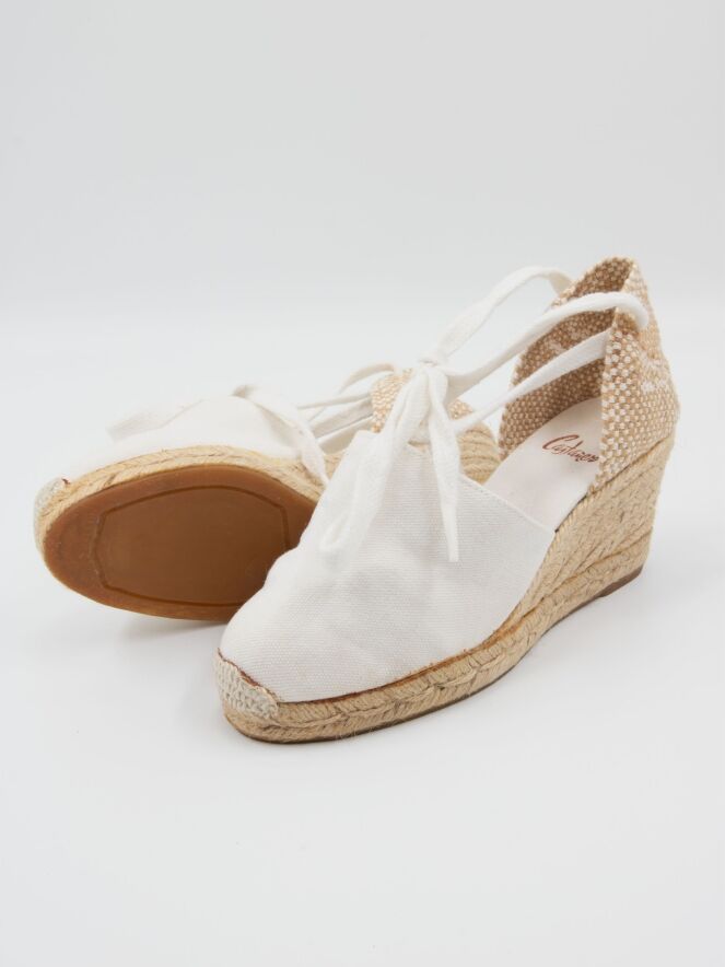 Een espadrille van Castagner met een middelhoge sleehak in de kleur roomwit. De hielband is gevlochten in wit en beige.