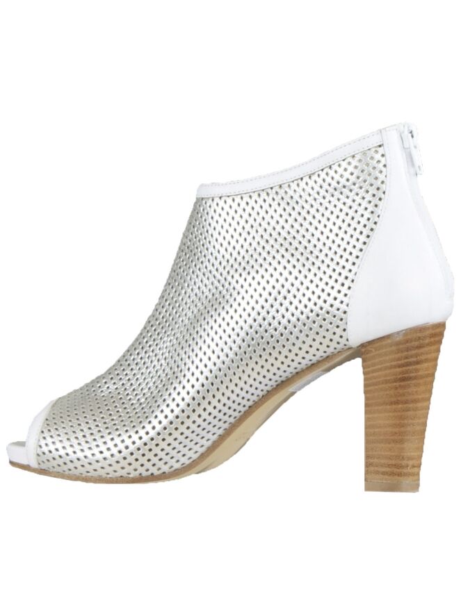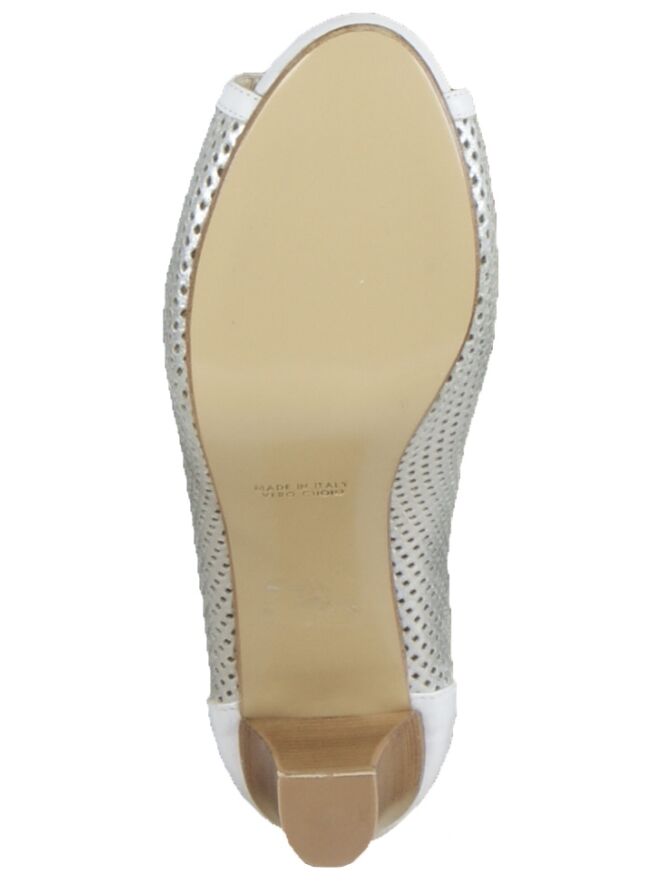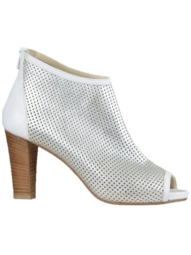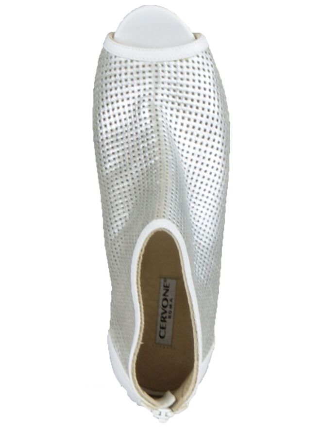Een pump van het merk Cervone in de kleur zilver. Het leder is in een fijn geperforeerd leder. De houten hak is slank gesneden. Op de hiel is een ritsje verwerkt. De schoen is aan de binnenzijde gevoerd met leder.