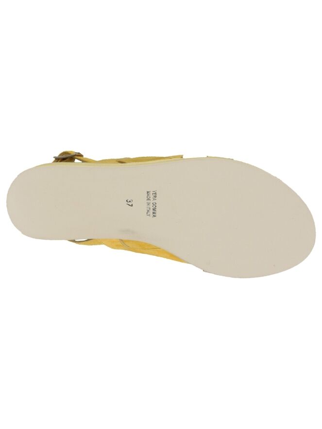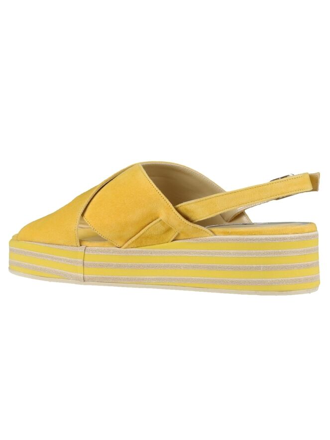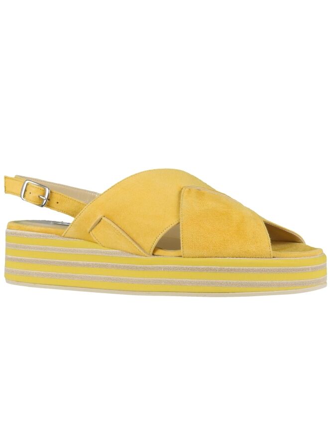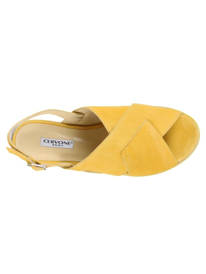 Een sandaal op een plateauzool van Cervone in de kleur okergeel. over de voorvoet zijn 2 brede gekruiste banden. Het hielbandje is verstelbaar. De plateauzool is opgebouwd in meerdere lagen met de kleuren okergeel en camel.