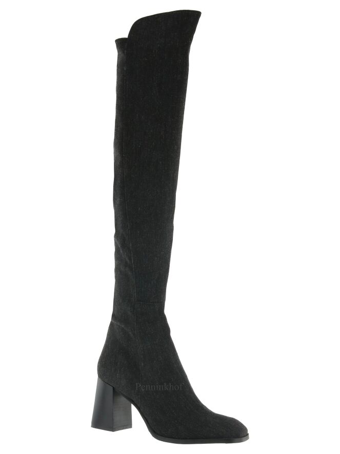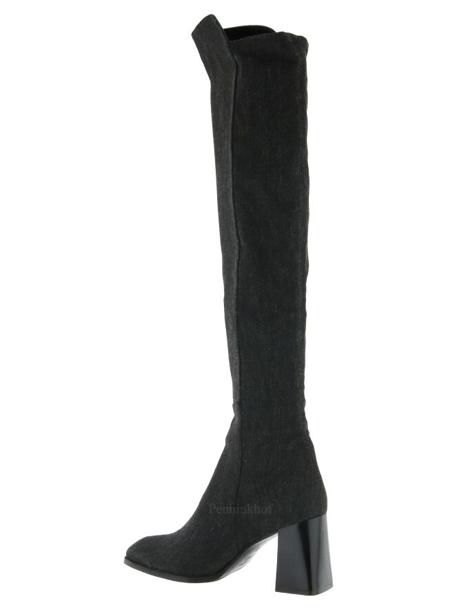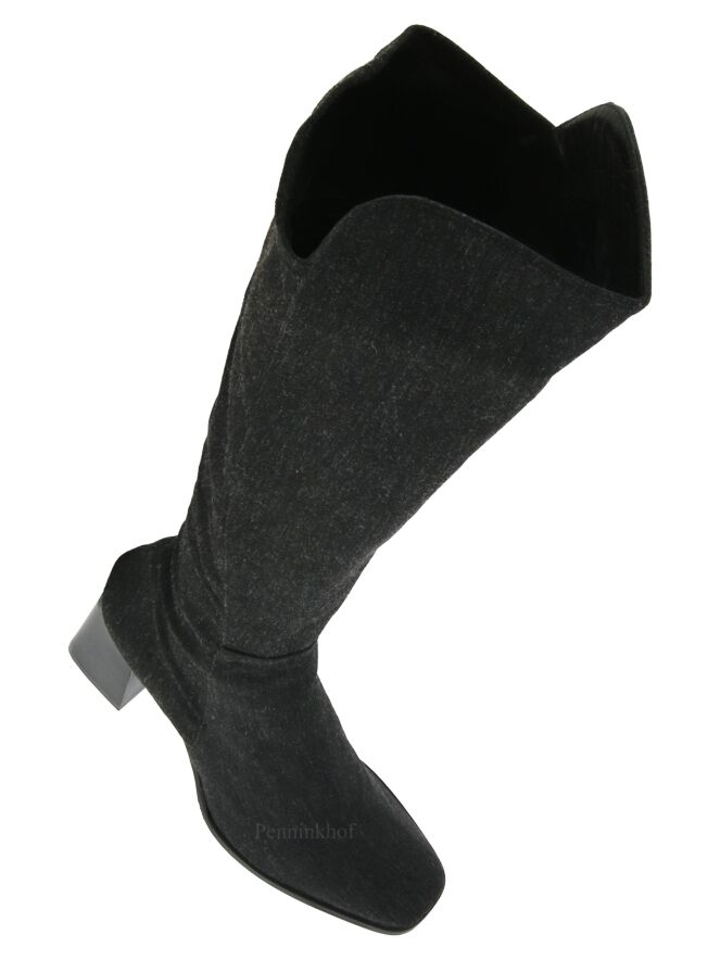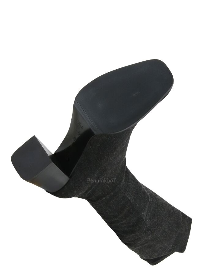 Een slanke hoge laars van Cervone in een gemêleerde antraciet kleurige stof. De stof is elastisch en valt aangesloten om het been. De laars heeft een houten blokhak. De schacht is deels gevoerd met leder.