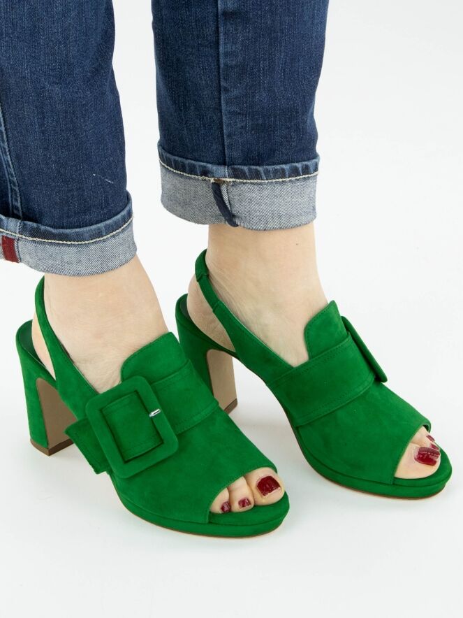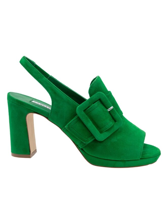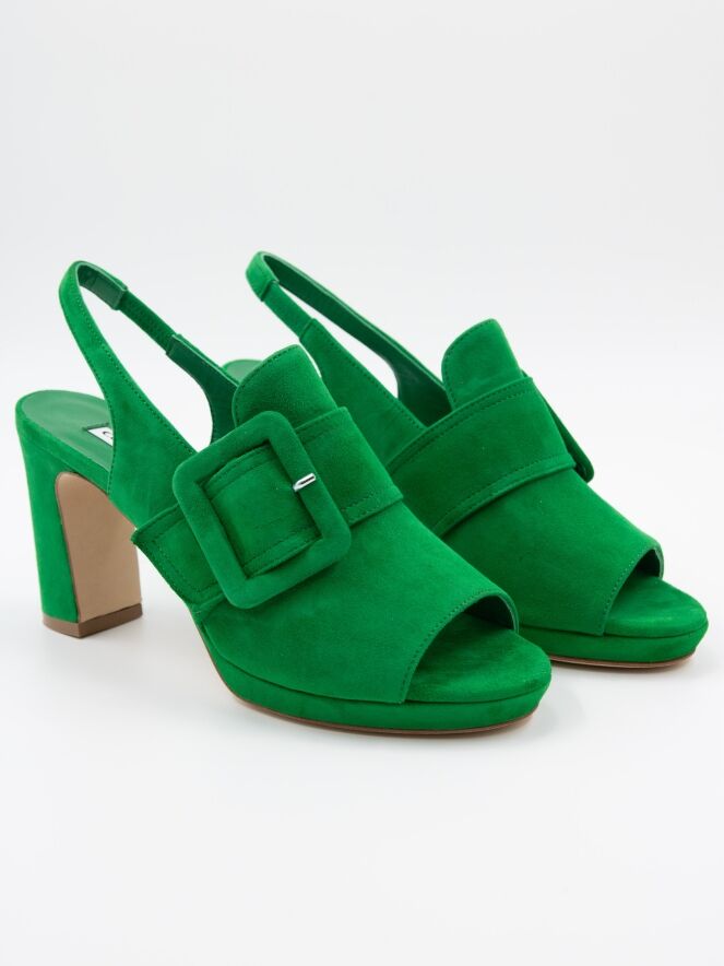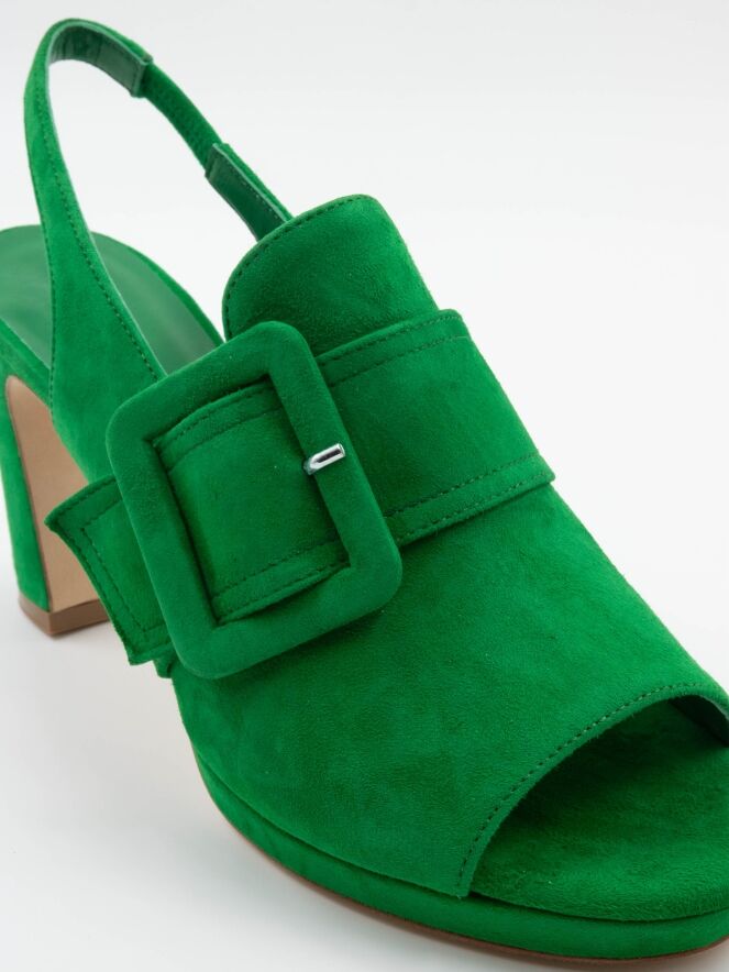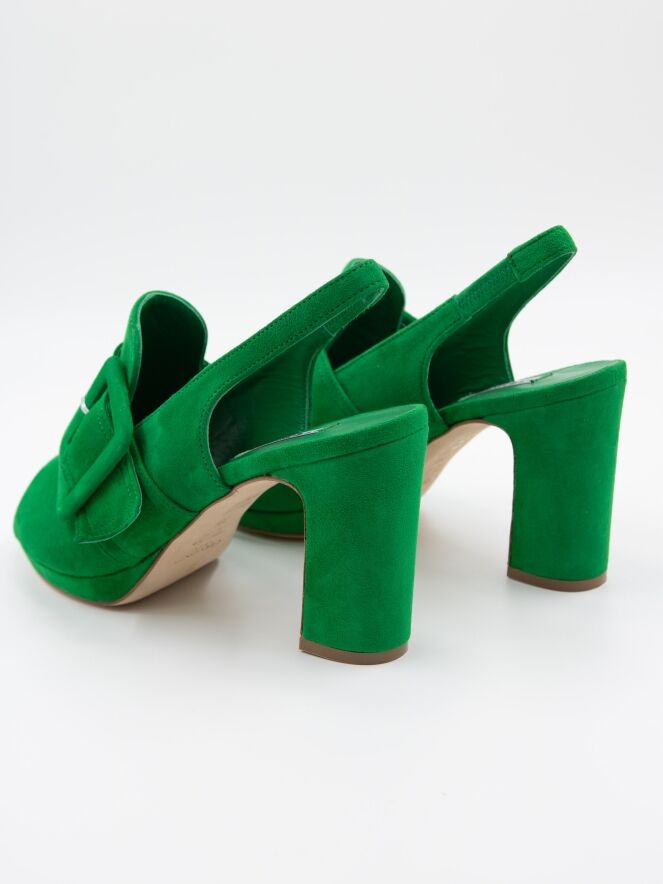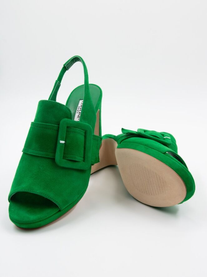Een open pump van Cervone in een groene kleur. Over de voorvoet is een grote rechthoekige gesp in dezelfde kleur als de schoen. De pump heeft een open neus en het hielbandje heeft een elastisch deel.