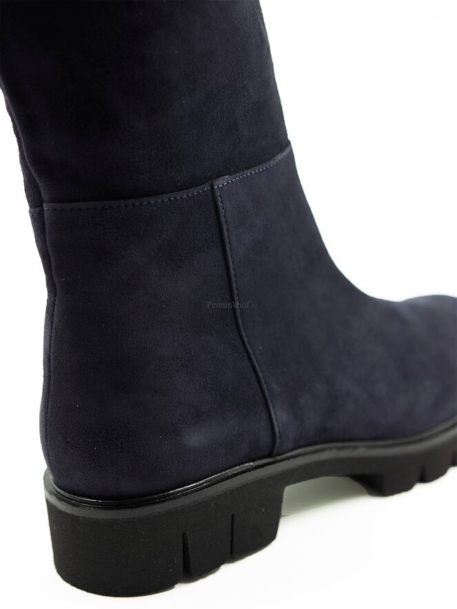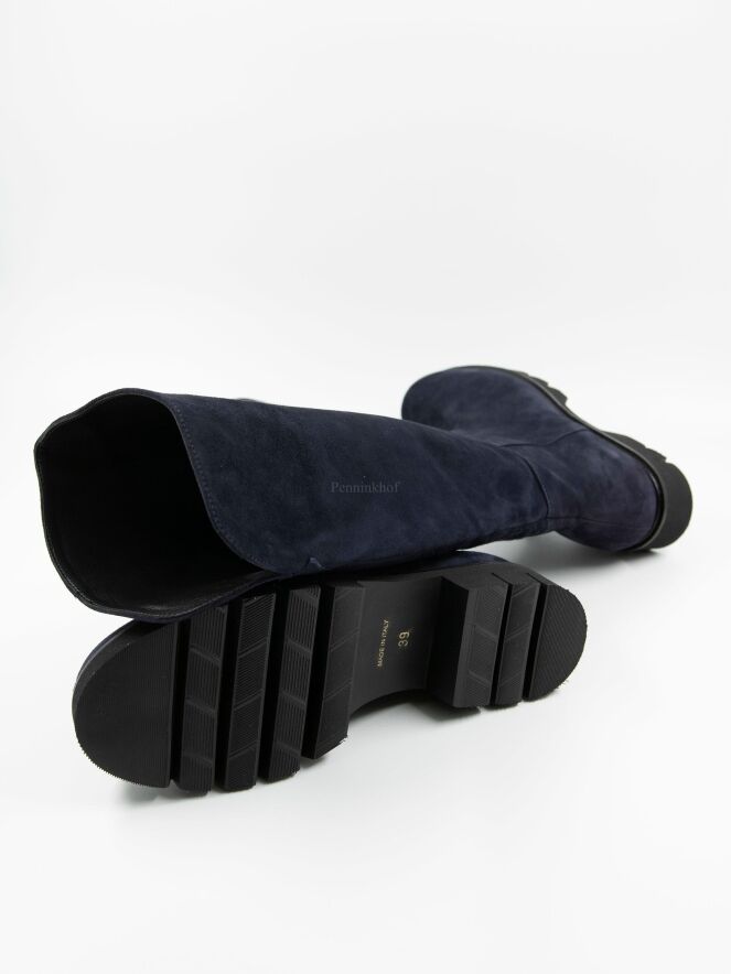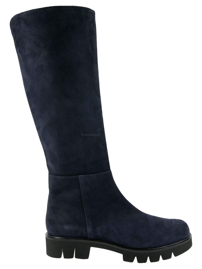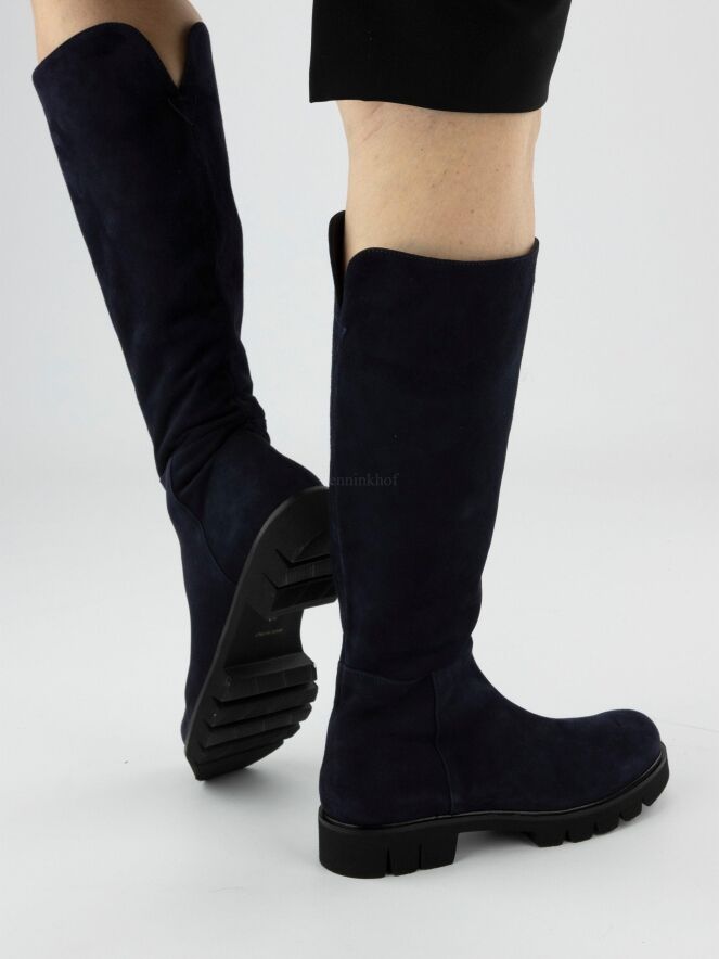 Een hoge laars van Cervone in de kleur marineblauw. De laars heeft een ronde neus en aan de binnenzijde is een rits tot halverwege de kuit. De laars is aan de binnenkant gevoerd met leder.