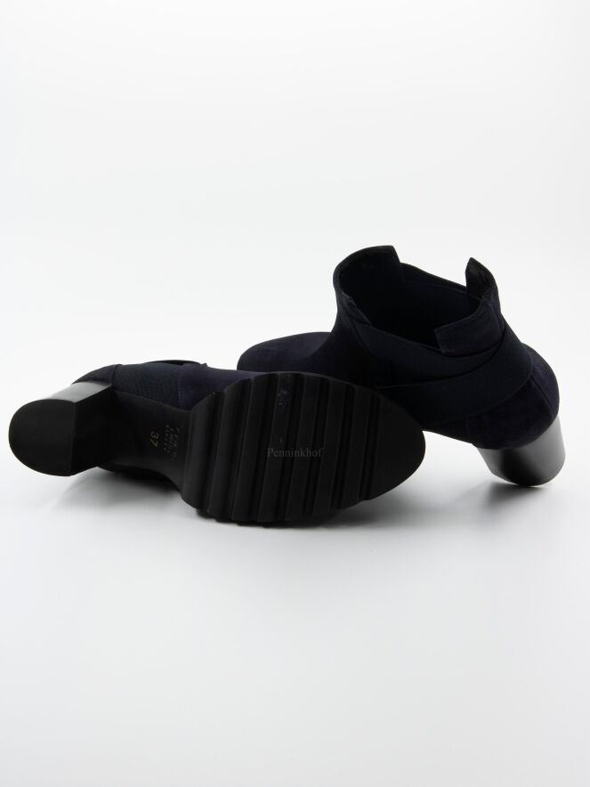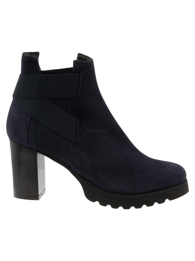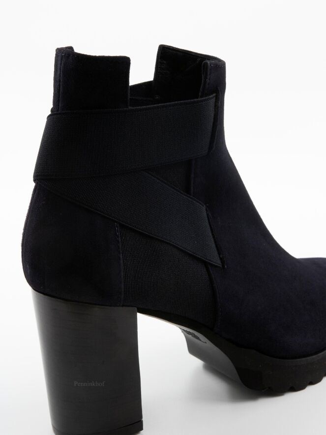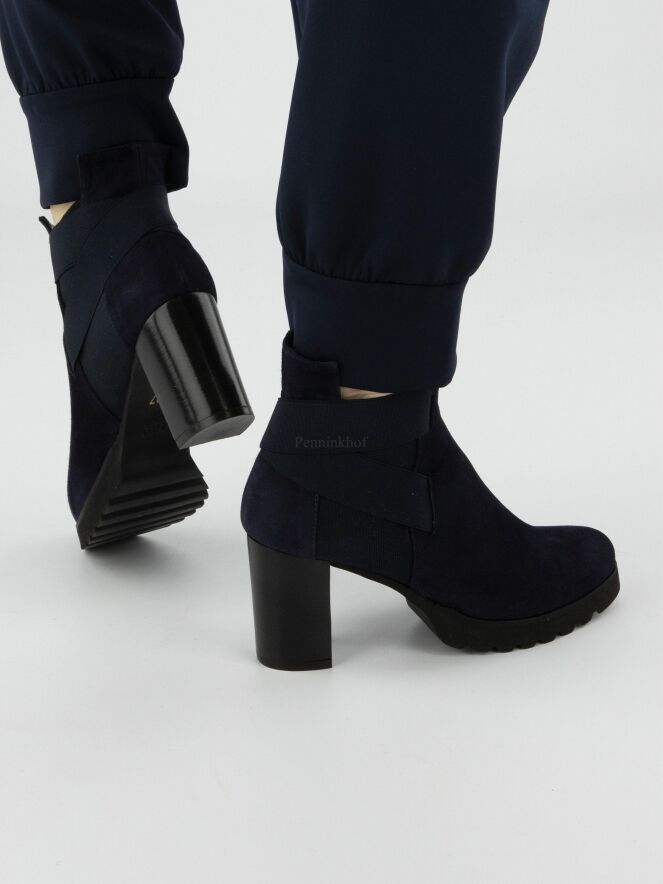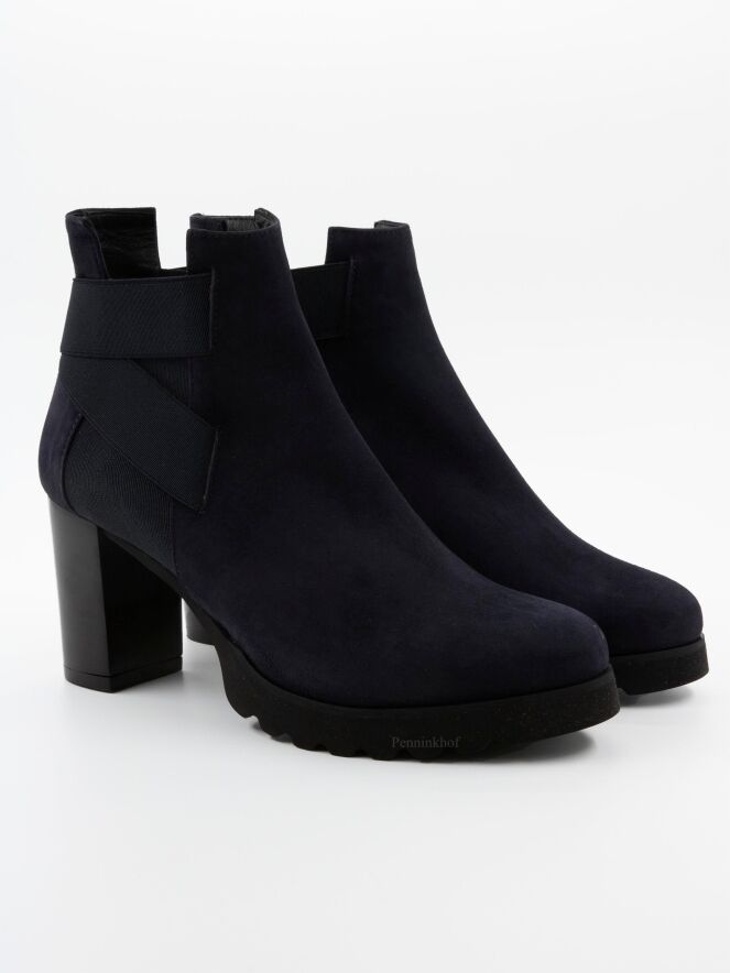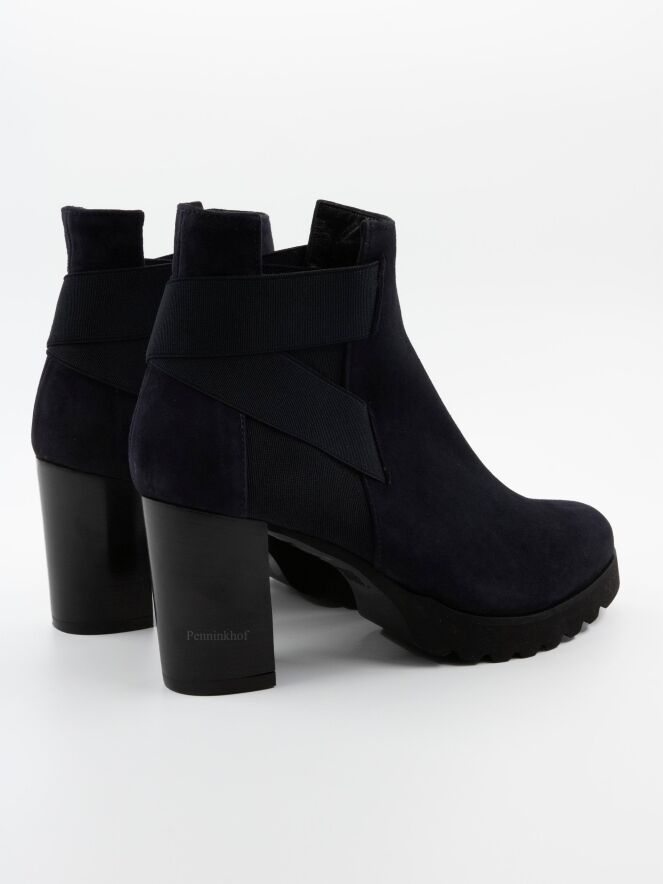 Een kort laarsje van Cervone in de kleur marineblauw. Aan beide kanten van de schacht is een elastieken stof met 2 extra elastieken banden. De lage plateauzool is geribbeld. De binnenkant is met leder gevoerd.