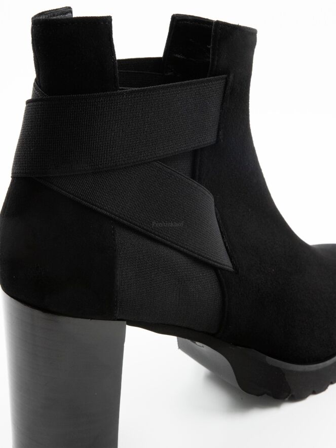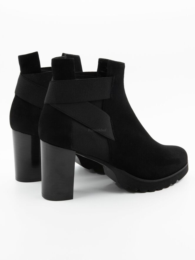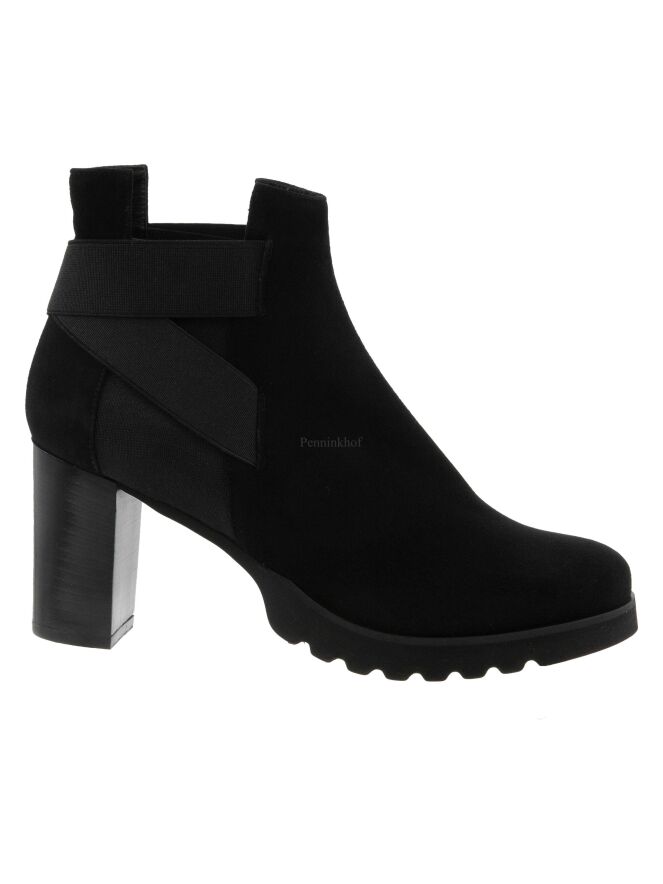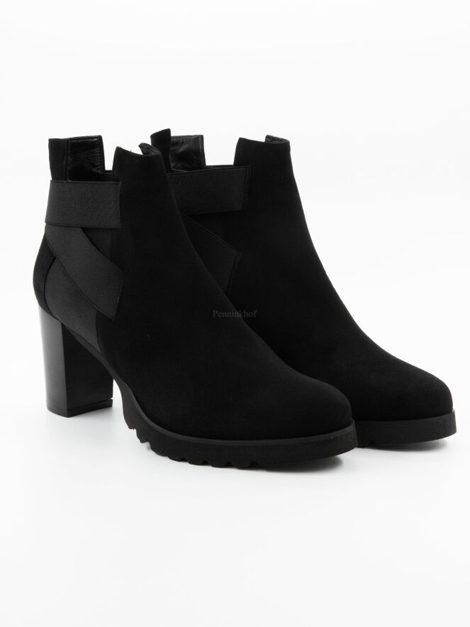 Een kort laarsje van Cervone in de kleur zwart. Aan beide kanten van de schacht is een elastieken stof met 2 extra elastieken banden. De lage plateauzool is geribbeld. De binnenkant is met leder gevoerd.
