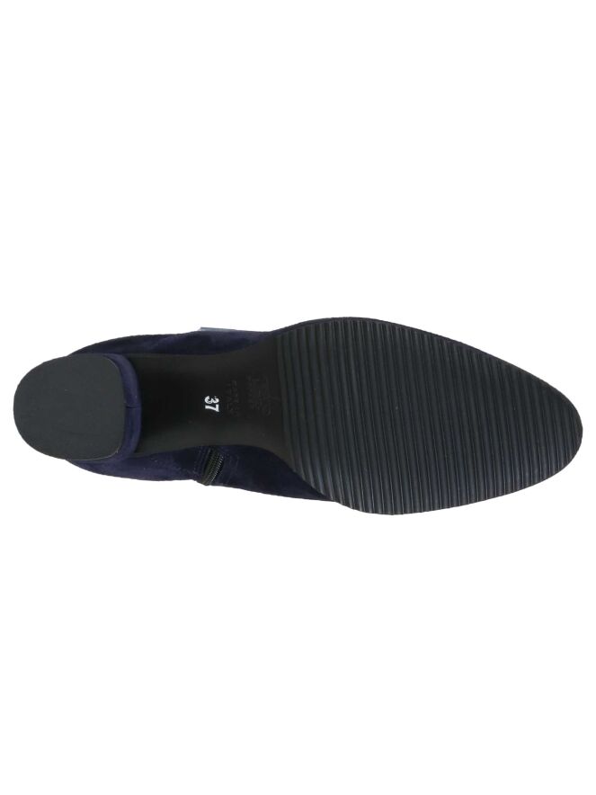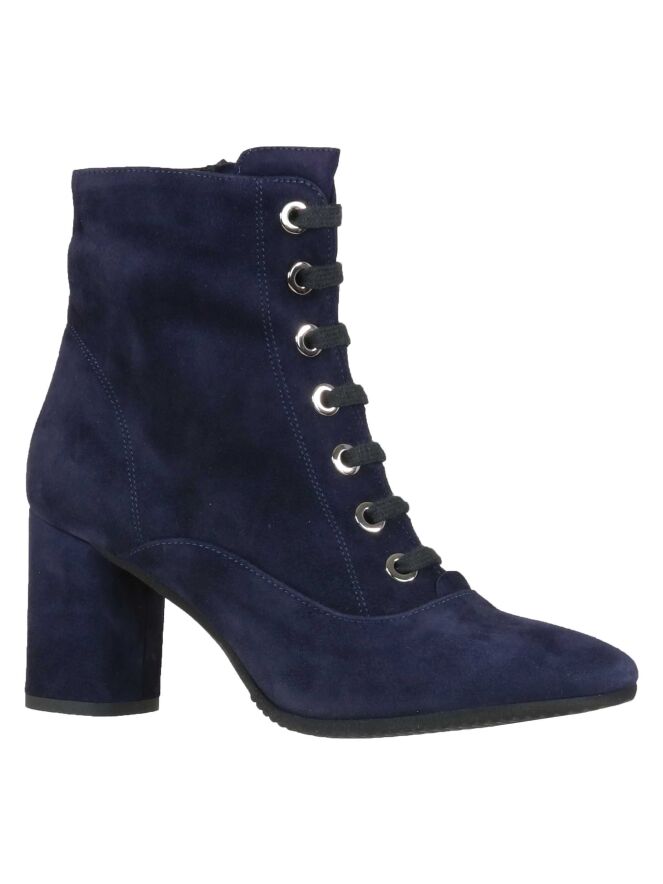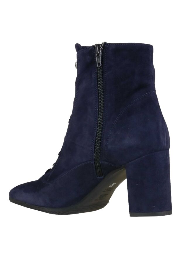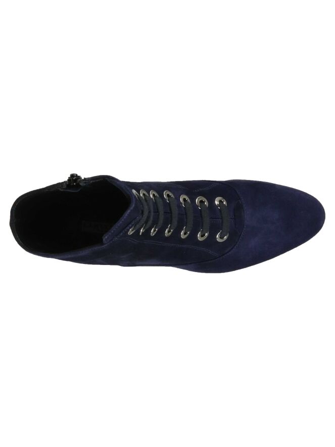 Een enkellaarsje van Cervone in een indigo blauwe kleur. Het laarsje is in een old school model en heeft een slanke neus en een ronde blokhak die in hetzelfde materiaal als het laarsje is bekleed. Het laarsje heeft een valse veter met zilver kleurige ringen bij de inzet. De binnenkant is met leder gevoerd.