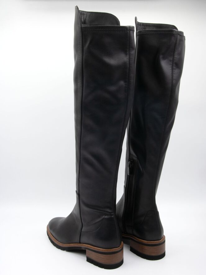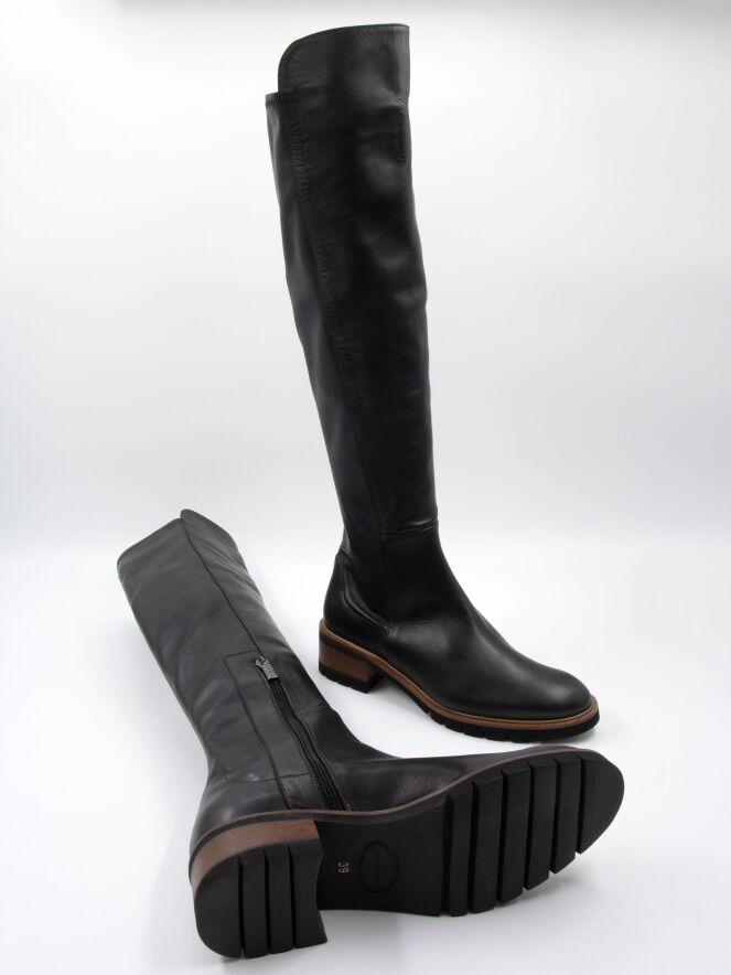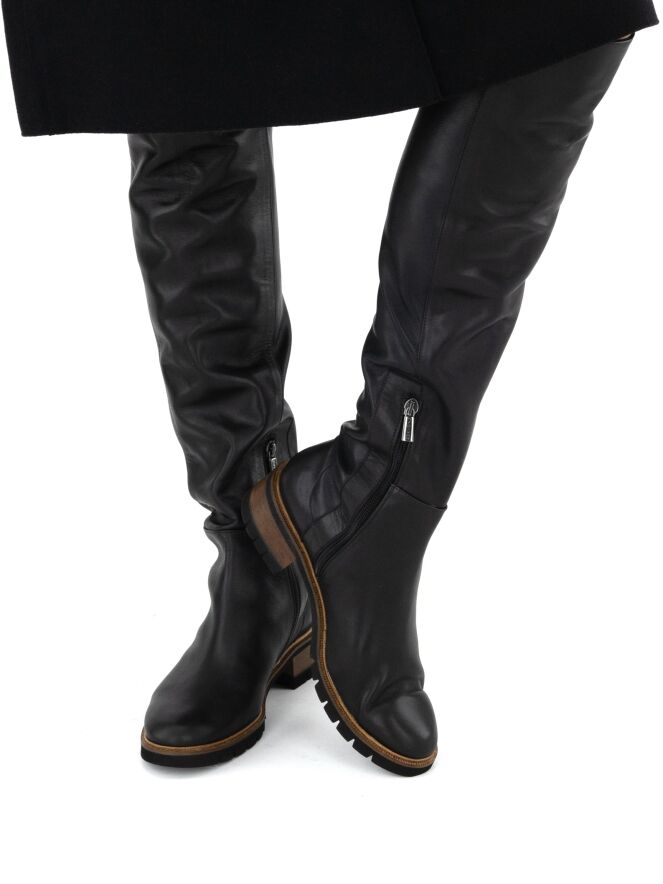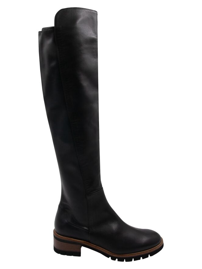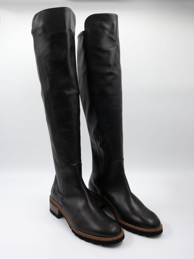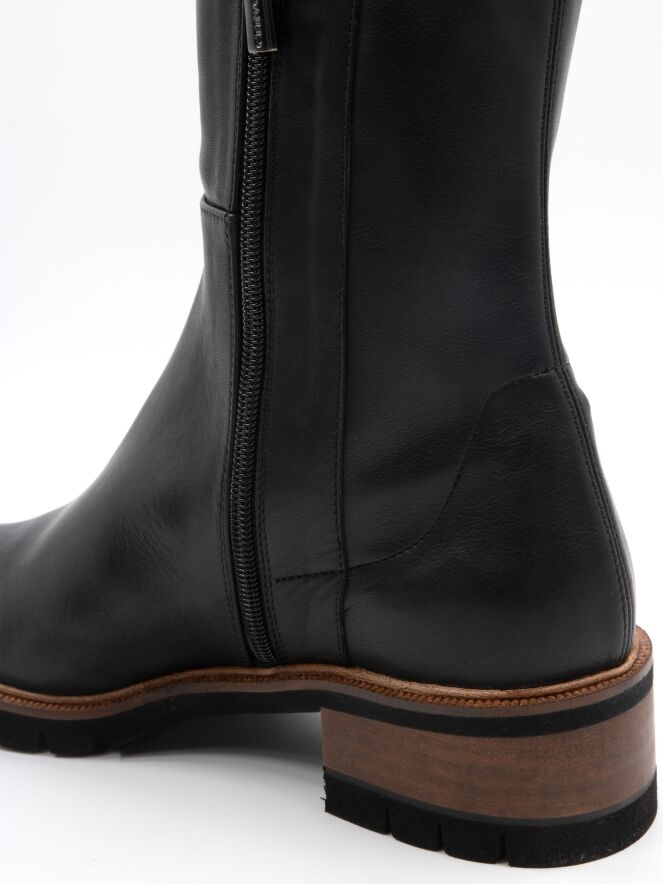 Een hoge knielaars van Cervone in zacht mat leer in de kleur zwart. Langs de rand van de zool is een smalle decoratieve pitrand in de kleur cognac. De hak is deels in een houtkleur en deels in de kleur zwart. Aan de binnenzijde is een rits vanaf de onderkant tot ruim boven de enkel.