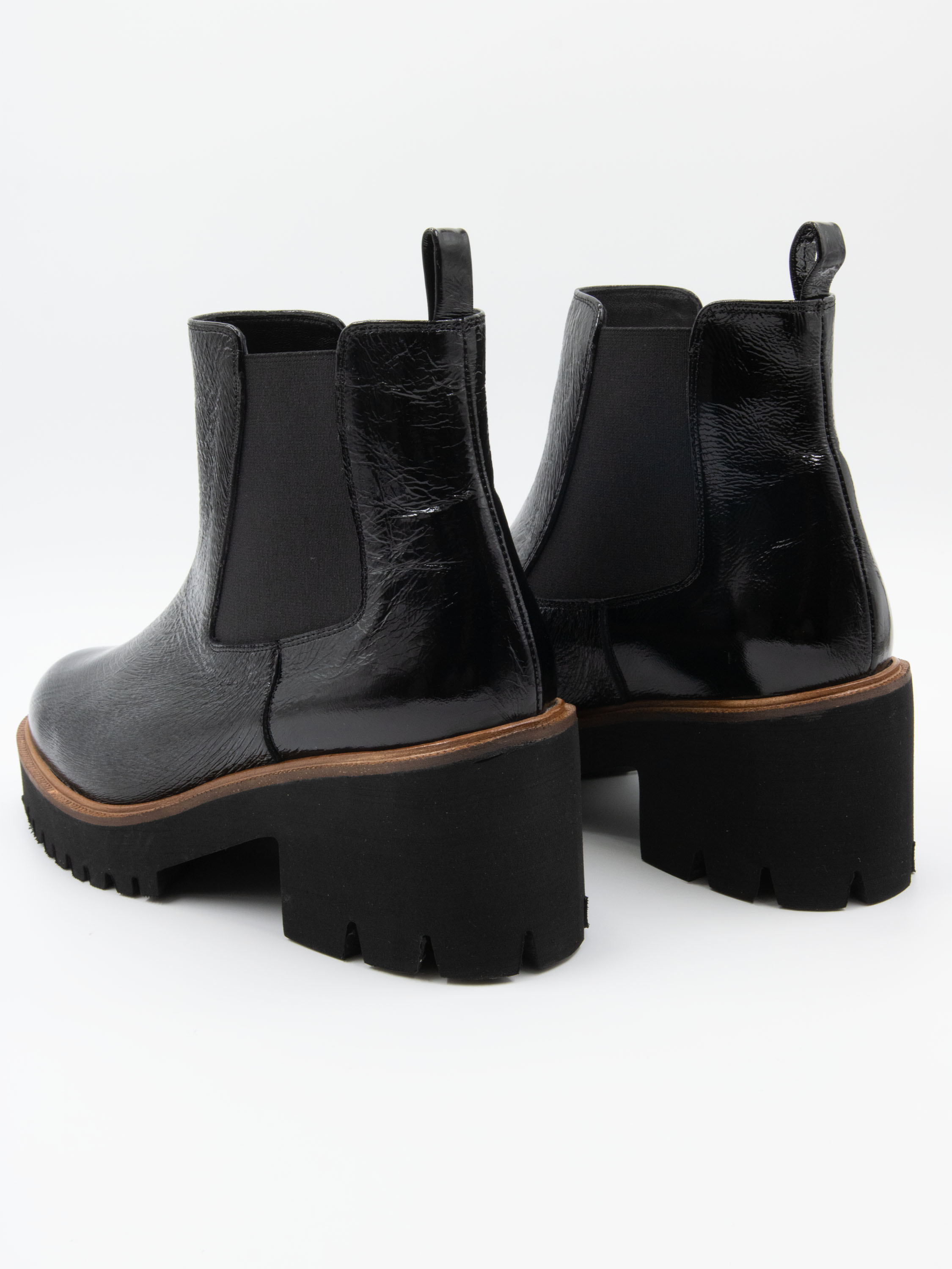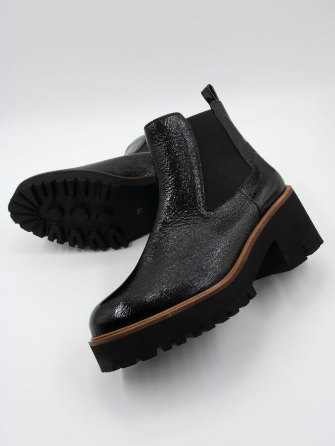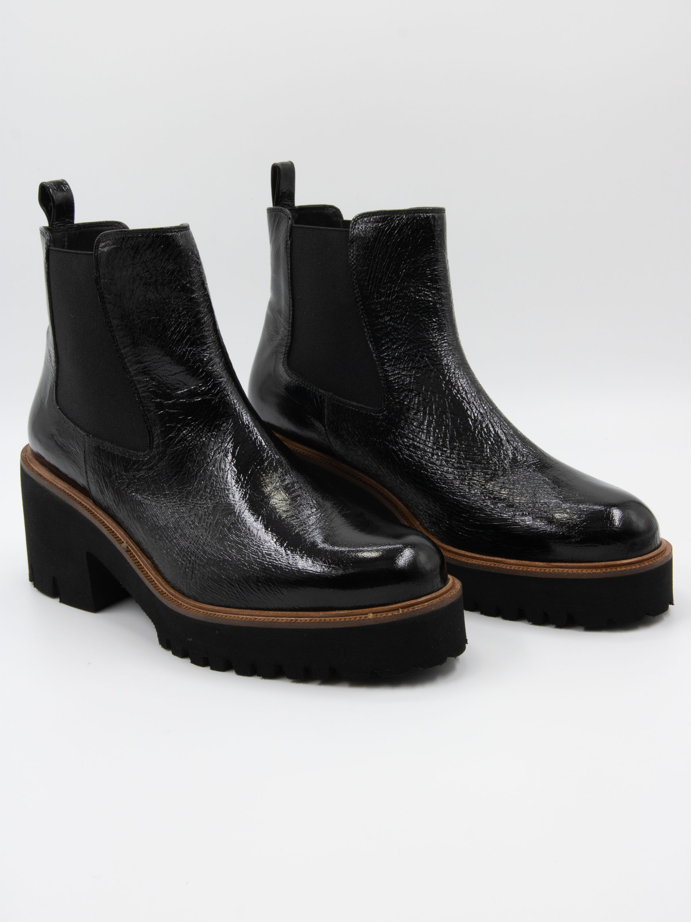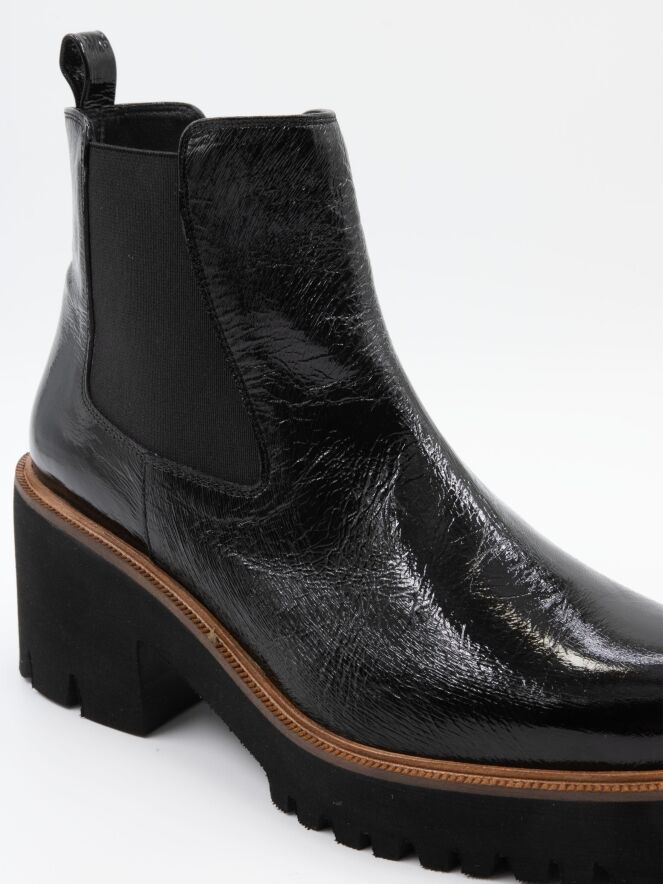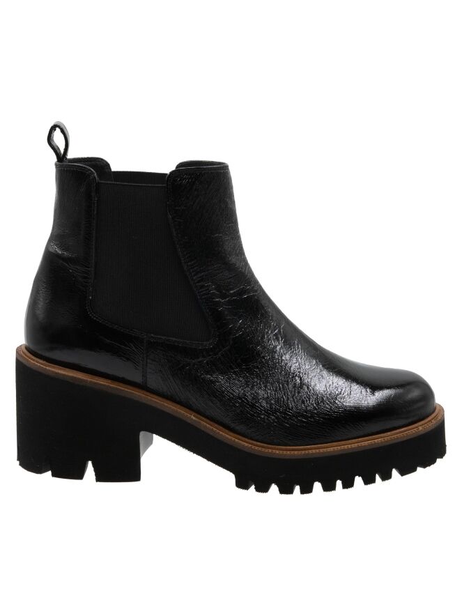 Een enkellaarsje van Cervone in een kreuklak kwaliteit in de kleur zwart. Langs de rand van de zool is een smalle decoratieve pitrand. In de zijkanten van de schacht is elastiek. De sportieve zool met de blokhak is gekarteld. De binnenkant van het laarsje is met leder gevoerd.