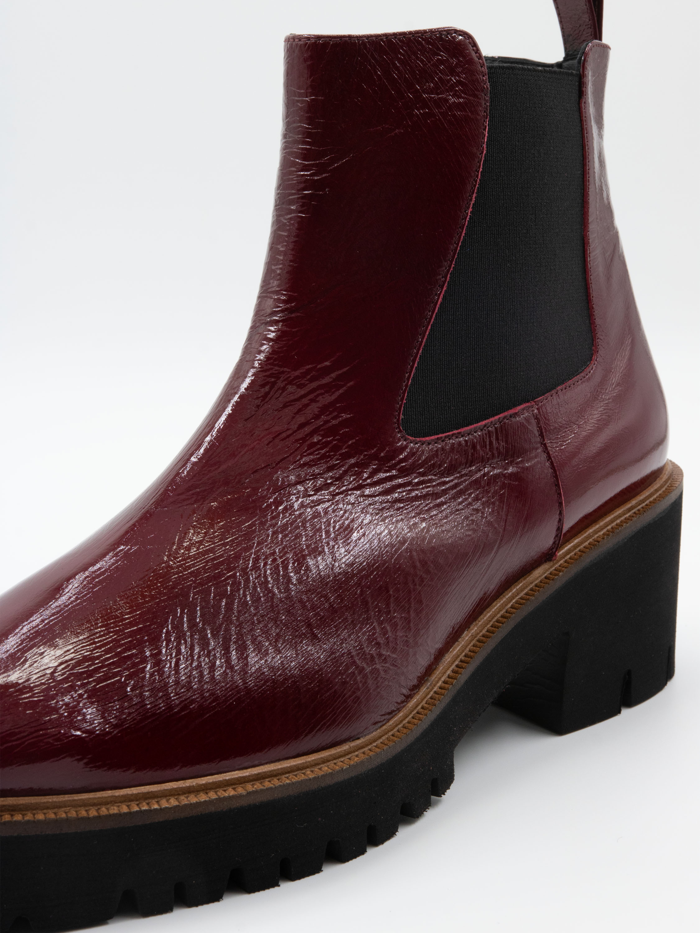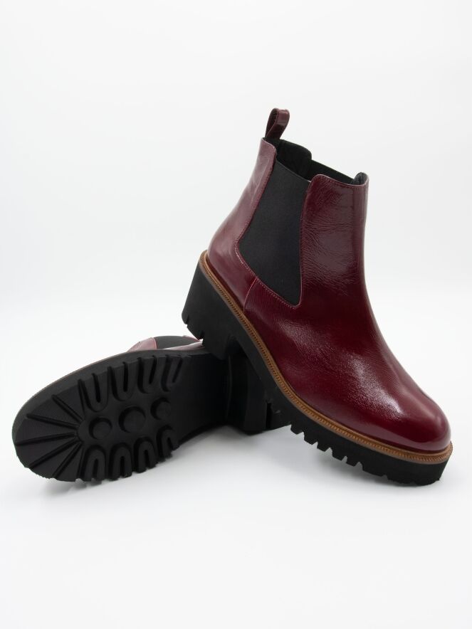 Een enkellaarsje van Cervone in een kreuklak kwaliteit in de kleur bordeauxrood. Langs de rand van de zool is een smalle decoratieve pitrand. In de zijkanten van de schacht is elastiek. De sportieve zool met de blokhak is gekarteld. De binnenkant van het laarsje is met leder gevoerd.