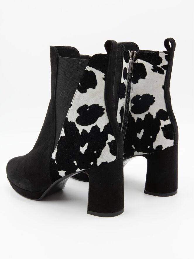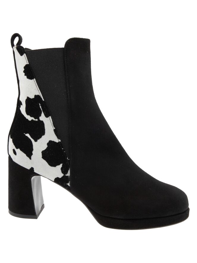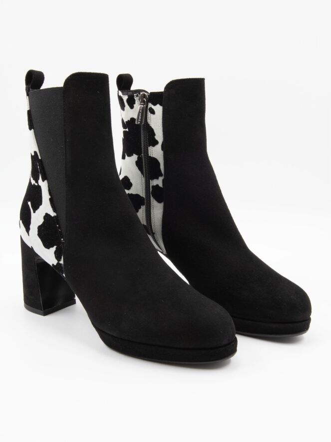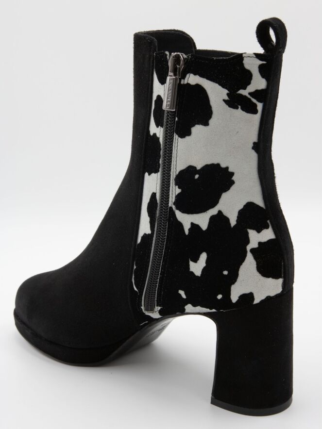 Een enkellaarsje van het merk Cervone in de kleur zwart met bij de hiel een gevlekte zwart en wit print.Het laarsje heeft een slanke ronde neus en een stoere blokhak die in hetzelfde zwarte materiaal als het laarsje is bekleed. Aan de binnenzijde is een zwarte rits in de schacht De binnenkant is met leder gevoerd.