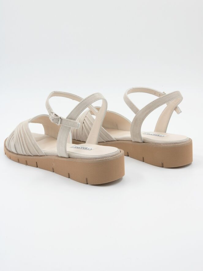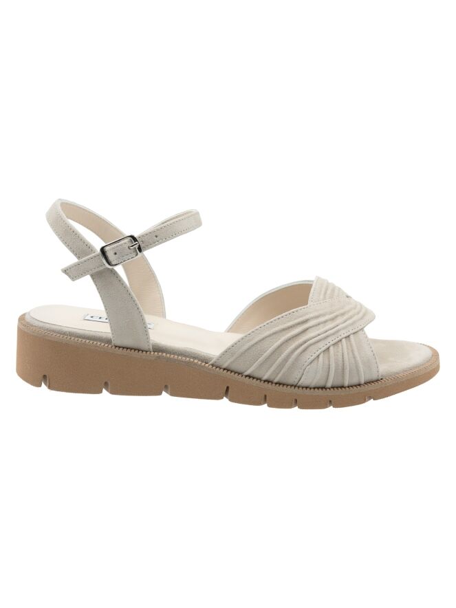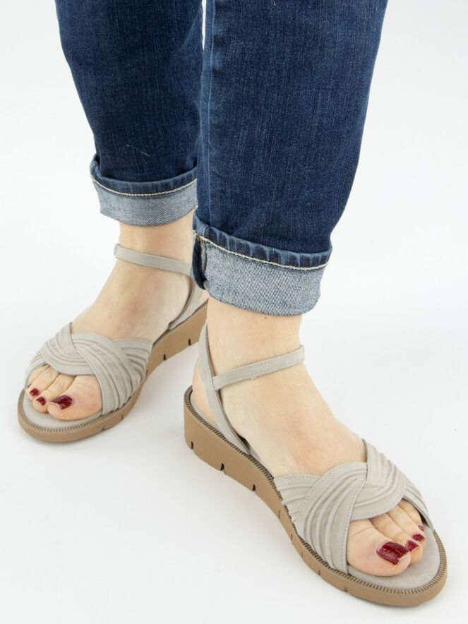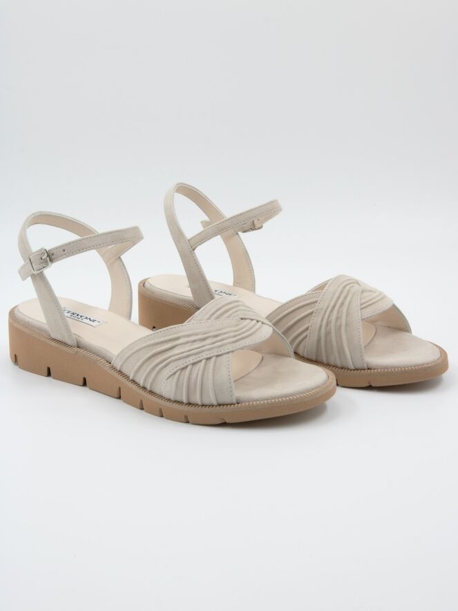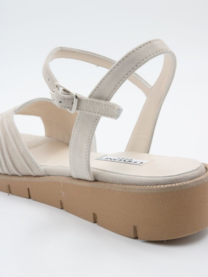 Een sandaal van Cervone in een beige kleur. De 2 geribbelde suède banden over de voorvoet zijn gekruist. Het enkelbandje is verstelbaar. De zool is in een zandkleur.