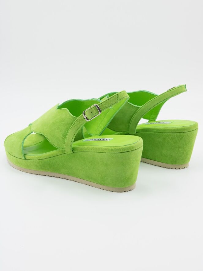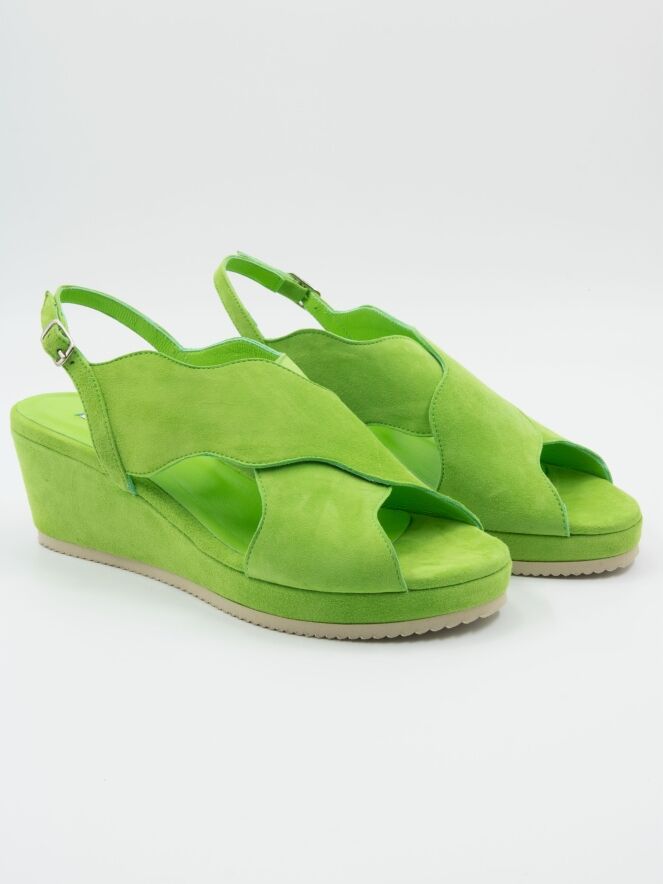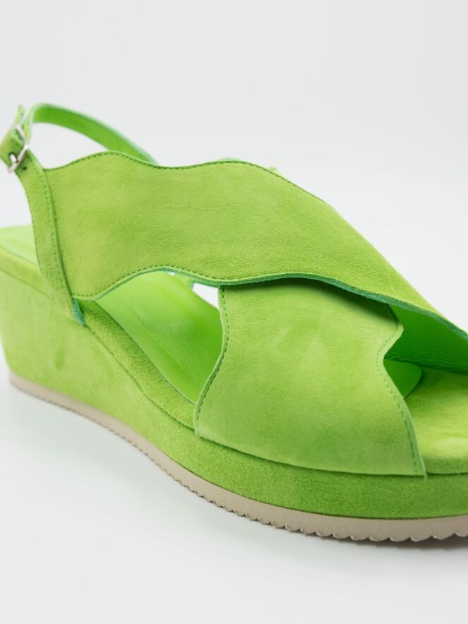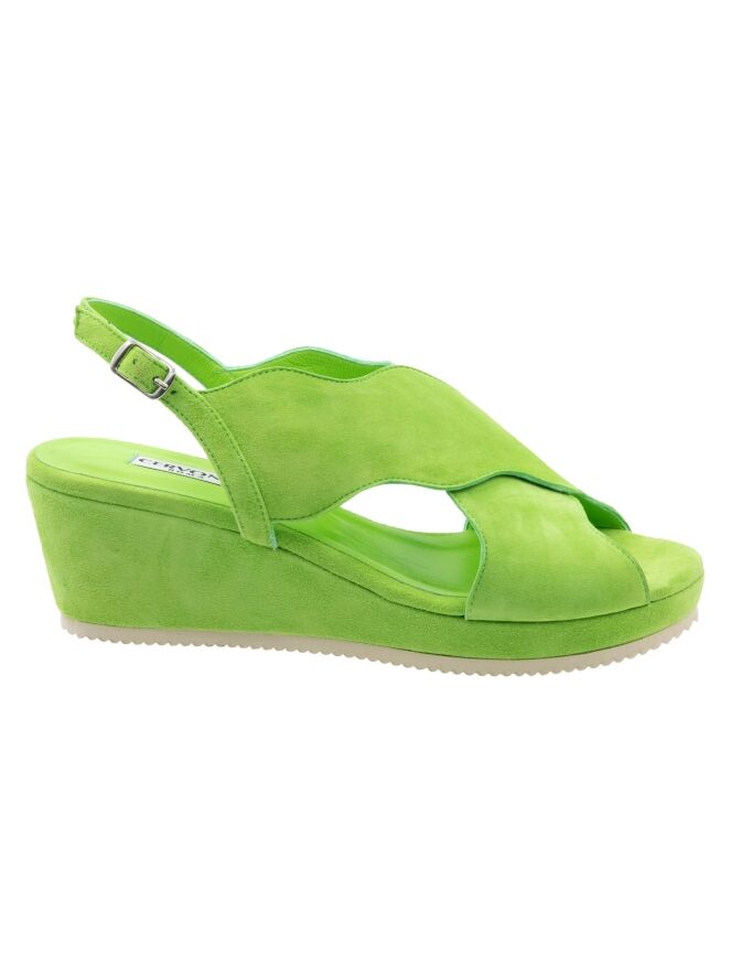Een open sandaal van Cervone in een lime of appelgroene kleur. De randen van de gekruiste band zijn in een golvende lijn. het hielbandje is verstelbaar.