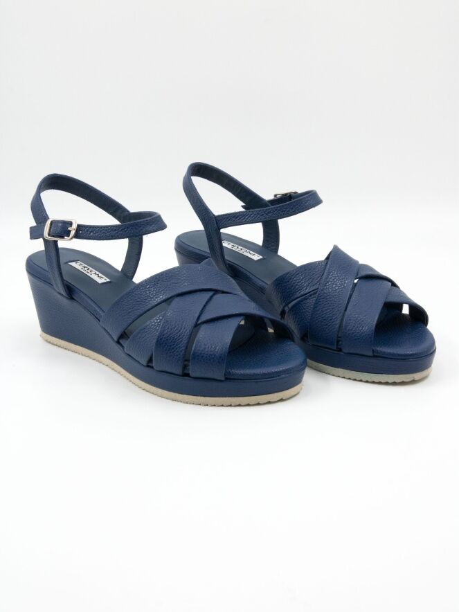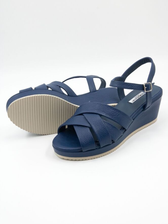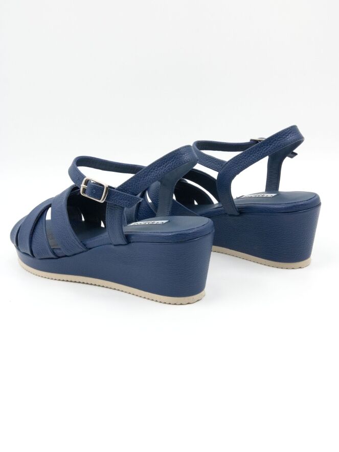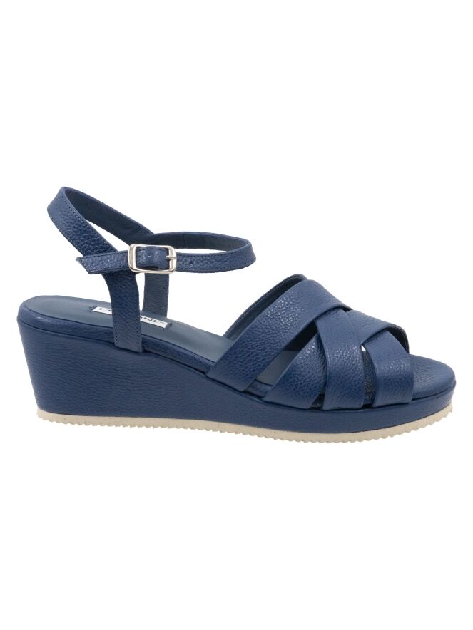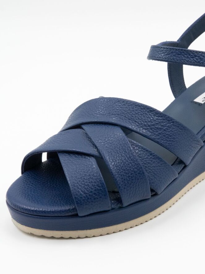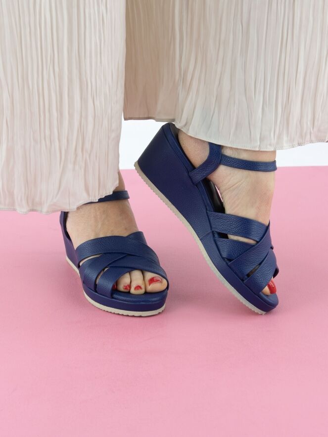 Een sandaal van Cervone in kobaltblauw. De sandaal heeft vijf gekruiste bandjes over de voorvoet en een verstelbaar enkelbandje. Onder de sleehak, die is bekleed met hetzelfde leer als de sandaal, bevindt zich een fijngekartelde witte zoolrand.