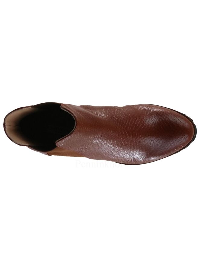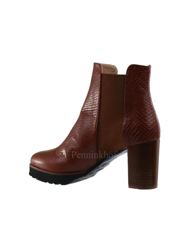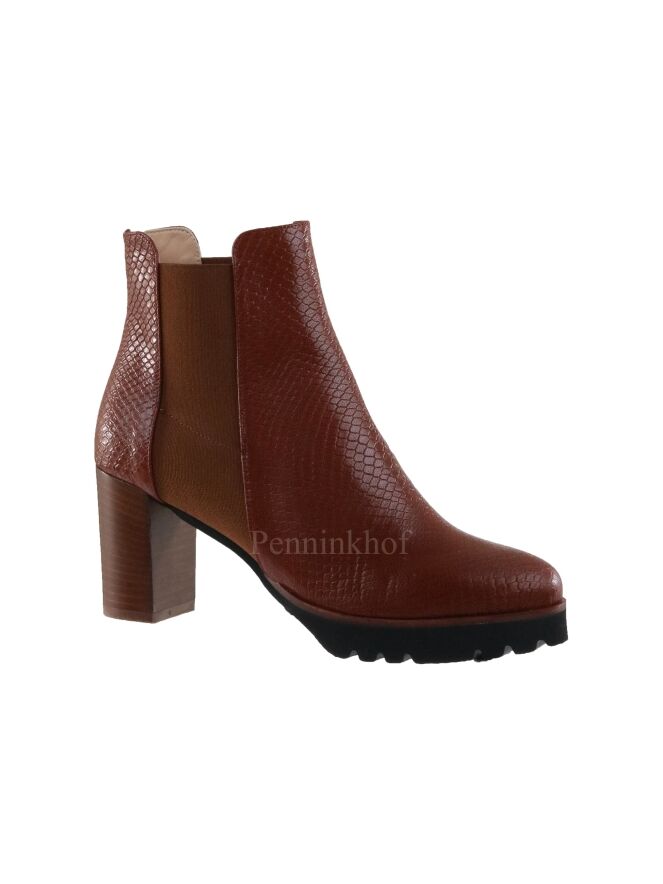 Een kort laarsje van Cervone in een reptiel structuur met de kleur cognac. Langs de zijkanten van de schacht is een elastieken stof. De gekartelde zool is in de kleur zwart. De binnenkant is met leder gevoerd.