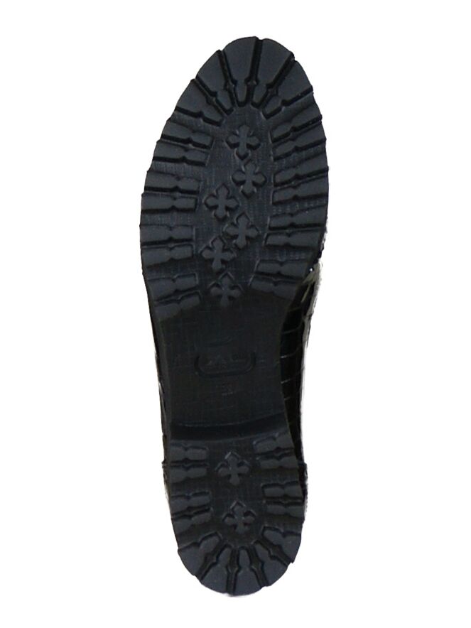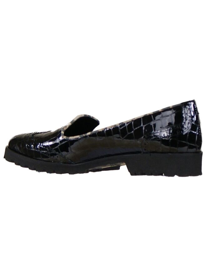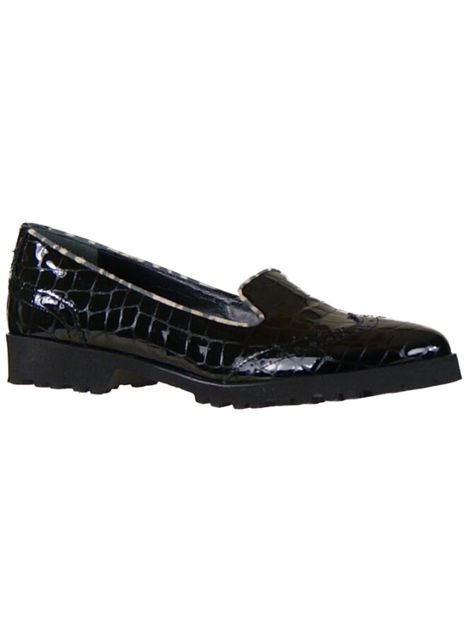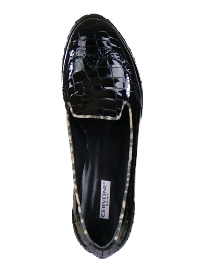 Een instapper van het merk Cervone in de kleur zwart. Het leder is in een croco print uitgevoerd en de neus is met een brooks randje afgewerkt. Dit detail komt terug op de hiel. Langs de rand van de schoen is in leder een biesjes met een panterprint verwerkt. De binnen zijde van de instapper is met leder gevoerd.