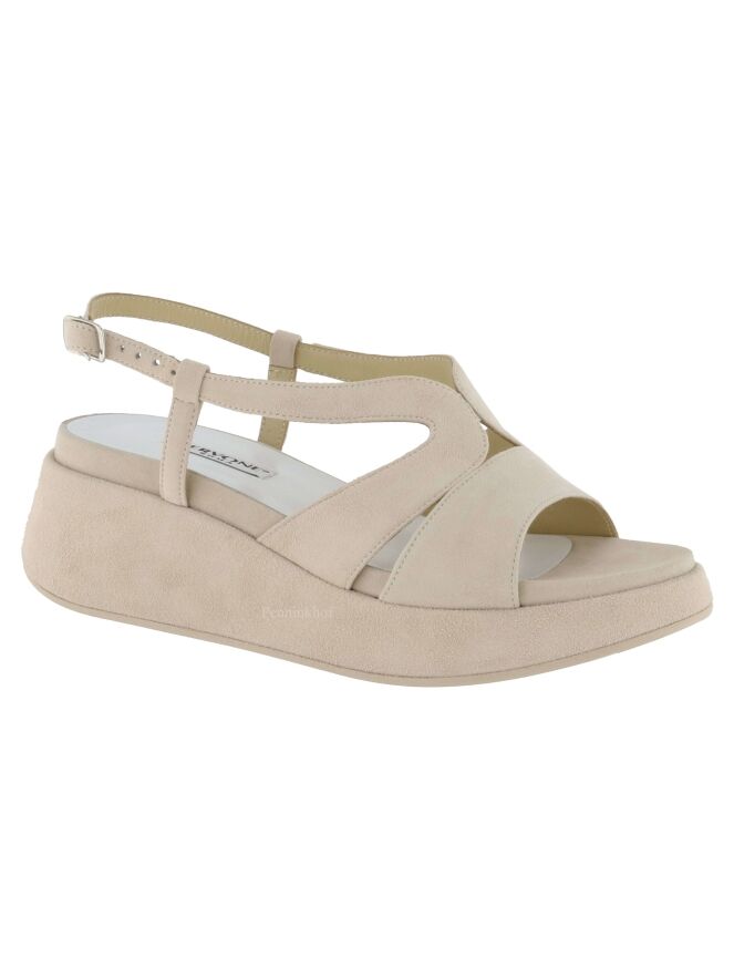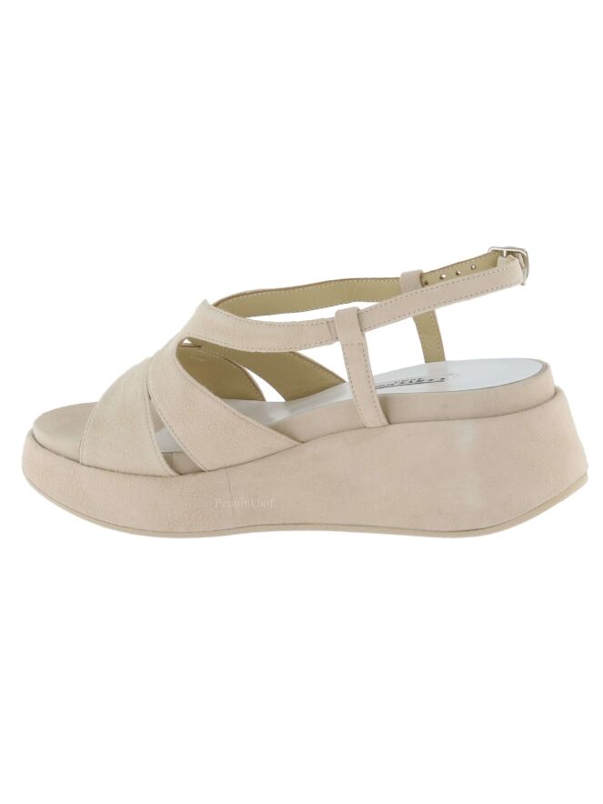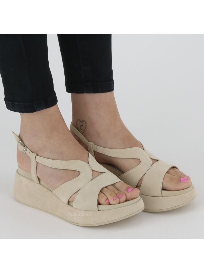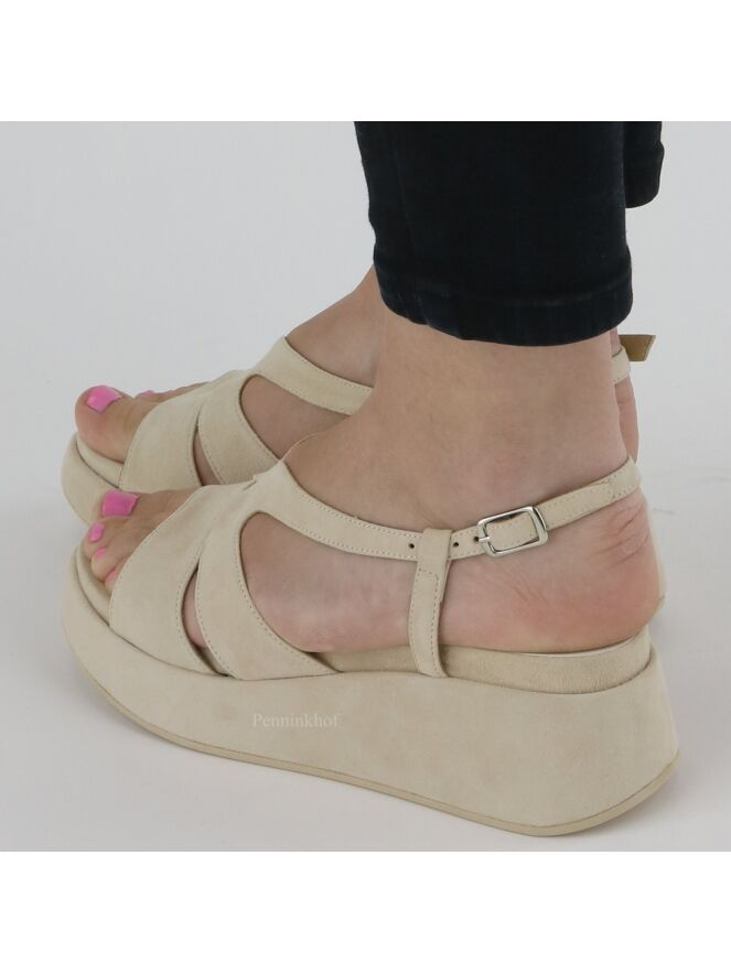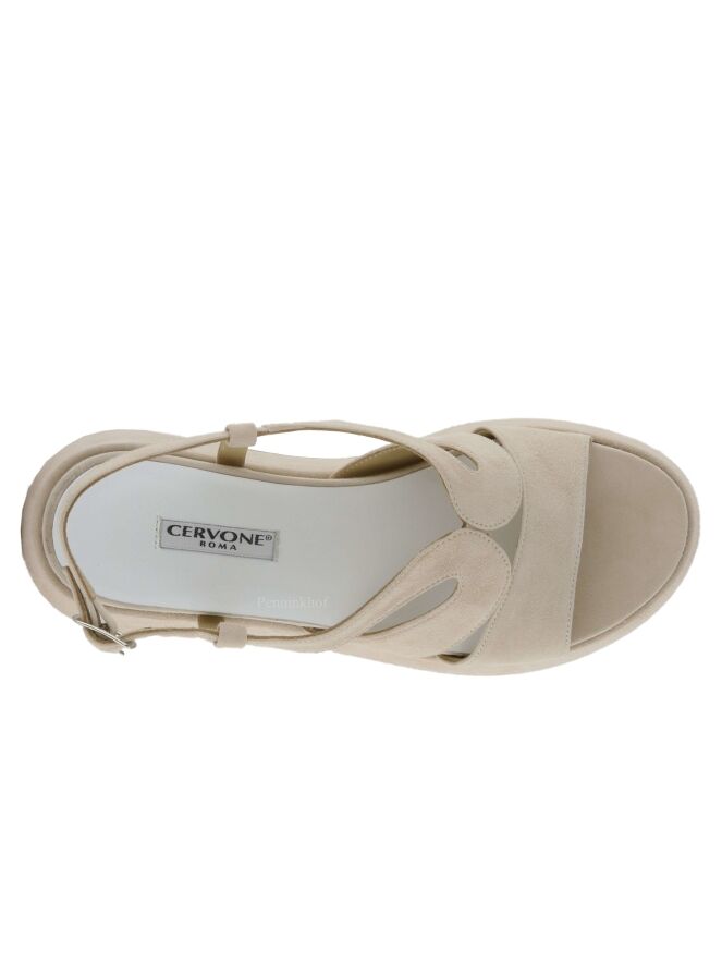 Een open sandaal van Cervone in de kleur nude. De sandaal heeft een open teen en het suède is als een brede band over de voorvoet. Het hielbandje is verstelbaar. De plateauzool is bekleed in hetzelfde materiaal als de sandaal.