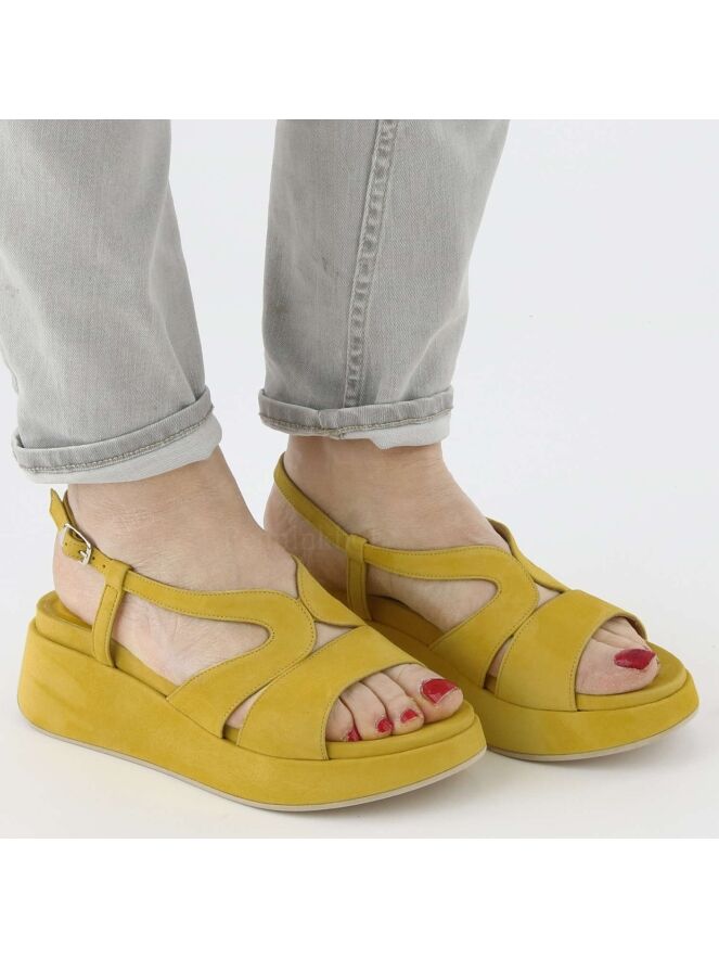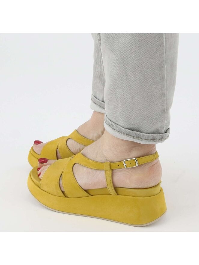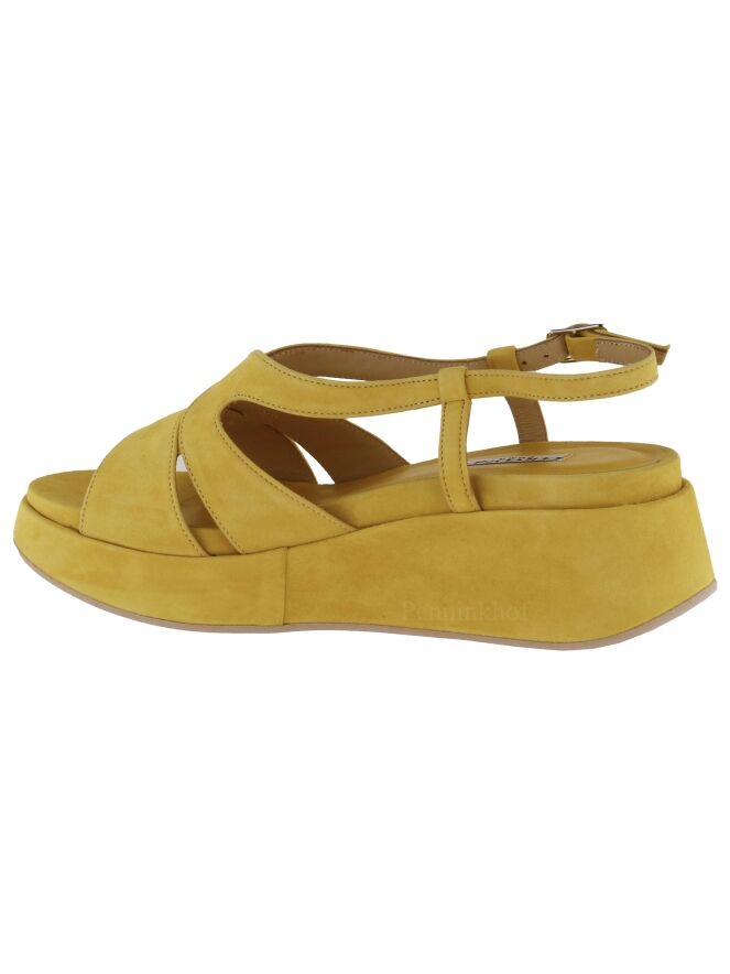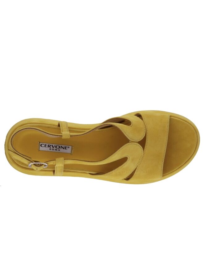 Een open sandaal van Cervone in de kleur geel. De sandaal heeft een open teen en het suède is als een brede band over de voorvoet. Het hielbandje is verstelbaar. De plateauzool is bekleed in hetzelfde materiaal als de sandaal.
